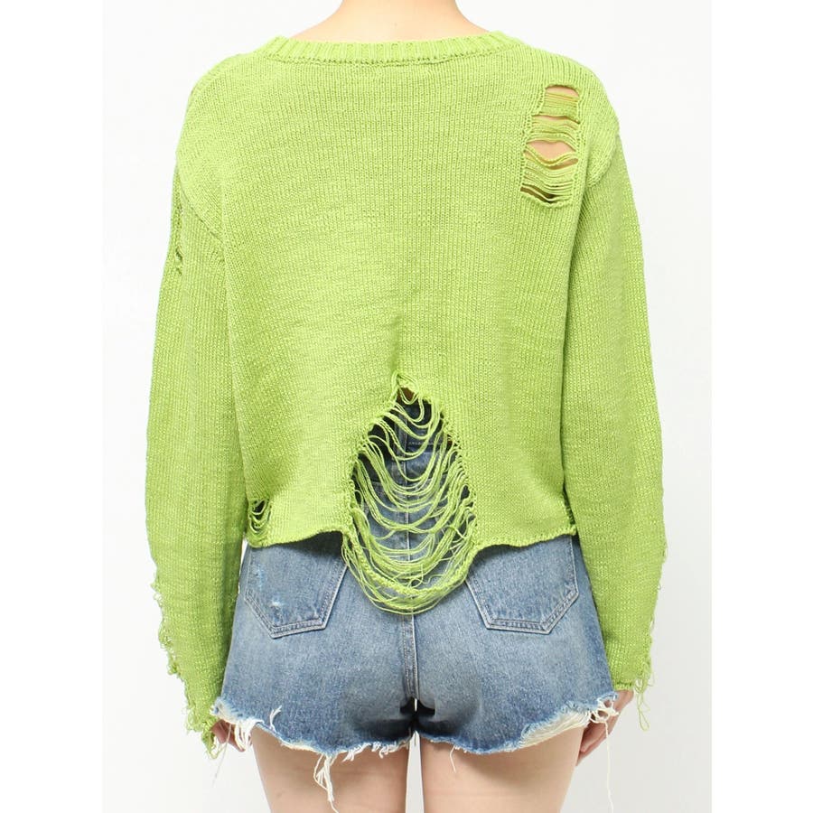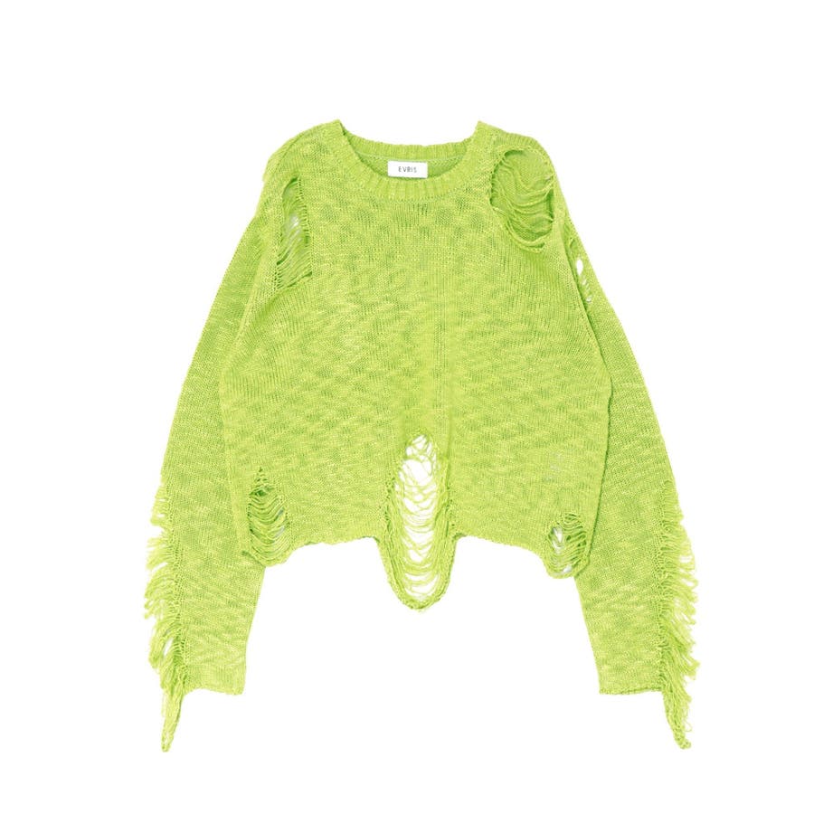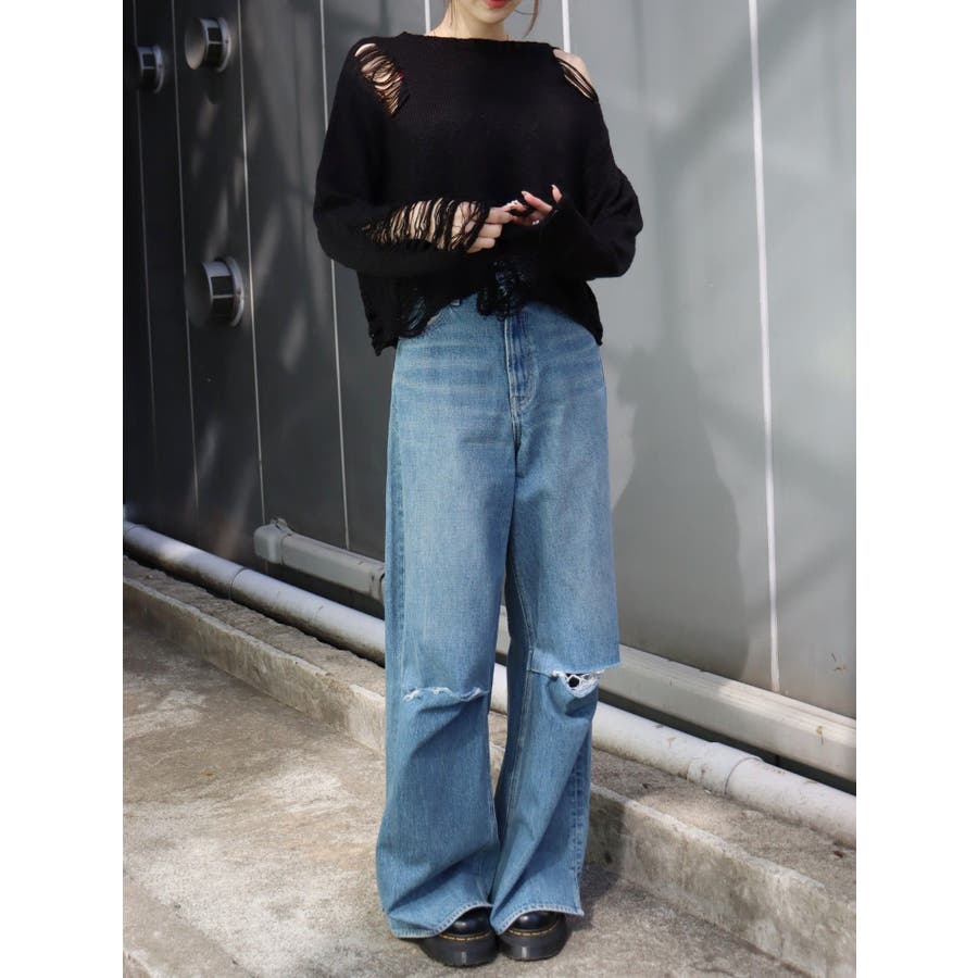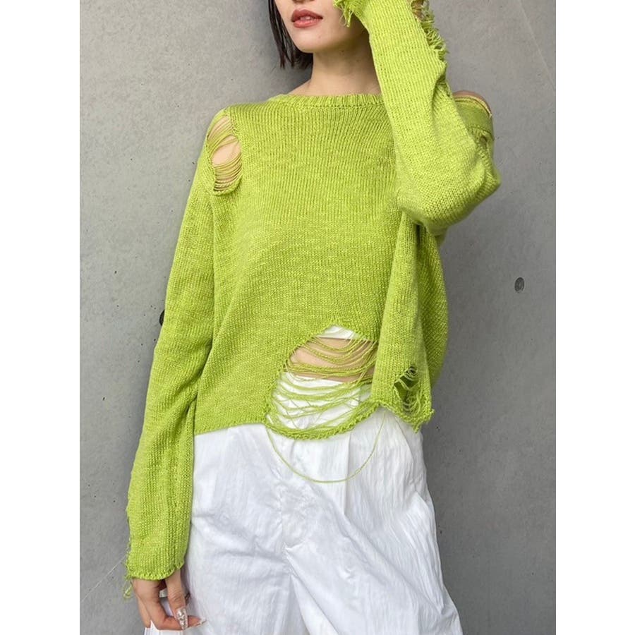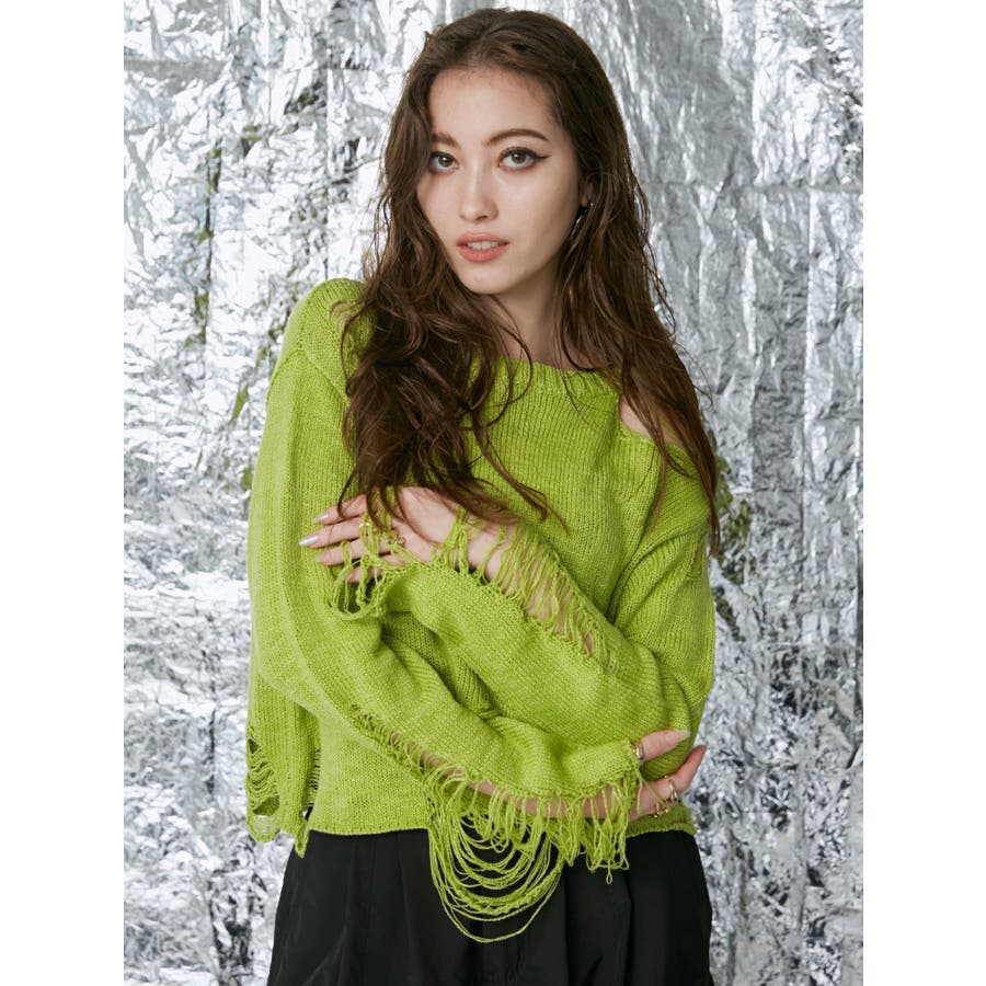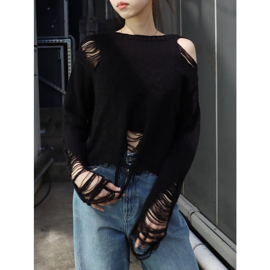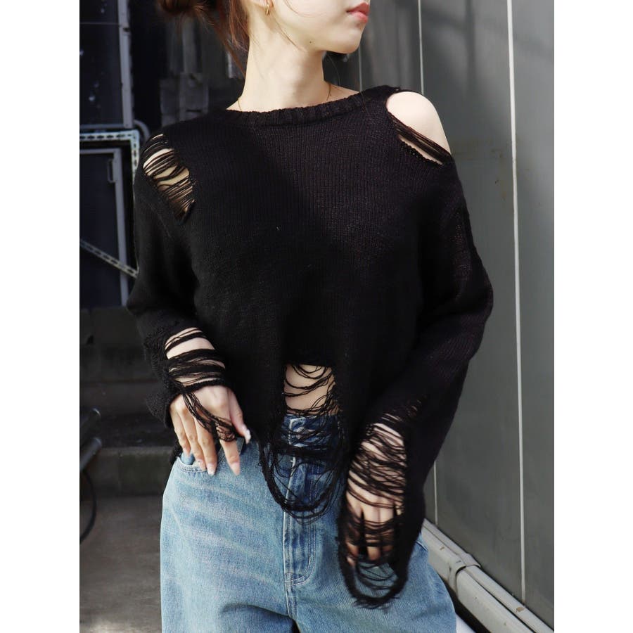 ■デザイン 昨年も大人気だった、全体的にダメージを施したニットトップスです。 エッジの効いた印象にするために、きつめにダメージが入っています。 ■スタイリング エッジのあるトップスにはシンプルなボトムやデニムがおすすめ。 ミニボトムでも雰囲気が出るのでコーデの幅が広がります。 ■おすすめスタイリングアイテム >>パラシュートパンツ-------------- 透け感:あり 裏地:なし 生地の厚み:普通 伸縮性:あり --------------