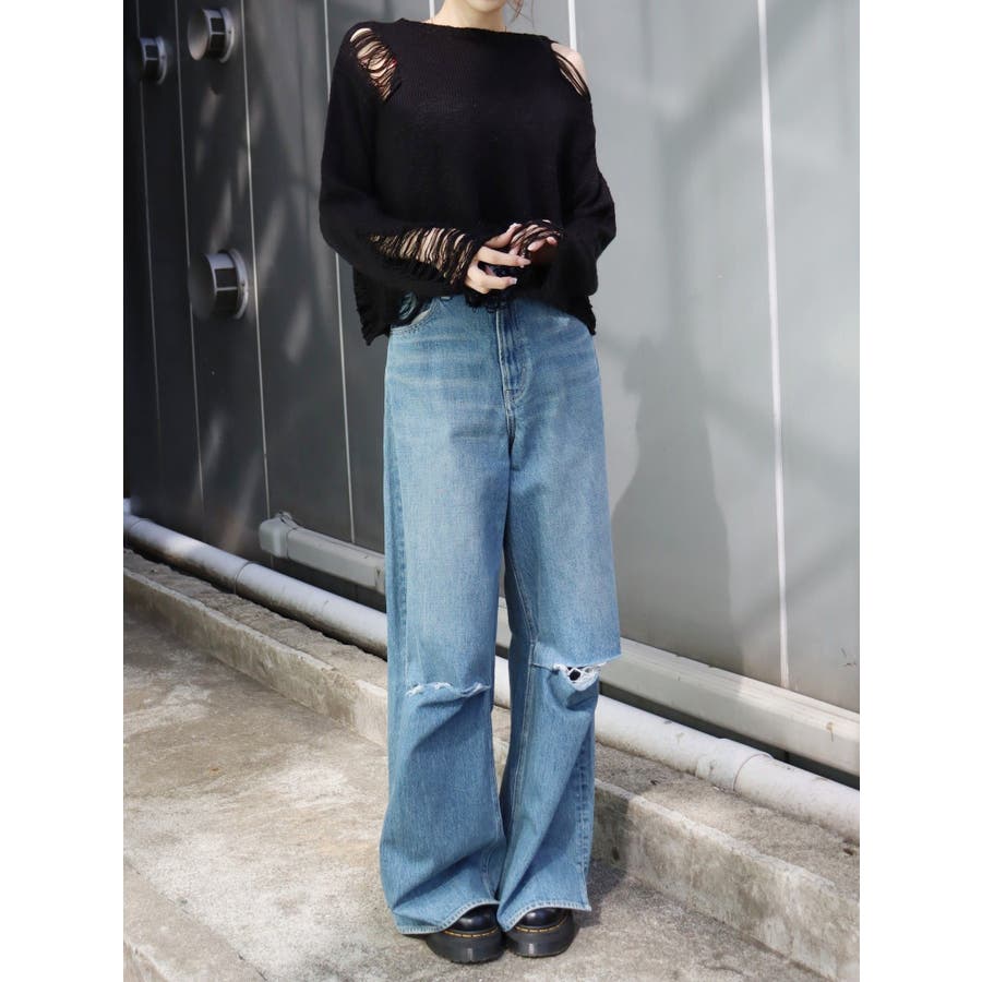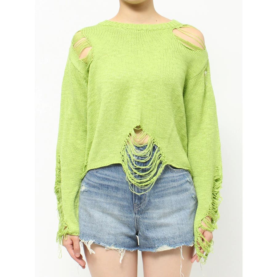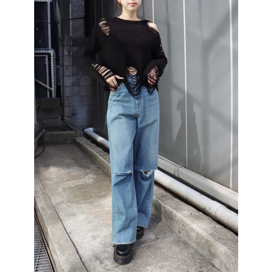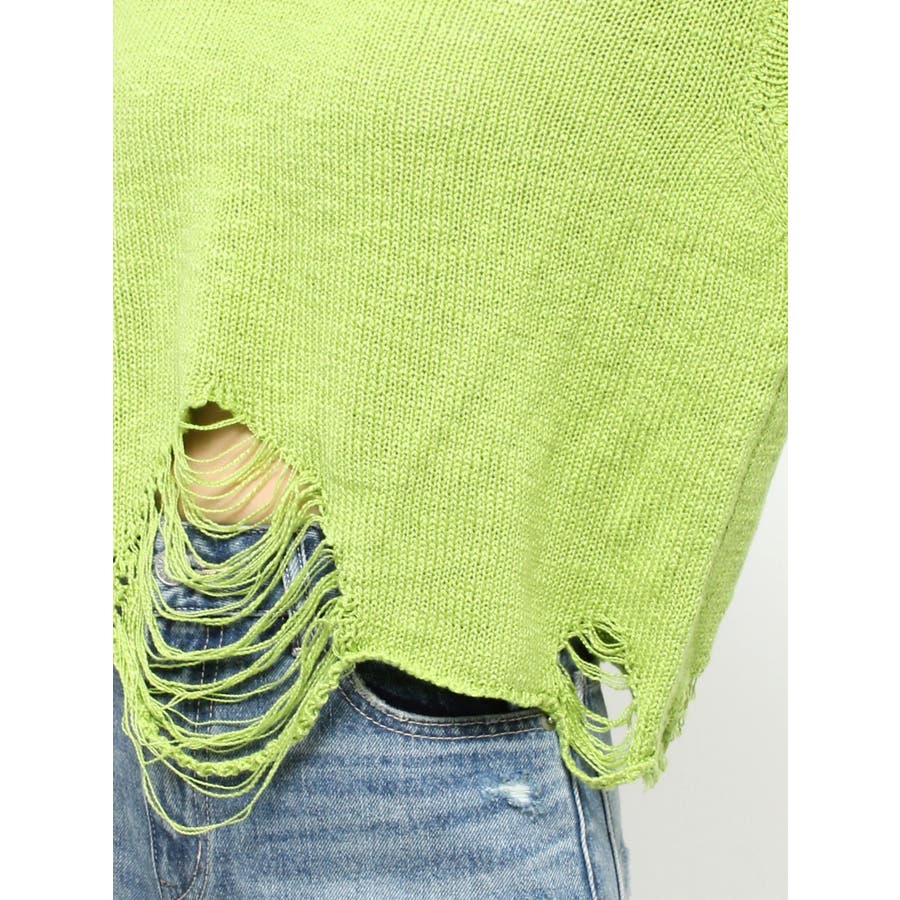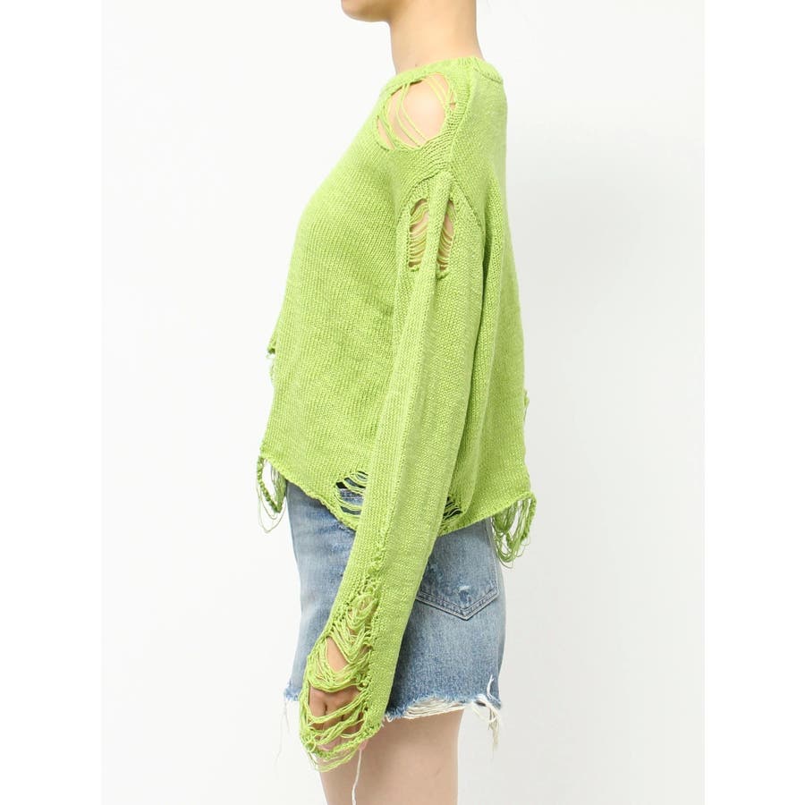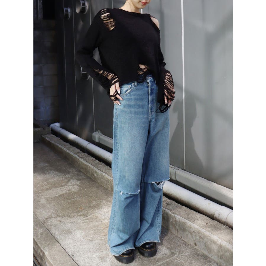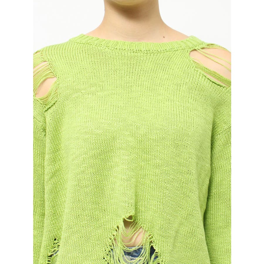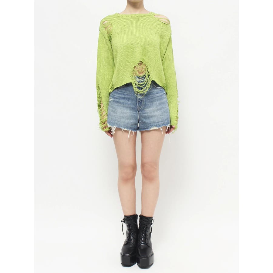 ■デザイン 昨年も大人気だった、全体的にダメージを施したニットトップスです。 エッジの効いた印象にするために、きつめにダメージが入っています。 ■スタイリング エッジのあるトップスにはシンプルなボトムやデニムがおすすめ。 ミニボトムでも雰囲気が出るのでコーデの幅が広がります。 ■おすすめスタイリングアイテム >>パラシュートパンツ-------------- 透け感:あり 裏地:なし 生地の厚み:普通 伸縮性:あり --------------