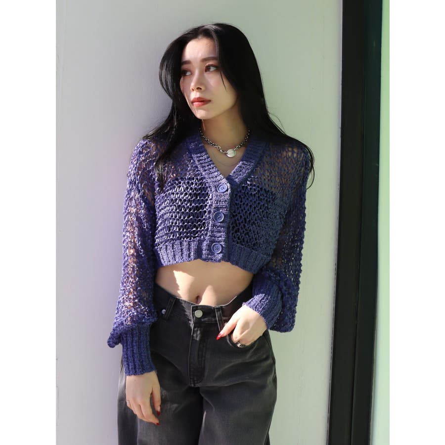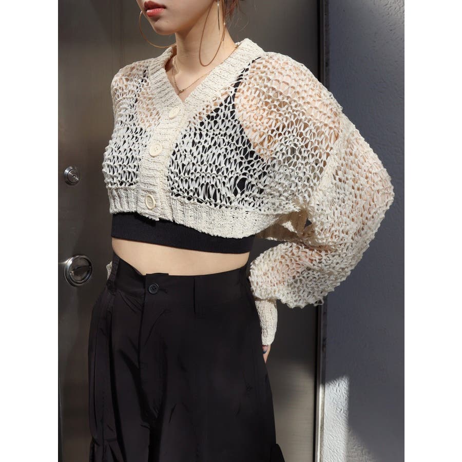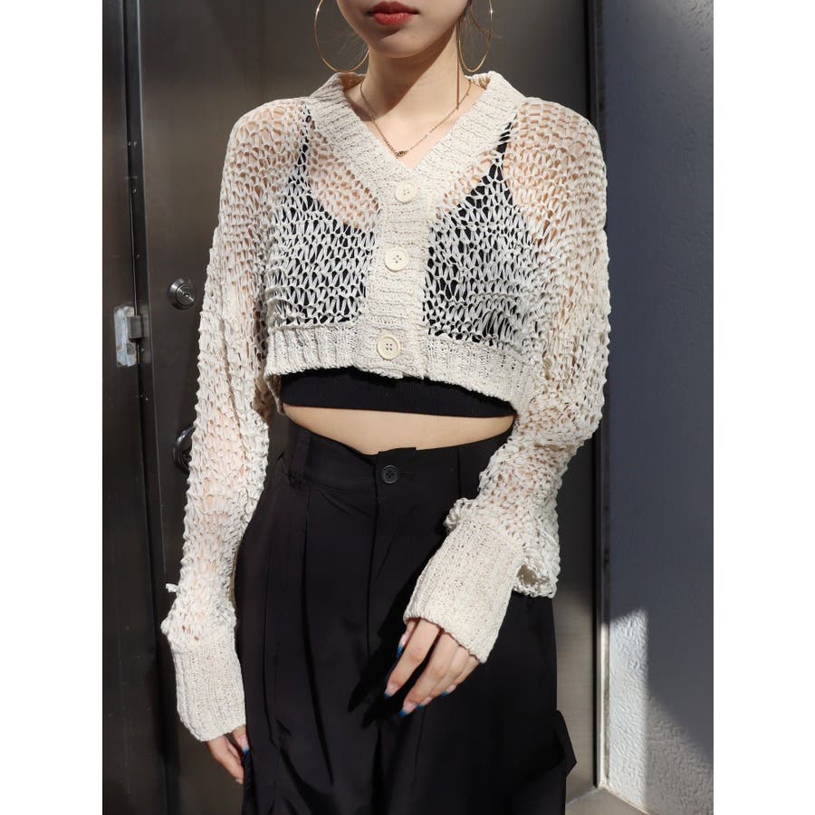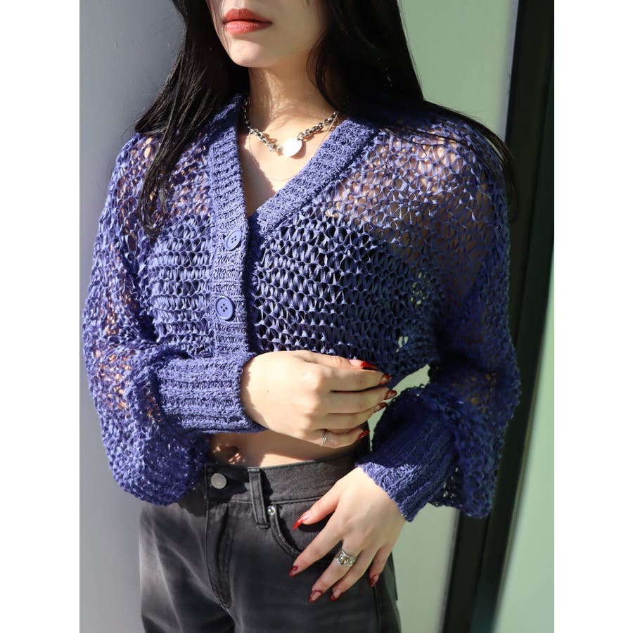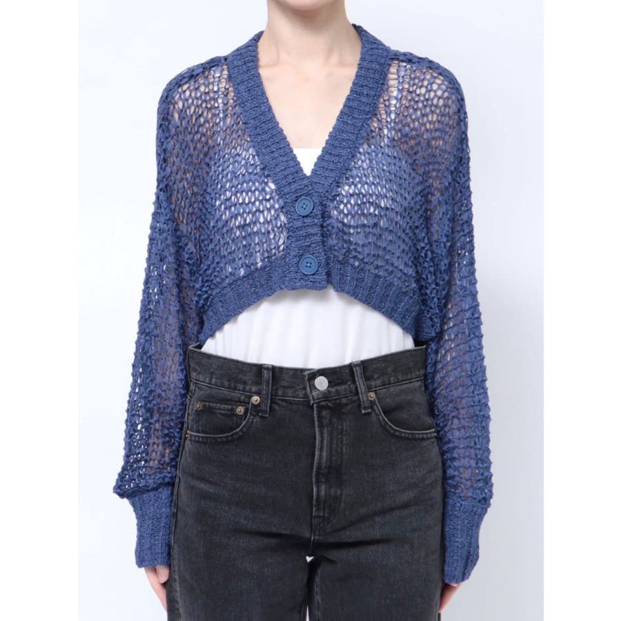 【デザイン】太めのテープヤーンを緩めに編んだニットカーディガンです。透け感のある編地は春から夏まで着用していただけるデザインです。ショート丈でどんなボトムにも合わせやすいデザインとなっています。折りたたむと小さくまとまり、太めのテープヤーンでしわも気にならないニットなので夏の羽織りとして持ち運びもしやすいです。【コーディネート】キャミソールやタンクトップの上からさらっと羽織れます。ショート丈なのでトレンドのワイドボトムと合わせるとスタイルアップ◎Vネックなのでデコルテも綺麗に見えてバランスがとりやすいです。キャミワンピースなどと合わせても◎サマーニット 夏カーディガン ショート丈 クロップド丈 シアー 透けカーディガン