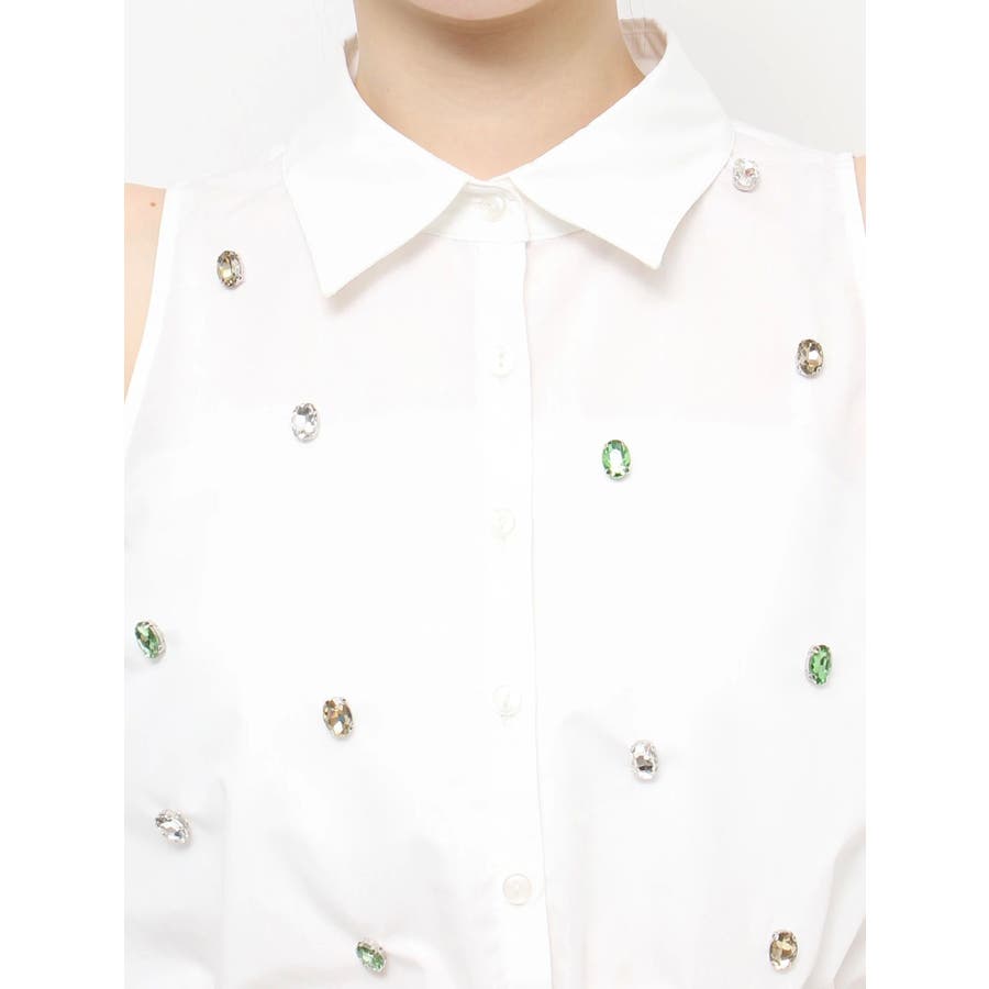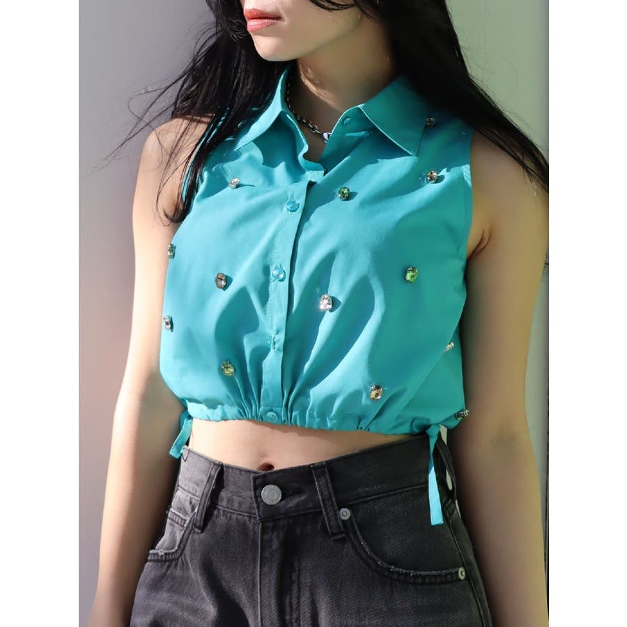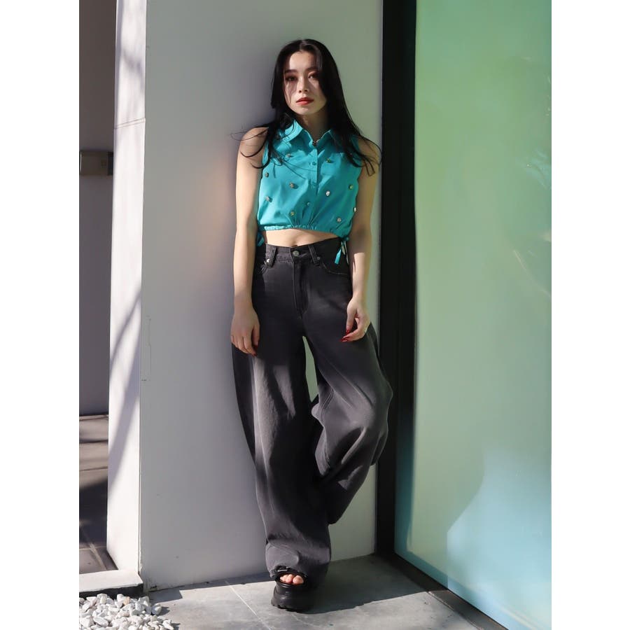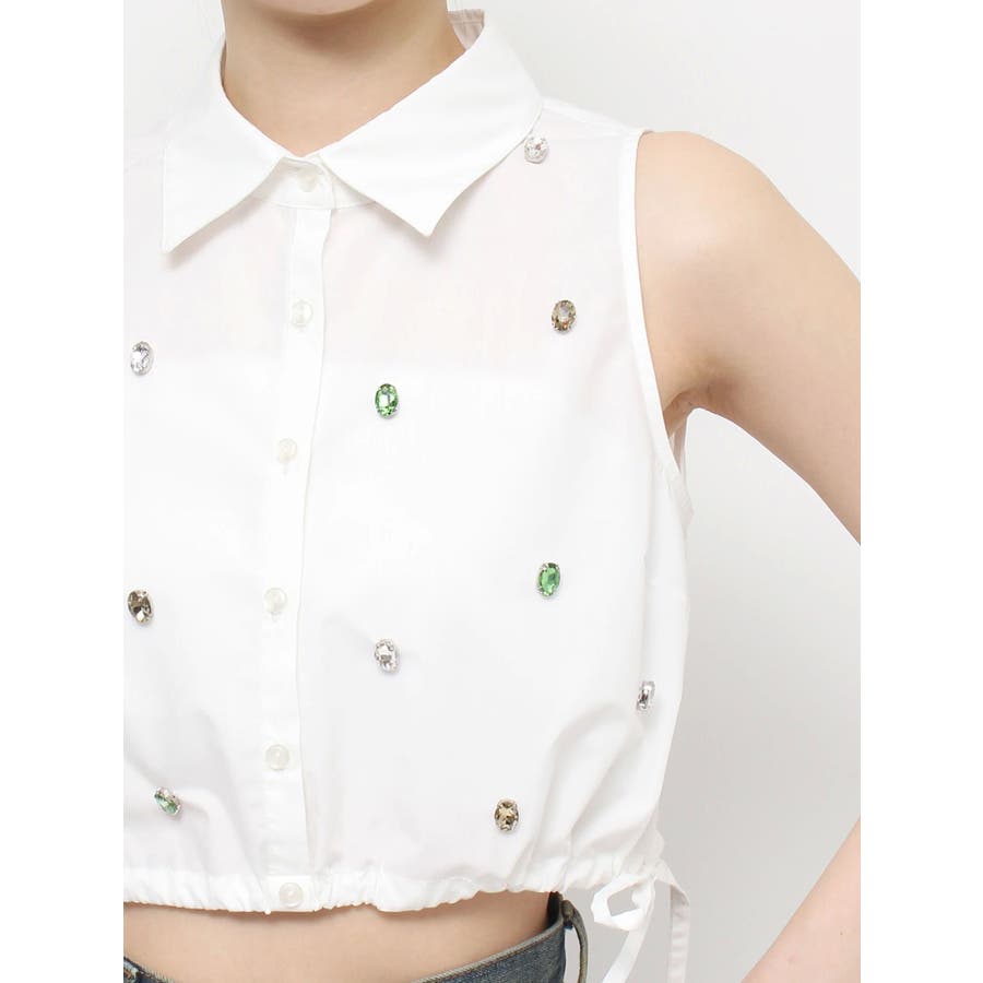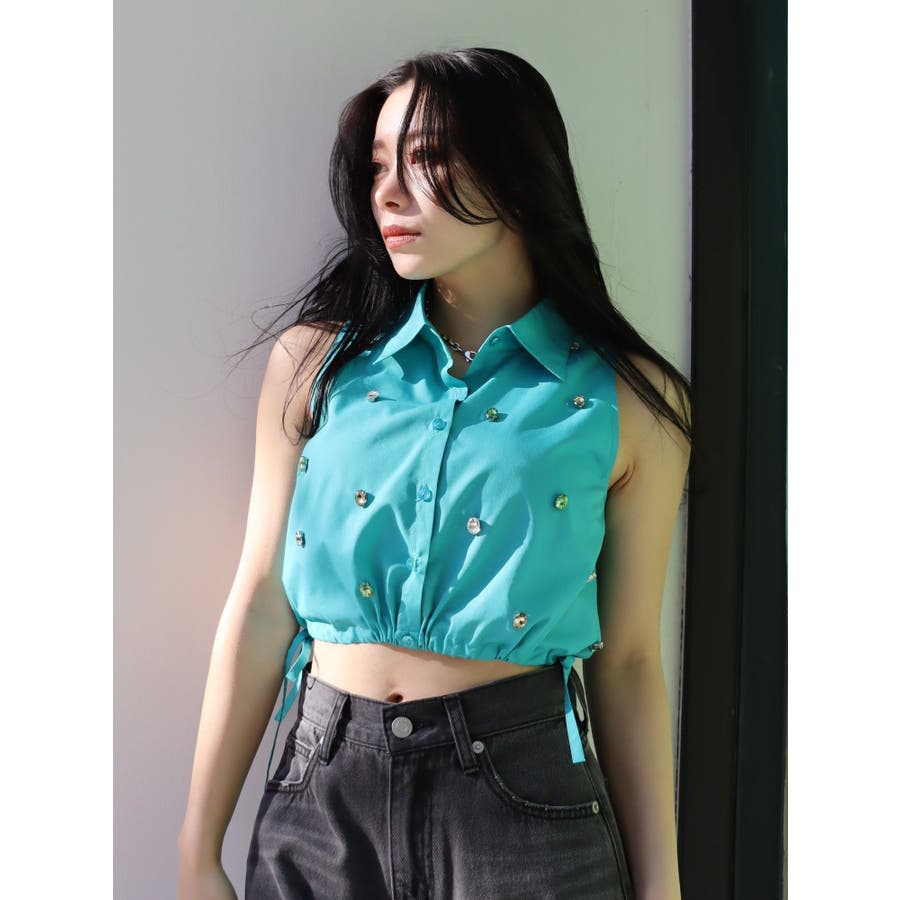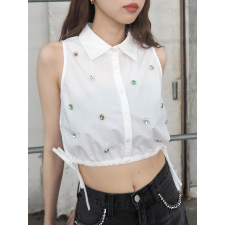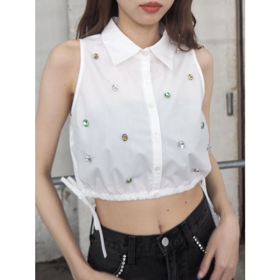 今季EVRIS(エヴリス)のコンセプトモチーフのビジューを使用したシャツです。カラフルなビジューを使用しておりコーデを華やかな印象にしてくれます。裾にゴムを入れており絞れる仕様なので、様々なシルエットを楽しめるトップスです。