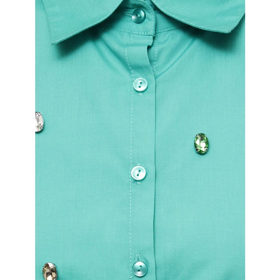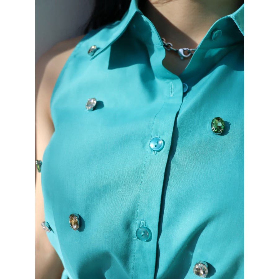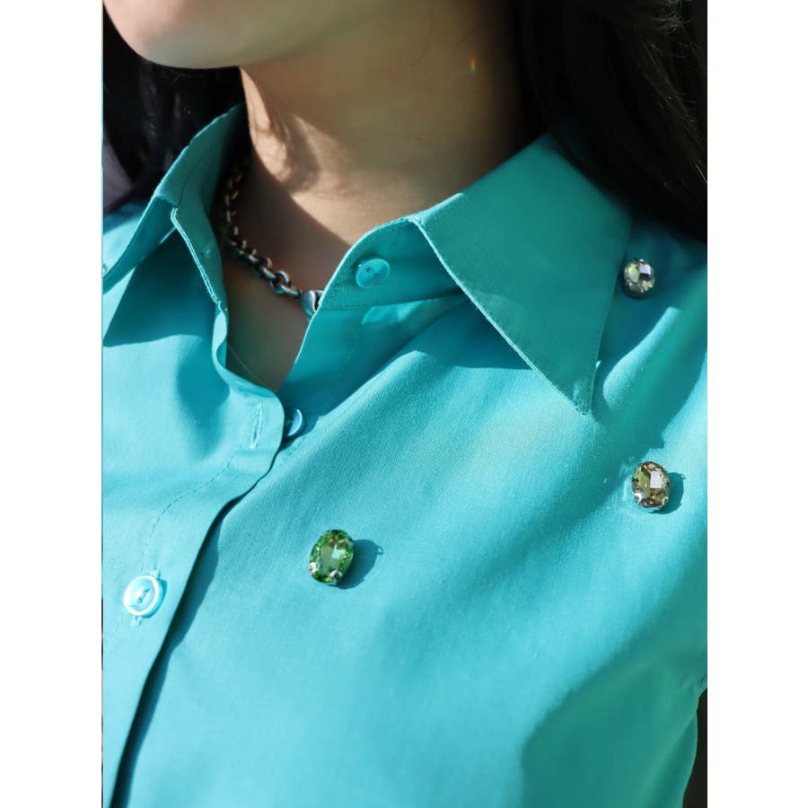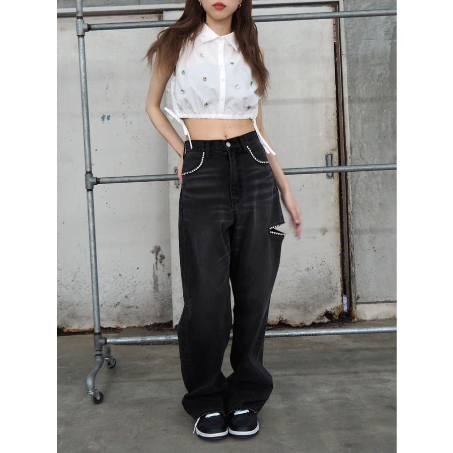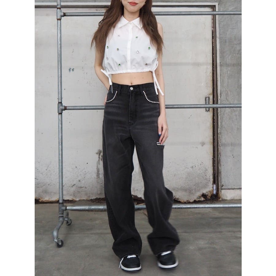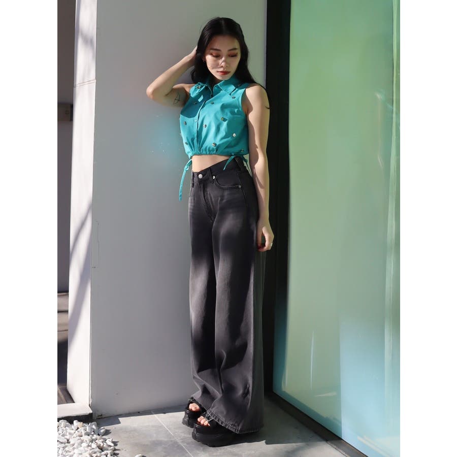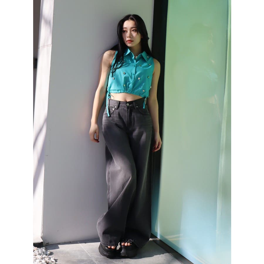 今季EVRIS(エヴリス)のコンセプトモチーフのビジューを使用したシャツです。カラフルなビジューを使用しておりコーデを華やかな印象にしてくれます。裾にゴムを入れており絞れる仕様なので、様々なシルエットを楽しめるトップスです。