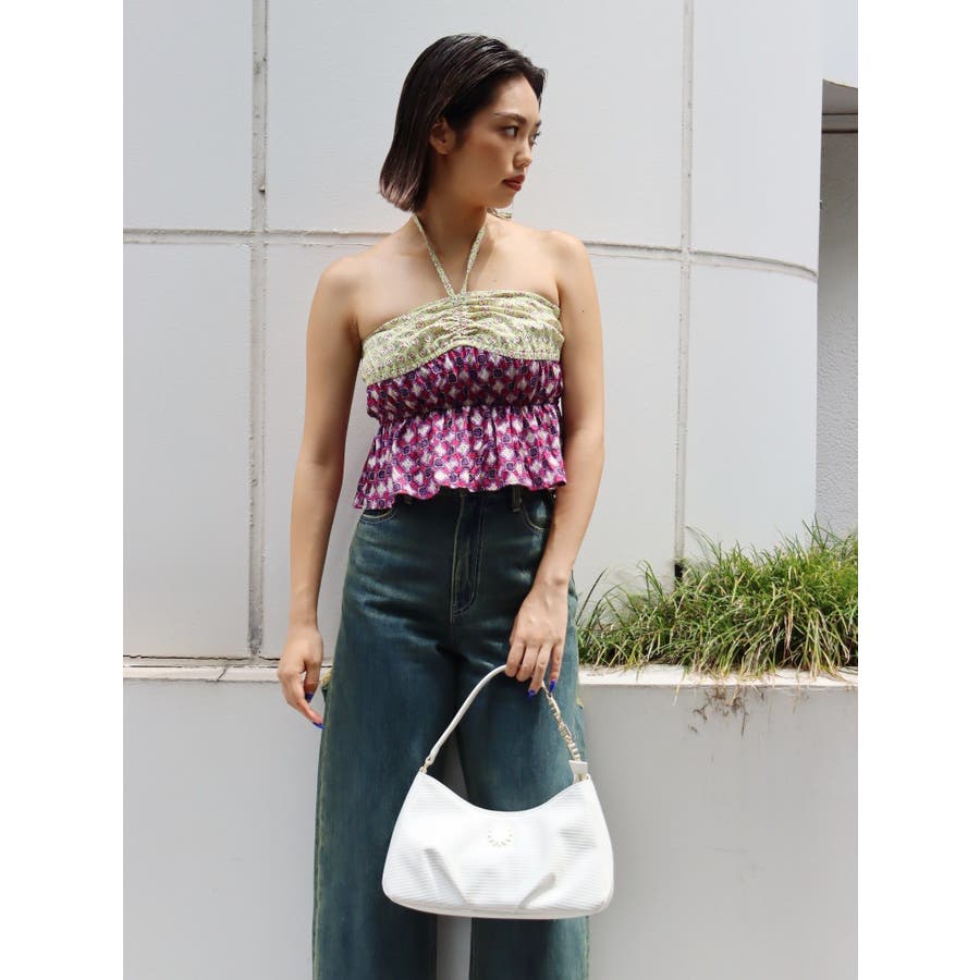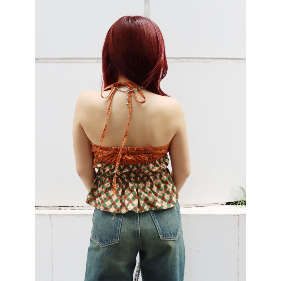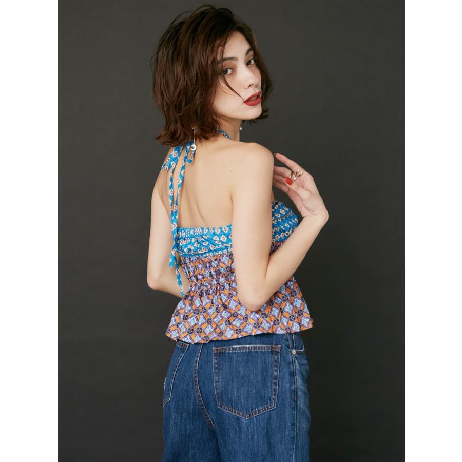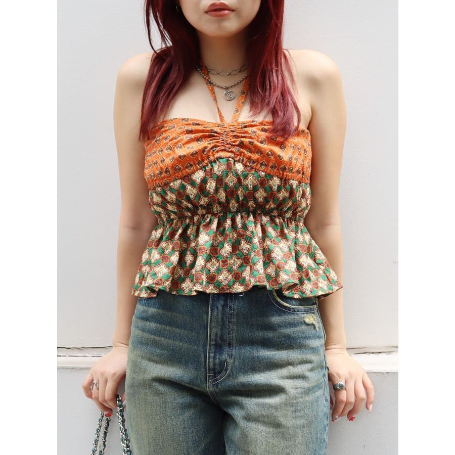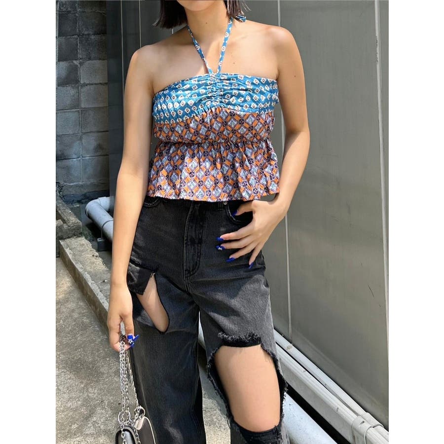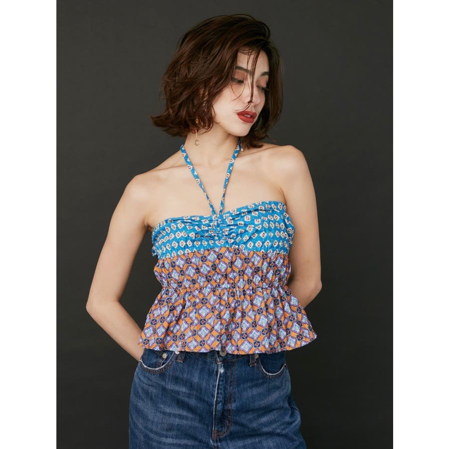 ■デザインEVRIS(エヴリス)オリジナル柄をプリントしたベアトップです。ホルターネックの紐をバスト部分でリボン結びで止める着用の仕方もオススメです。バスト部分はゴム仕様になっており着脱も楽ちん。インナーにコンパクトなTシャツをレイヤードするスタイリングなど、様々なスタイリングを楽しめるアイテムです。■スタイリング夏らしいデニム合わせがおすすめです。首元に視線を集めるホルターネックは、ミニボトムと合わせたときのバランス感も◎-------------- 透け感:なし 裏地:なし 生地の厚み:薄手伸縮性:なし --------------夏服 夏トップス キャミソール ベアトップ ホルターネック クロップド丈 ショート丈