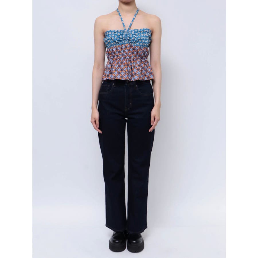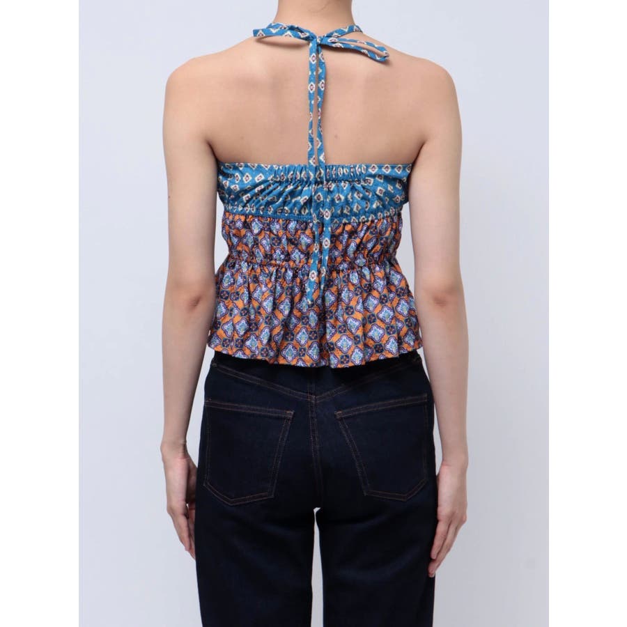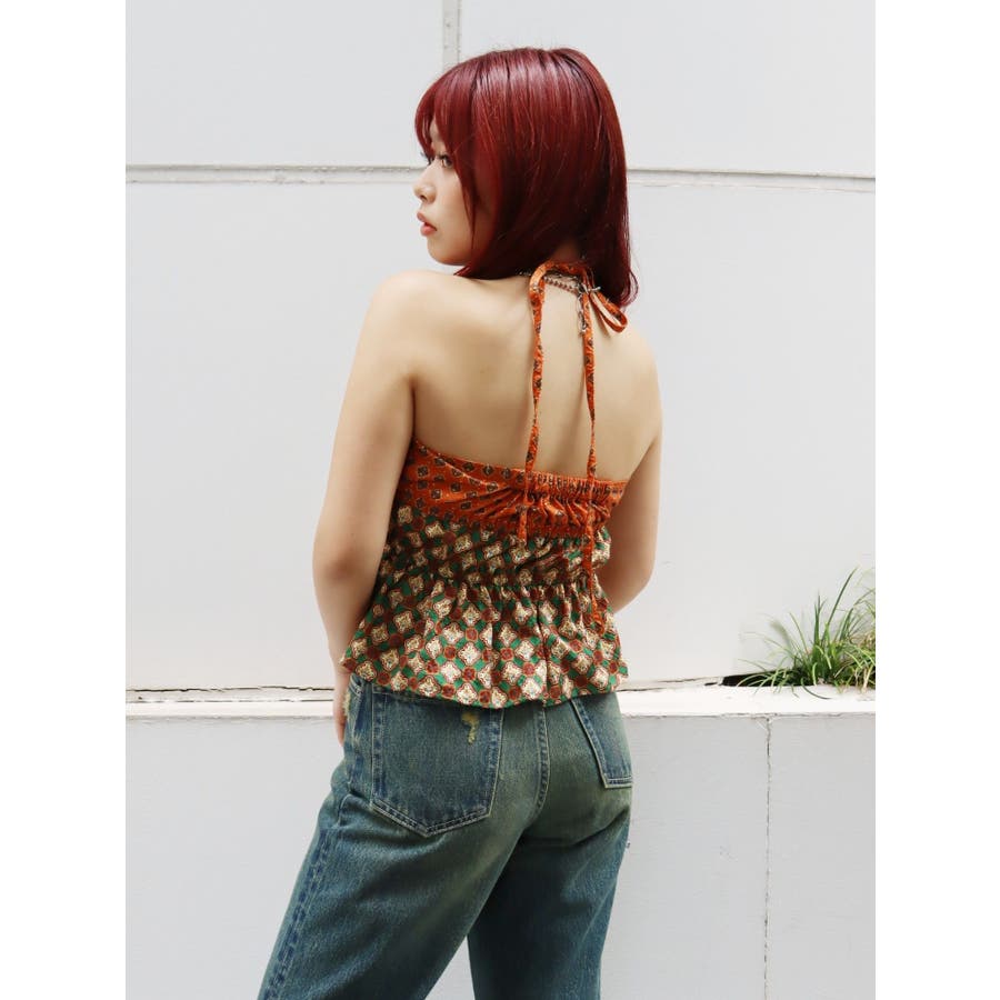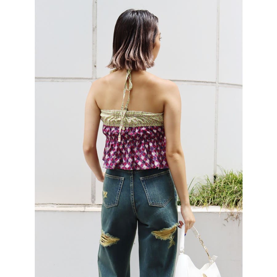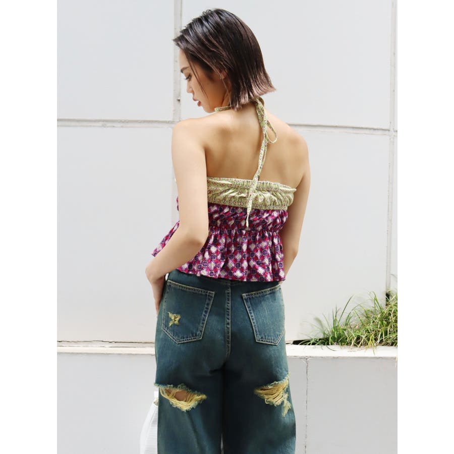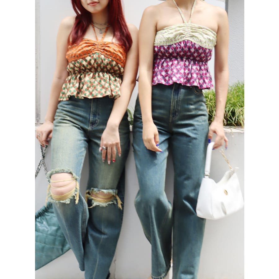 ■デザインEVRIS(エヴリス)オリジナル柄をプリントしたベアトップです。ホルターネックの紐をバスト部分でリボン結びで止める着用の仕方もオススメです。バスト部分はゴム仕様になっており着脱も楽ちん。インナーにコンパクトなTシャツをレイヤードするスタイリングなど、様々なスタイリングを楽しめるアイテムです。■スタイリング夏らしいデニム合わせがおすすめです。首元に視線を集めるホルターネックは、ミニボトムと合わせたときのバランス感も◎-------------- 透け感:なし 裏地:なし 生地の厚み:薄手伸縮性:なし --------------夏服 夏トップス キャミソール ベアトップ ホルターネック クロップド丈 ショート丈