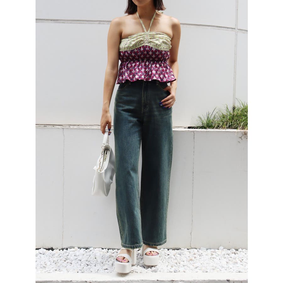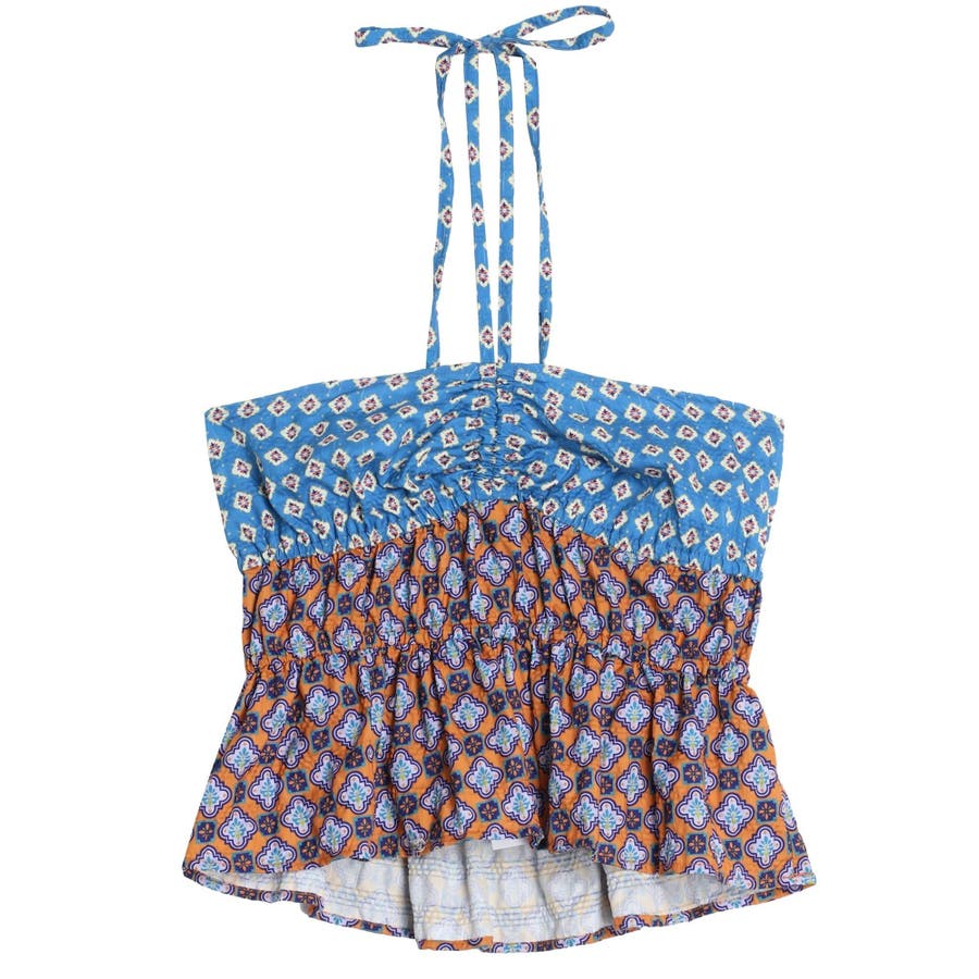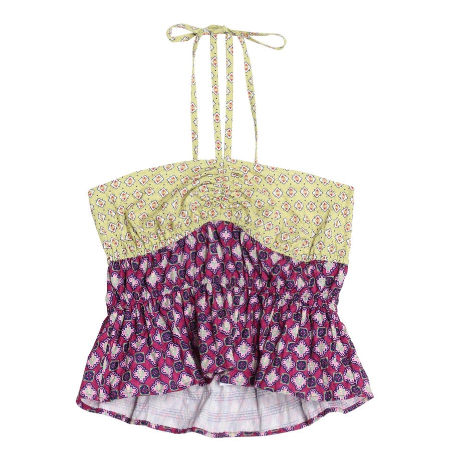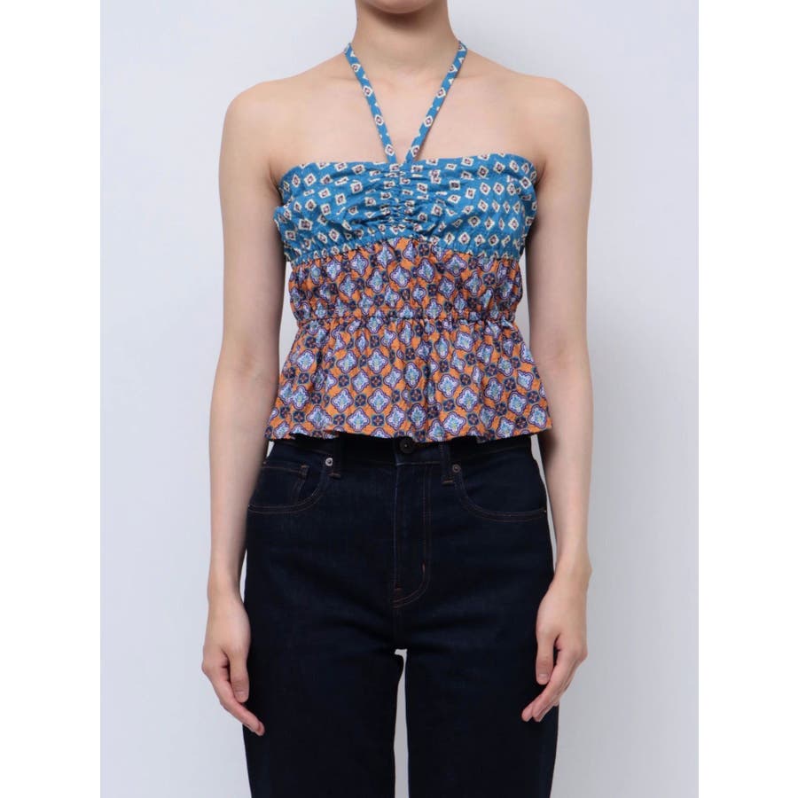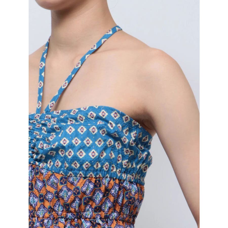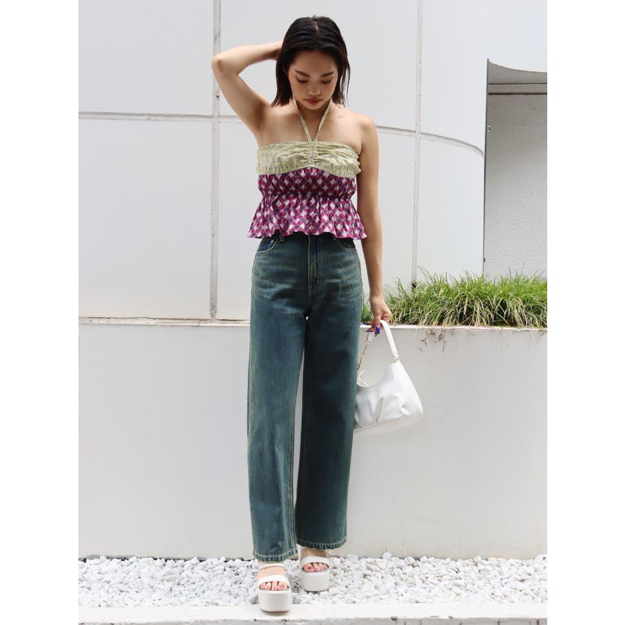 ■デザインEVRIS(エヴリス)オリジナル柄をプリントしたベアトップです。ホルターネックの紐をバスト部分でリボン結びで止める着用の仕方もオススメです。バスト部分はゴム仕様になっており着脱も楽ちん。インナーにコンパクトなTシャツをレイヤードするスタイリングなど、様々なスタイリングを楽しめるアイテムです。■スタイリング夏らしいデニム合わせがおすすめです。首元に視線を集めるホルターネックは、ミニボトムと合わせたときのバランス感も◎-------------- 透け感:なし 裏地:なし 生地の厚み:薄手伸縮性:なし --------------夏服 夏トップス キャミソール ベアトップ ホルターネック クロップド丈 ショート丈