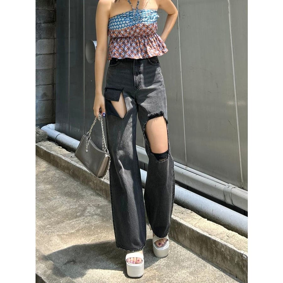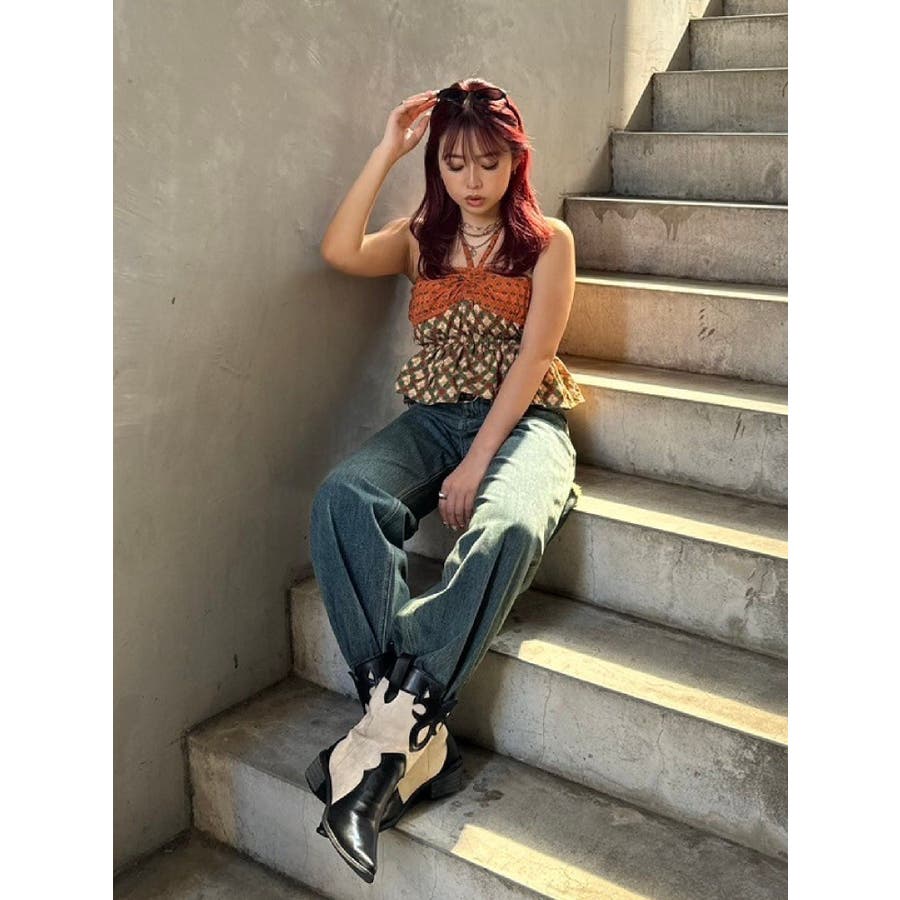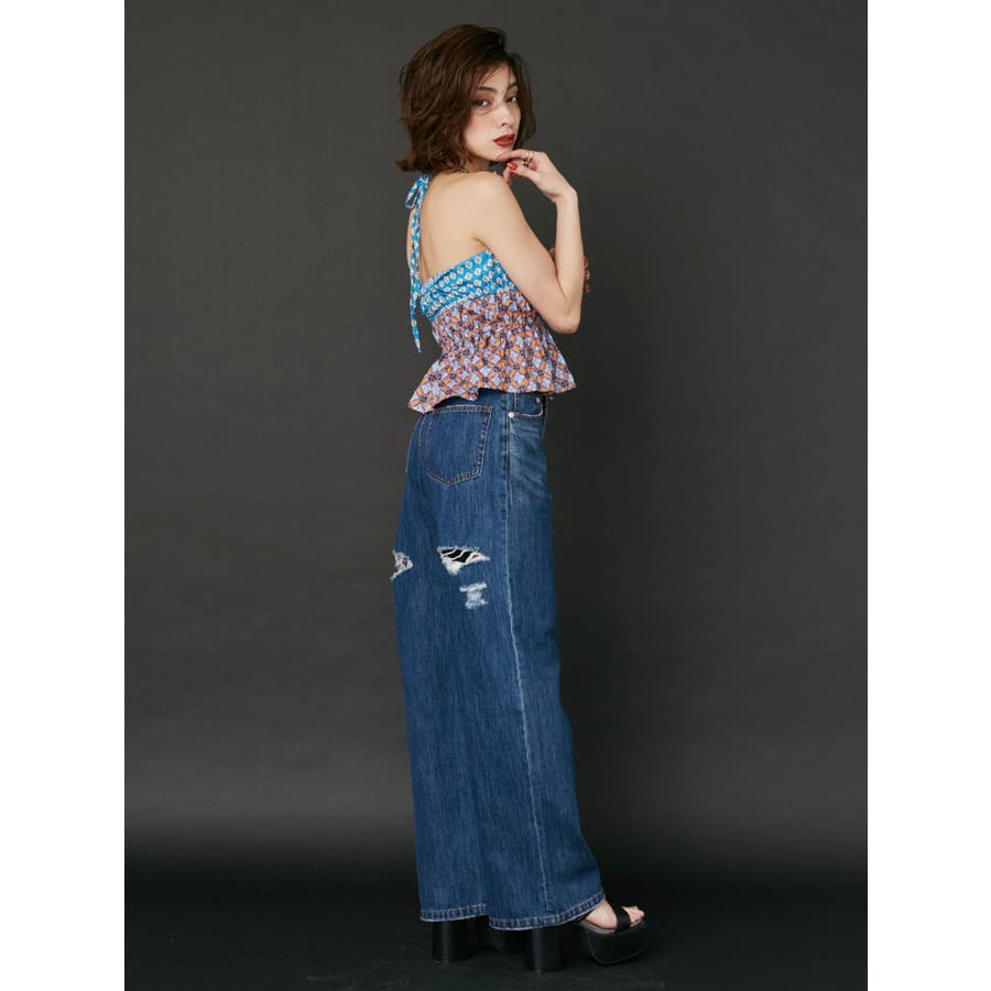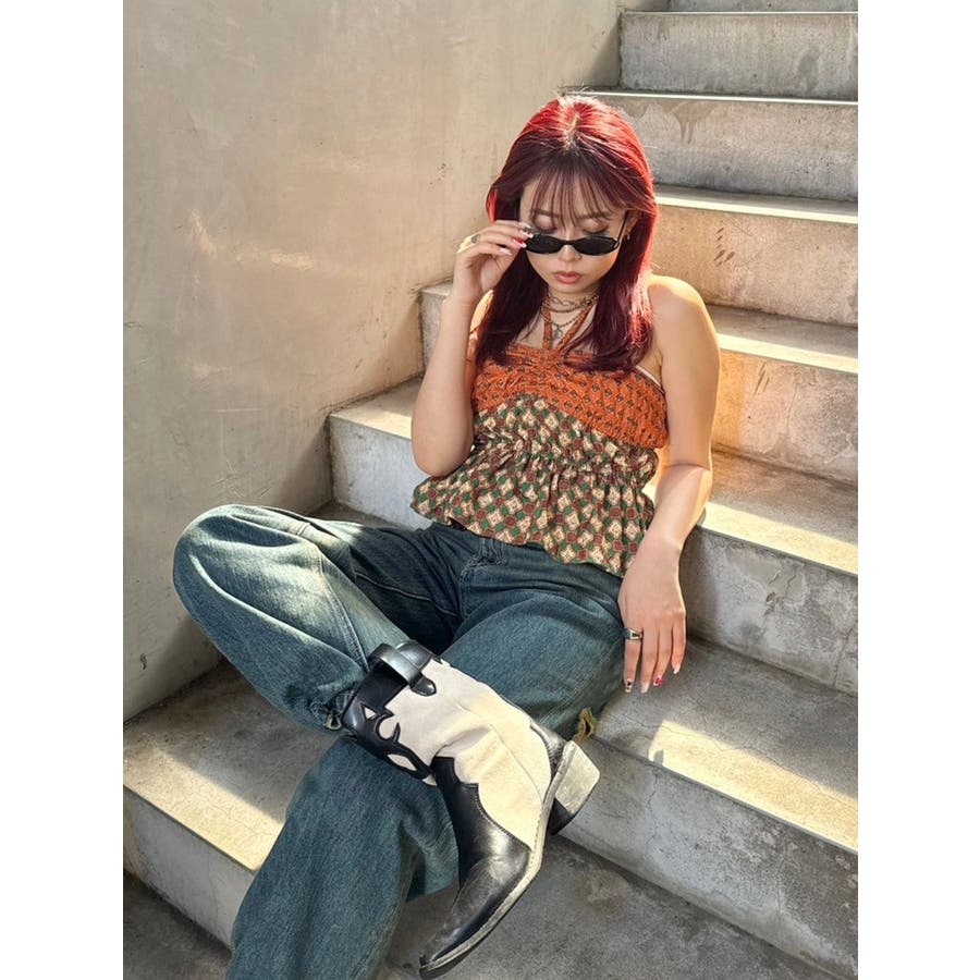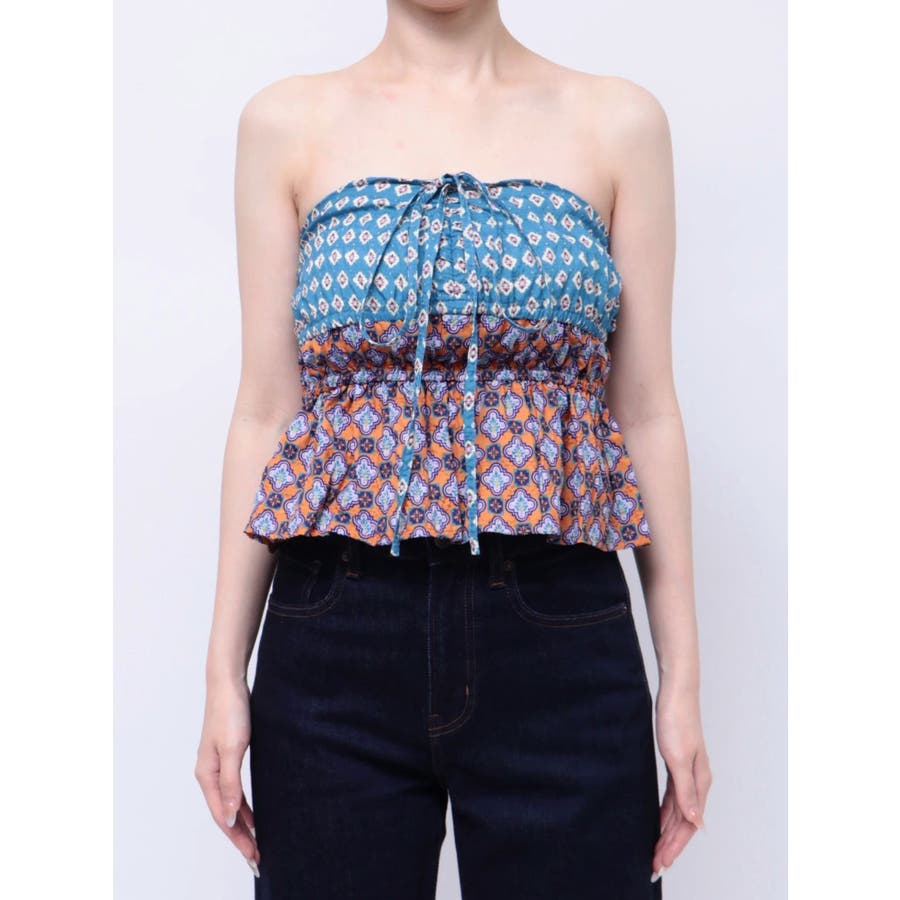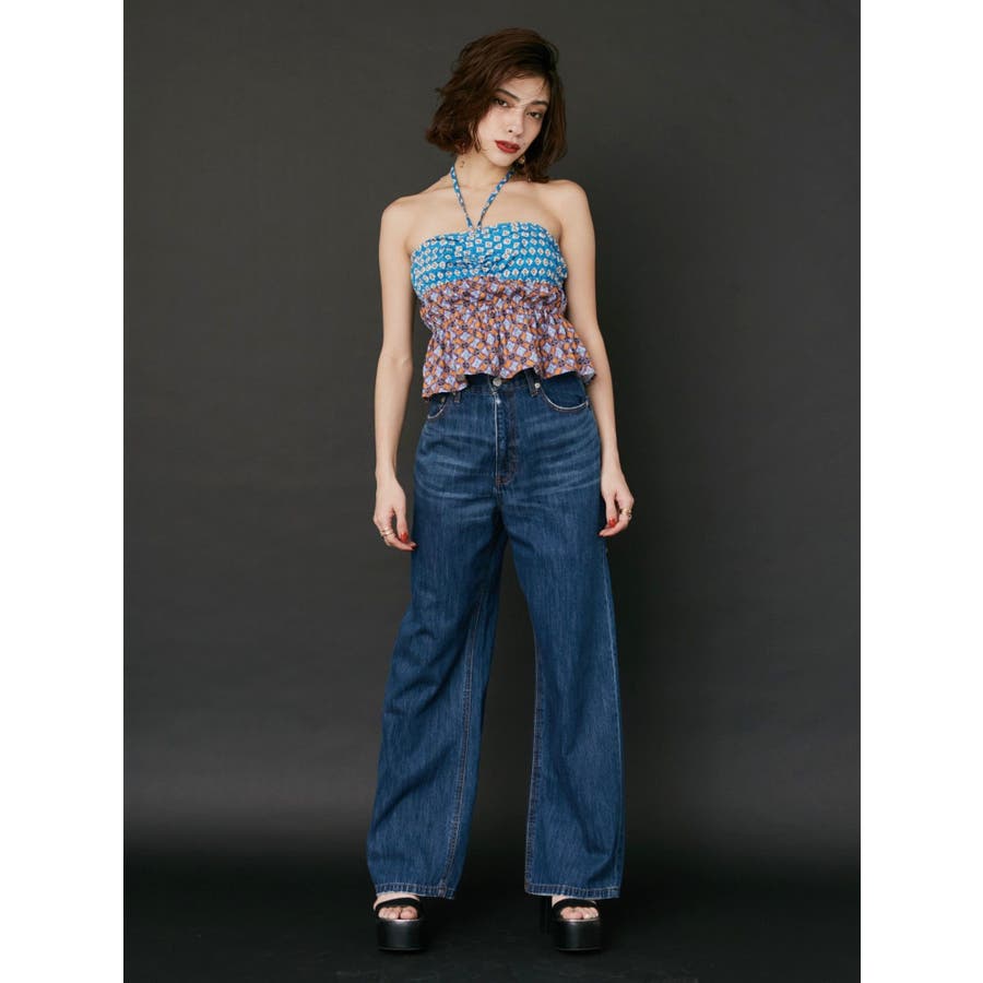 ■デザインEVRIS(エヴリス)オリジナル柄をプリントしたベアトップです。ホルターネックの紐をバスト部分でリボン結びで止める着用の仕方もオススメです。バスト部分はゴム仕様になっており着脱も楽ちん。インナーにコンパクトなTシャツをレイヤードするスタイリングなど、様々なスタイリングを楽しめるアイテムです。■スタイリング夏らしいデニム合わせがおすすめです。首元に視線を集めるホルターネックは、ミニボトムと合わせたときのバランス感も◎-------------- 透け感:なし 裏地:なし 生地の厚み:薄手伸縮性:なし --------------夏服 夏トップス キャミソール ベアトップ ホルターネック クロップド丈 ショート丈