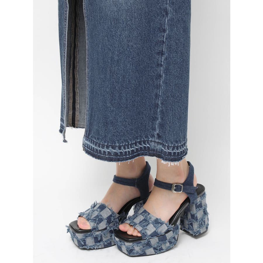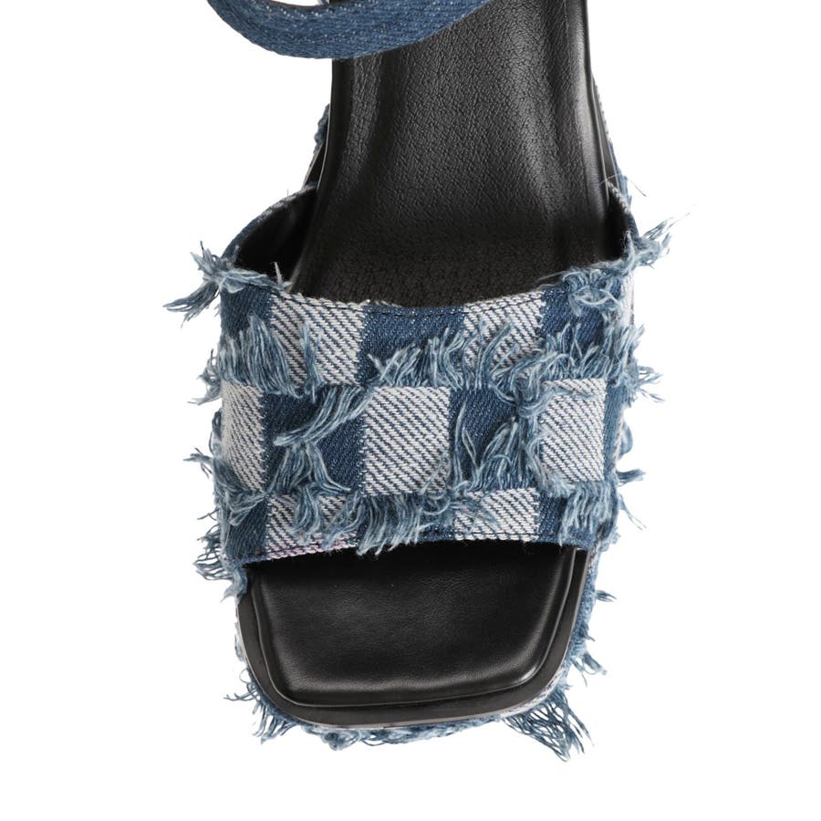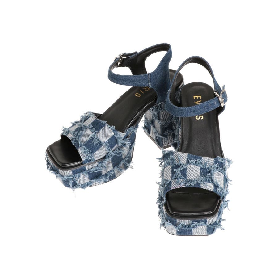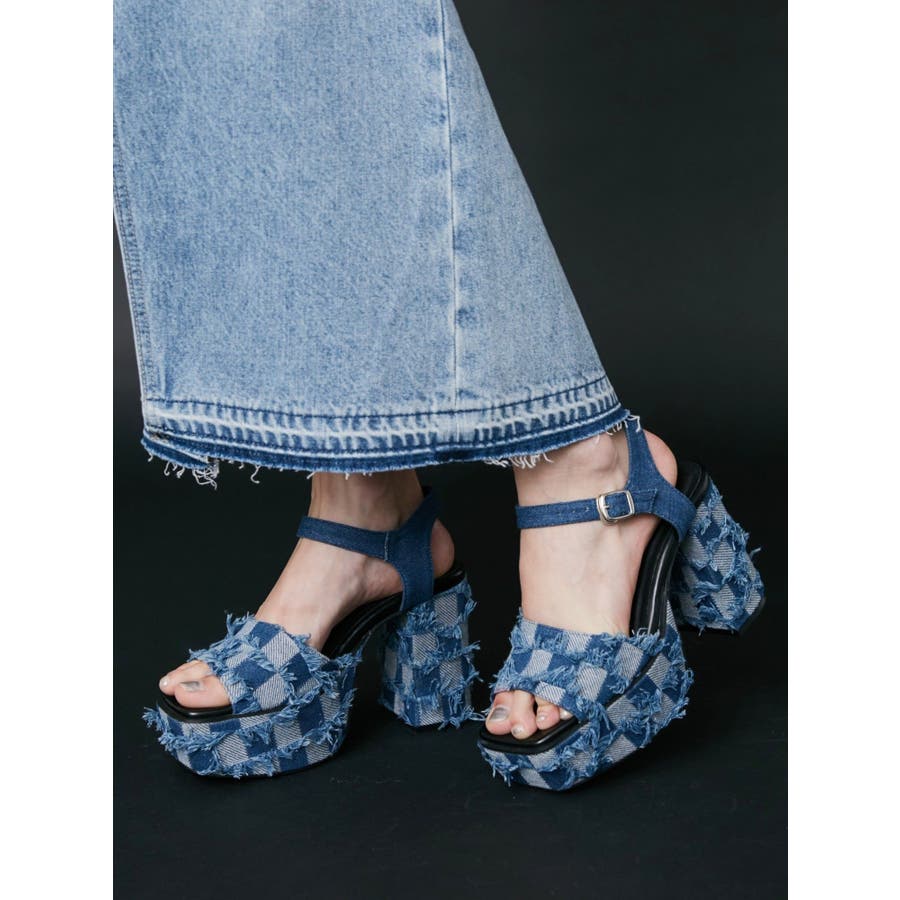 ブロッキング風のデニム生地を使用したプラットフォームサンダル。安定感のある太めヒールで歩きやすい1足です。靴下合わせのスタイリングもおすすめです。
