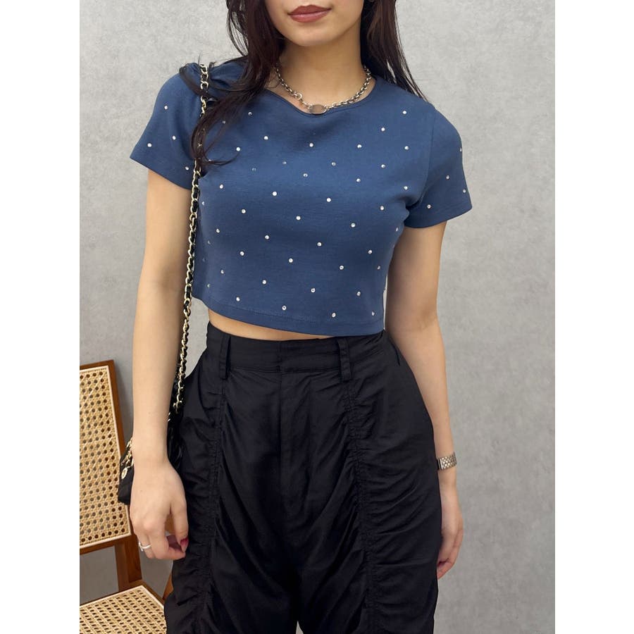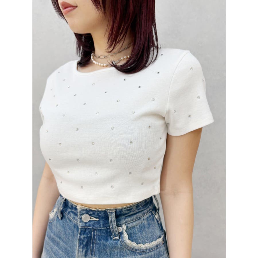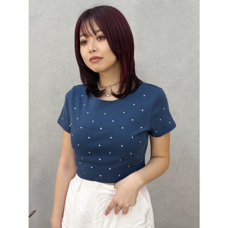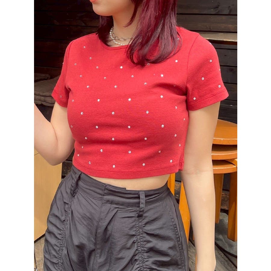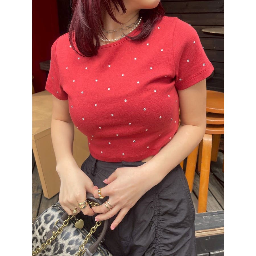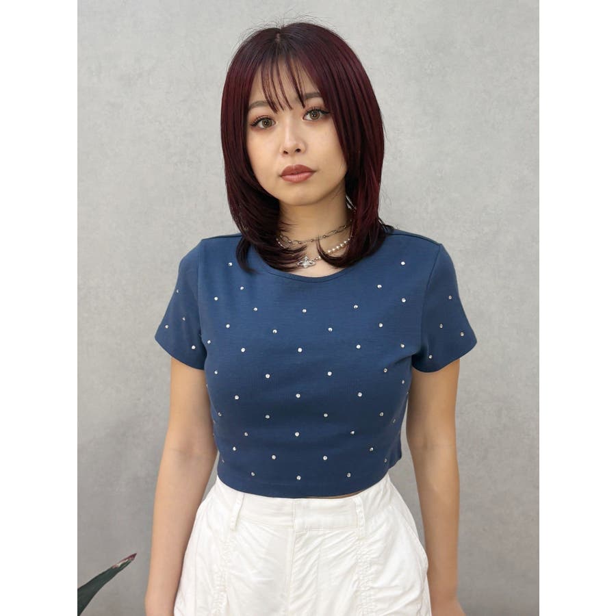 ■デザインキラキラ光るラインストーンが散りばめられたチビTです。背面やサイドにもラインストーンをあしらっており、どこから見てもかわいいトップスです。コンパクトなシルエットでボトムを選ばず、幅広いコーデをお楽しみいただけます。定番ベーシックカラーに加えて、大人っぽく着れるネイビーとボルドーが仲間入り。■スタイリングボリュームのあるボトムや、少しローライズのボトム合わせで肌見せも◎>>その他カラーはコチラ