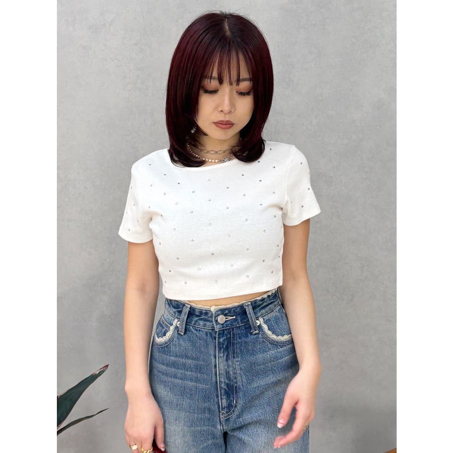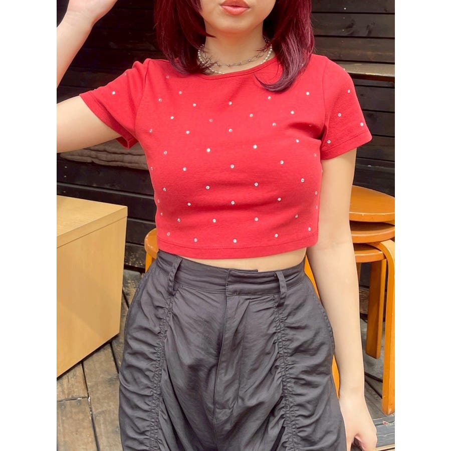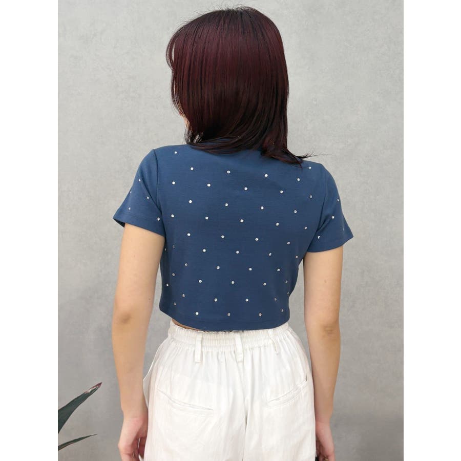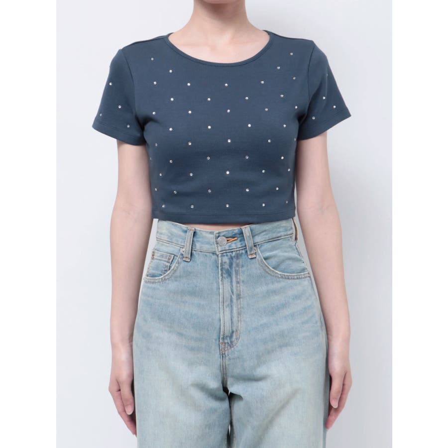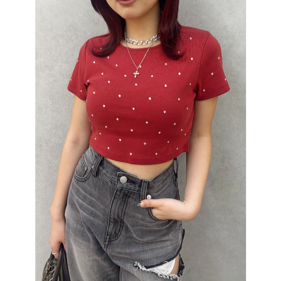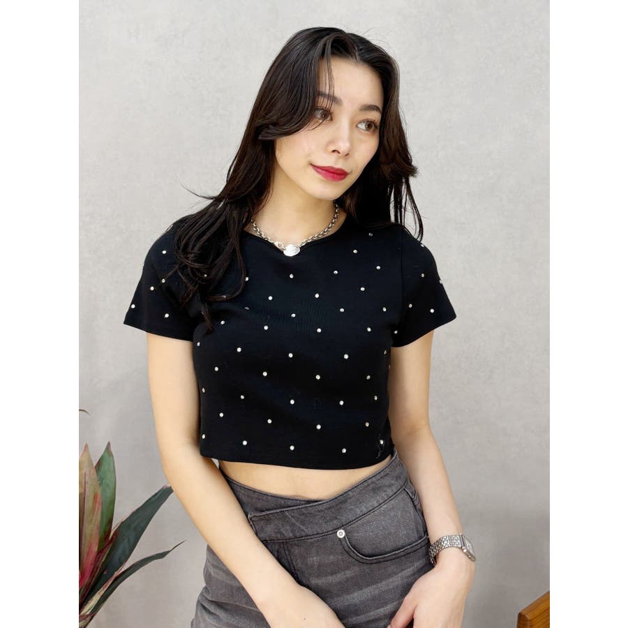 ■デザインキラキラ光るラインストーンが散りばめられたチビTです。背面やサイドにもラインストーンをあしらっており、どこから見てもかわいいトップスです。コンパクトなシルエットでボトムを選ばず、幅広いコーデをお楽しみいただけます。定番ベーシックカラーに加えて、大人っぽく着れるネイビーとボルドーが仲間入り。■スタイリングボリュームのあるボトムや、少しローライズのボトム合わせで肌見せも◎>>その他カラーはコチラ