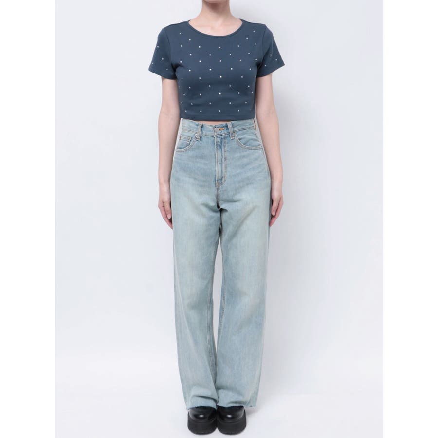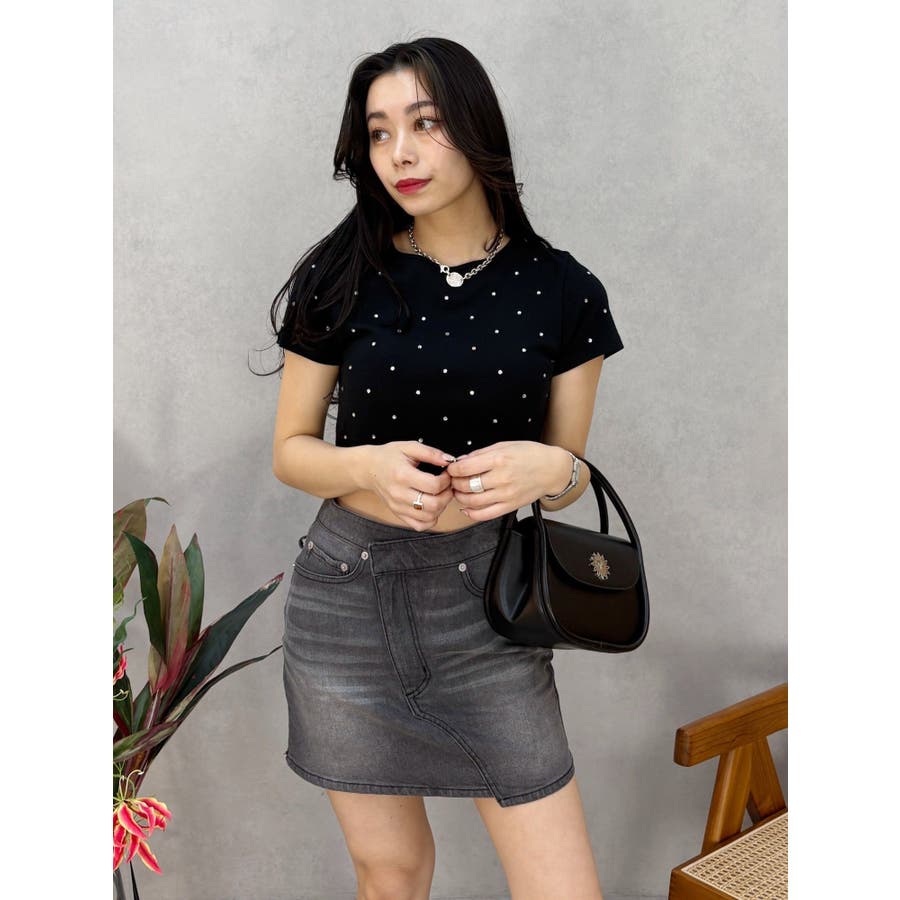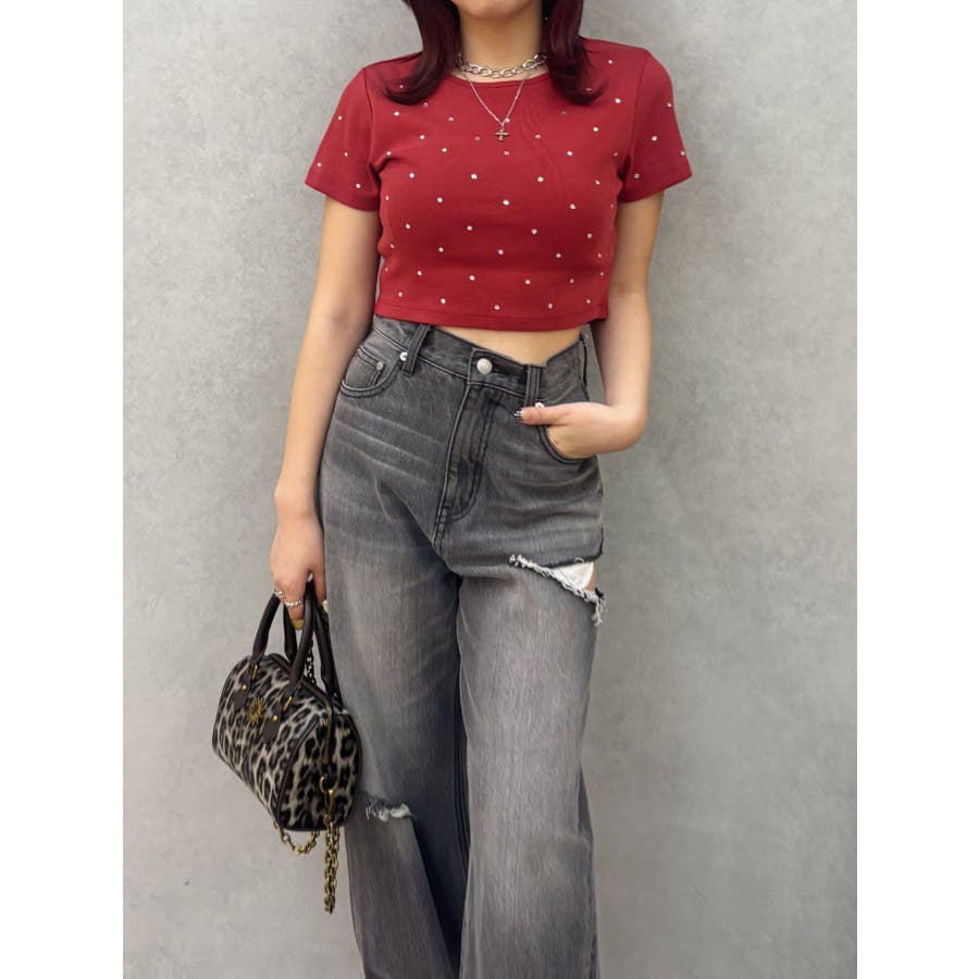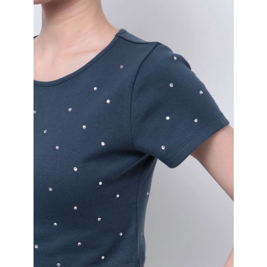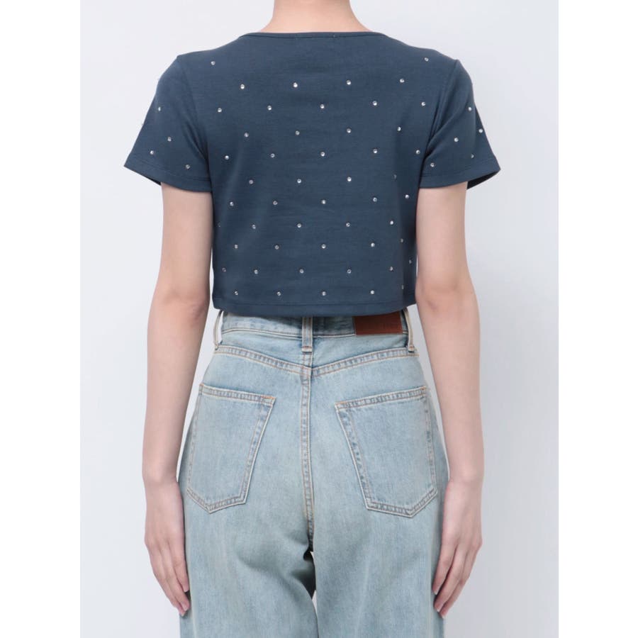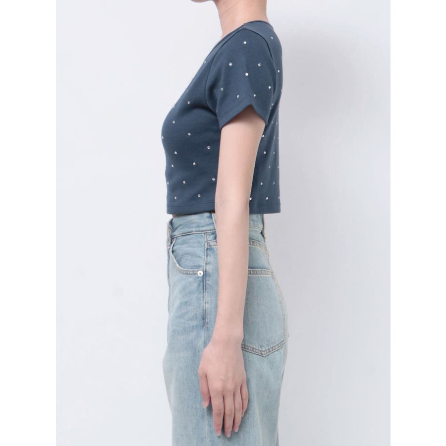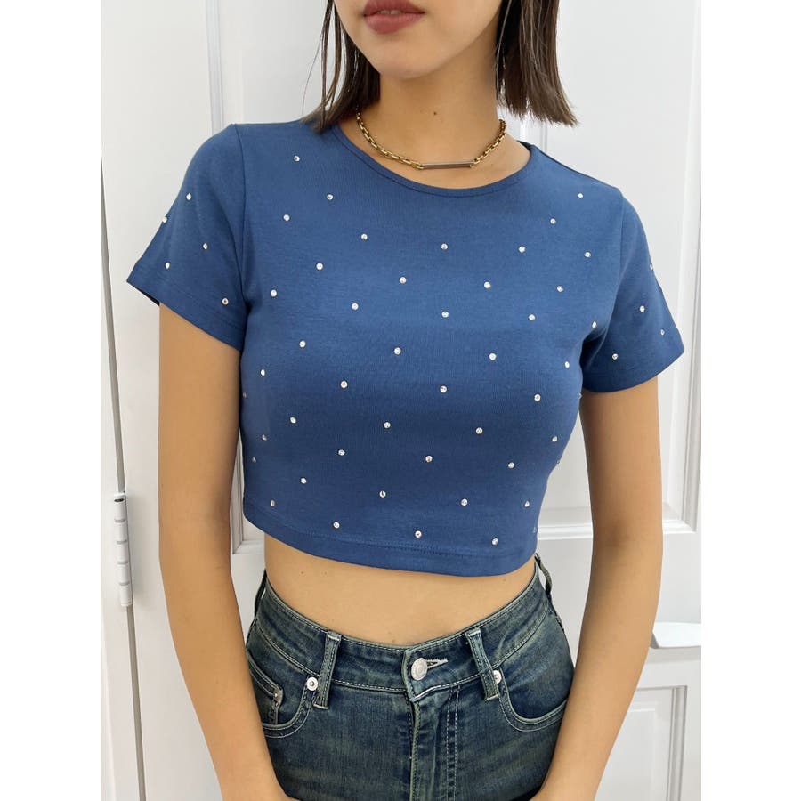 ■デザインキラキラ光るラインストーンが散りばめられたチビTです。背面やサイドにもラインストーンをあしらっており、どこから見てもかわいいトップスです。コンパクトなシルエットでボトムを選ばず、幅広いコーデをお楽しみいただけます。定番ベーシックカラーに加えて、大人っぽく着れるネイビーとボルドーが仲間入り。■スタイリングボリュームのあるボトムや、少しローライズのボトム合わせで肌見せも◎>>その他カラーはコチラ