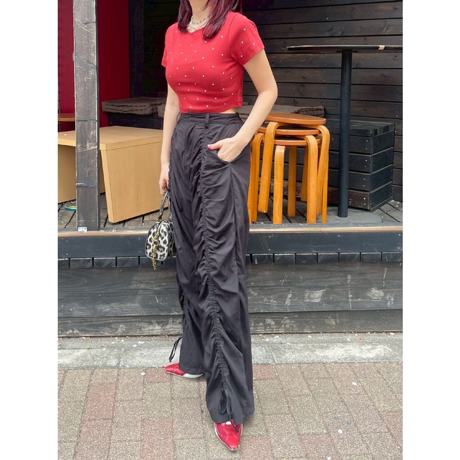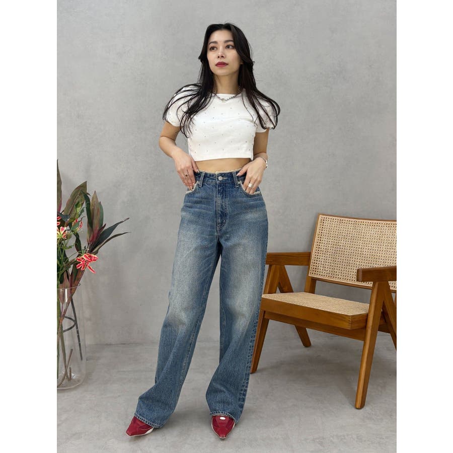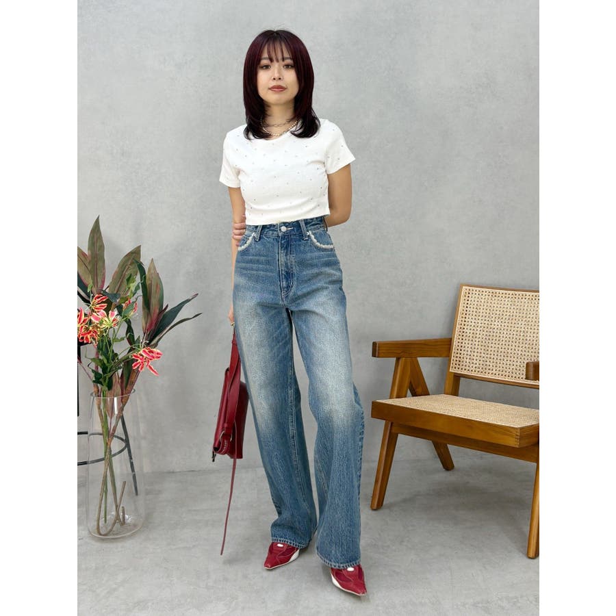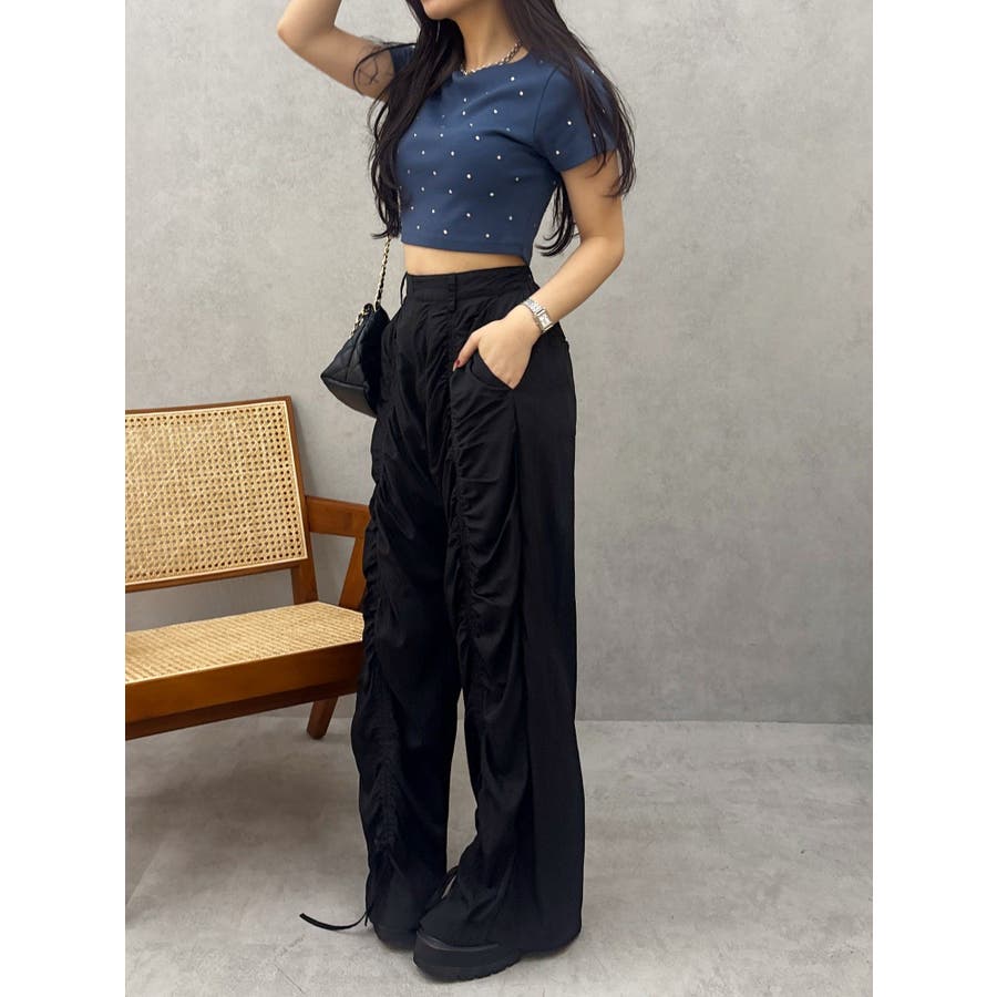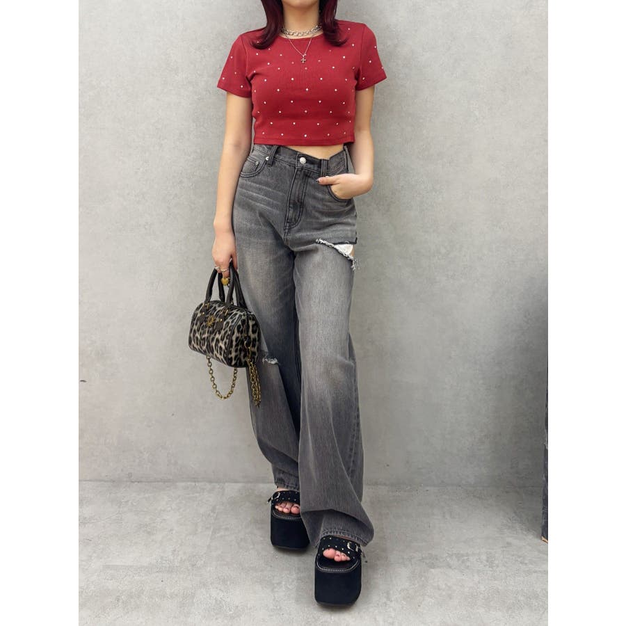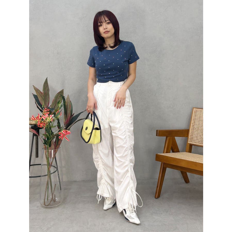 ■デザインキラキラ光るラインストーンが散りばめられたチビTです。背面やサイドにもラインストーンをあしらっており、どこから見てもかわいいトップスです。コンパクトなシルエットでボトムを選ばず、幅広いコーデをお楽しみいただけます。定番ベーシックカラーに加えて、大人っぽく着れるネイビーとボルドーが仲間入り。■スタイリングボリュームのあるボトムや、少しローライズのボトム合わせで肌見せも◎>>その他カラーはコチラ