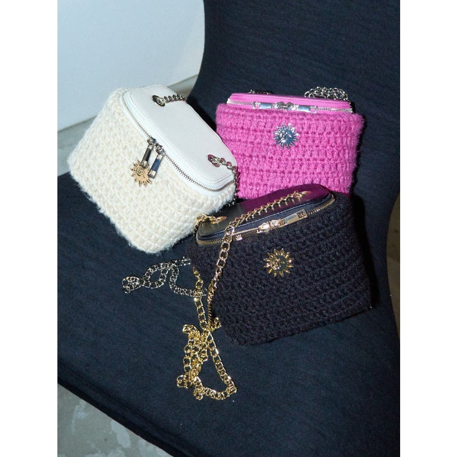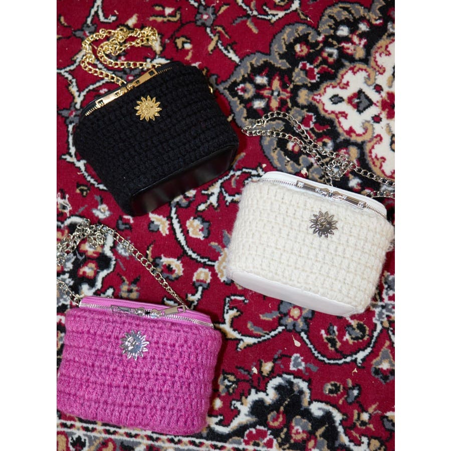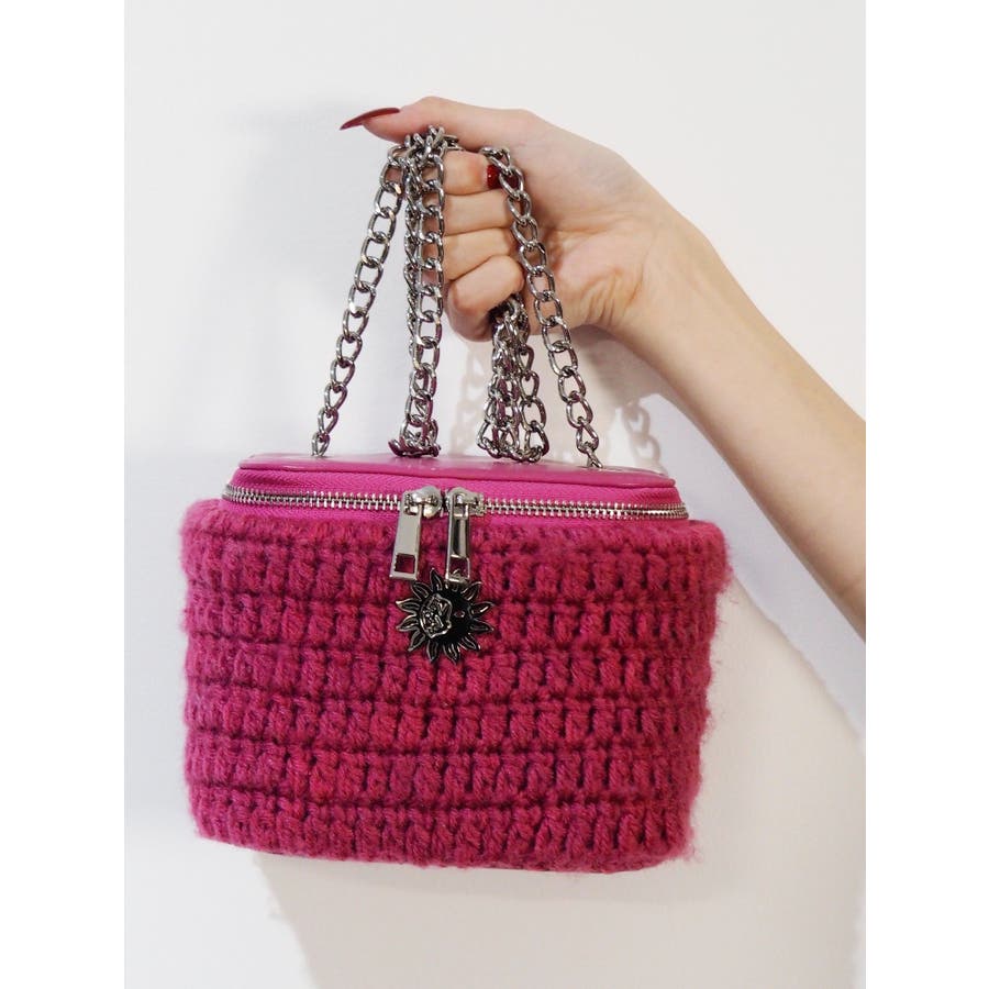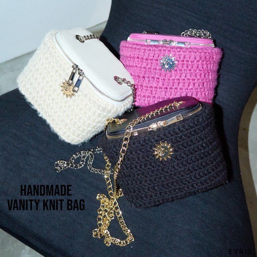 ニットを編み込んだ、ハンドメイドのバニティーBAGです。EVRIS(エヴリス)で人気のバニティーBAGをニット素材にし、季節感を感じるショルダーBAGです。ふた部分と底はフェイクレザーになっていて、ほっこりしすぎずデイリーに使いやすい異素材デザイン。ころんとした形が可愛い◎いつものコーディネートにいれるだけで季節感とアクセントがプラスされて新鮮に◎カラーは3色。どんなコーディネートにも取り入れやすいBASICなホワイト・ブラックと華やかな印象のピンクの3カラー。