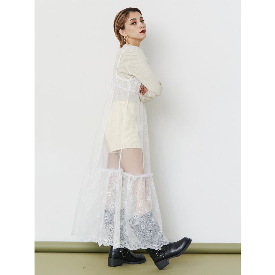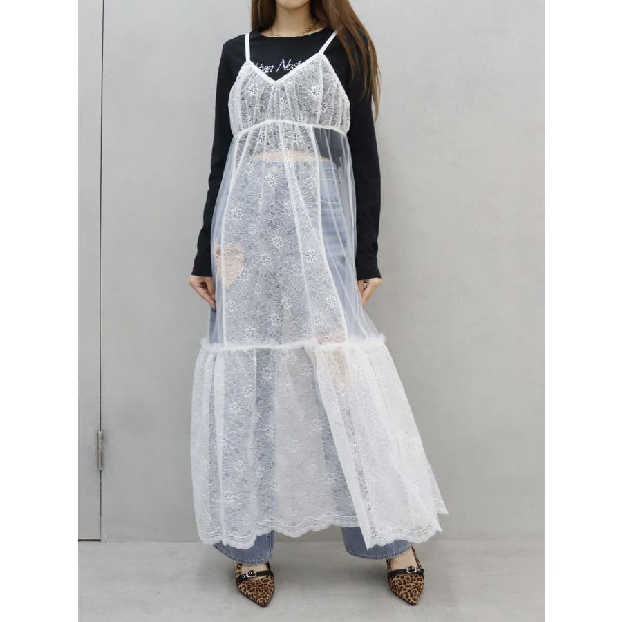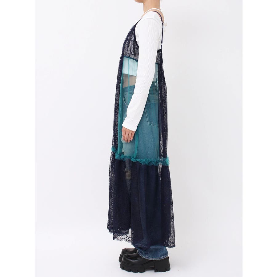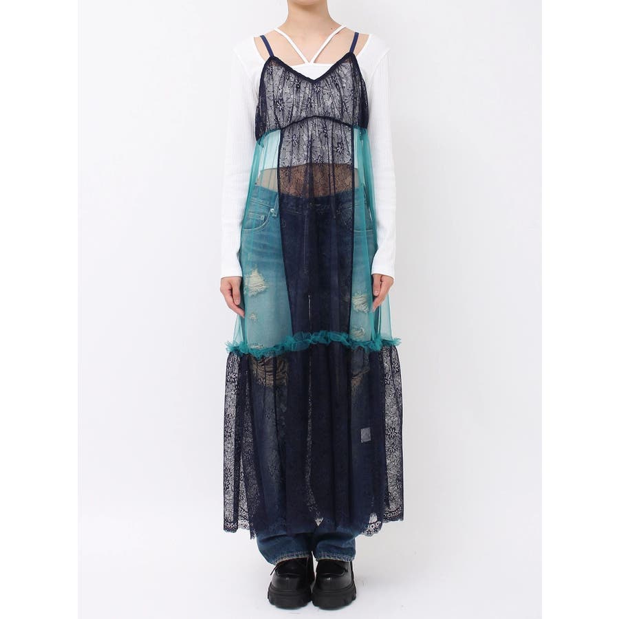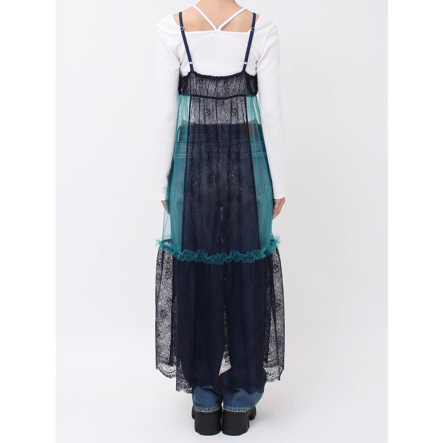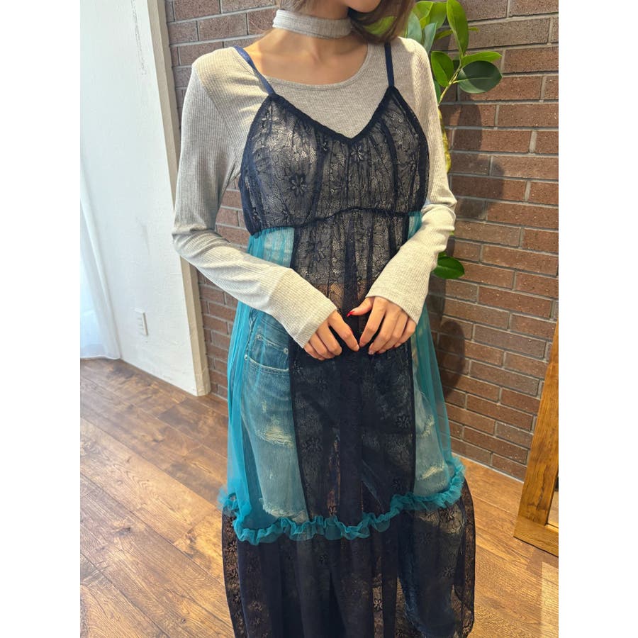 ■デザイン繊細なレースとチュール素材をコンビにしたレイヤード用のワンピースです。シアーの素材感が今年らしいムードを醸し出します。どんなコーデにも合わせやすいブラック・ホワイトに、EVRIS(エヴリス)らしさが詰まった配色のネイビーでご用意しました。いつものスタイリングにプラスするだけで今年らしい印象に仕上げてくれる優秀アイテムです。■スタイリングいつものスウェットとデニムパンツのスタイリングに加えるだけで新鮮なスタイリングに。ショートパンツ×ロングブーツの上からふわっと羽織るのも◎-------------- 透け感:あり裏地:なし 生地の厚み:薄手伸縮性:なし --------------
