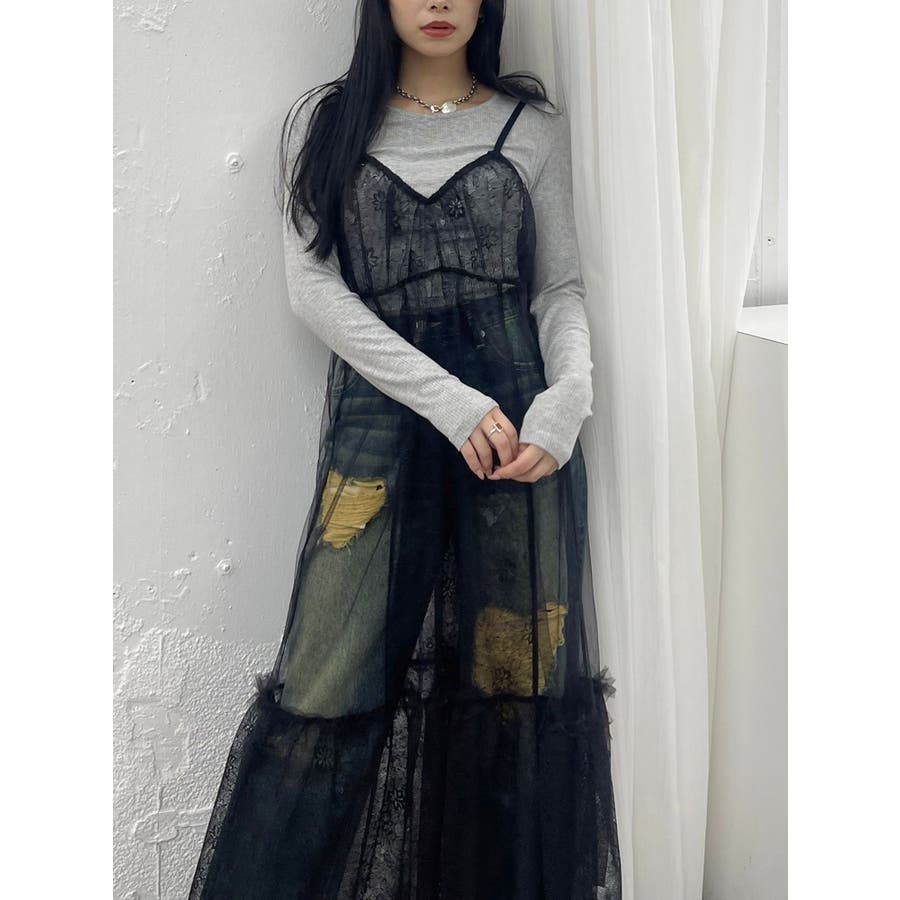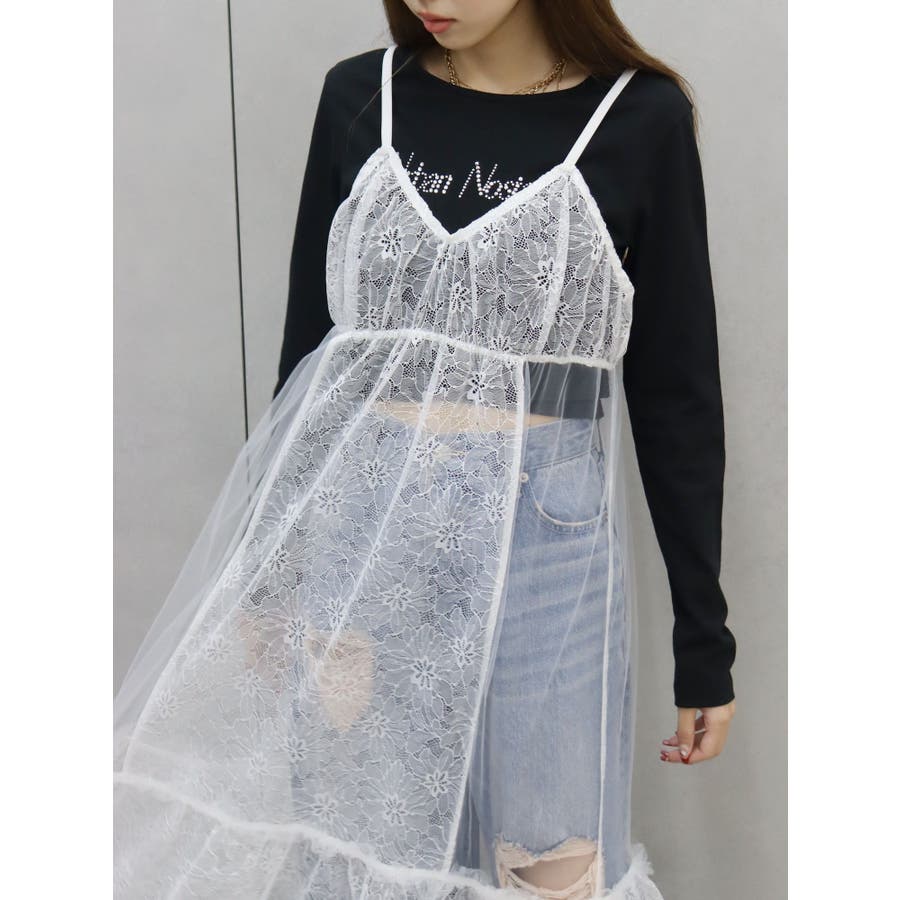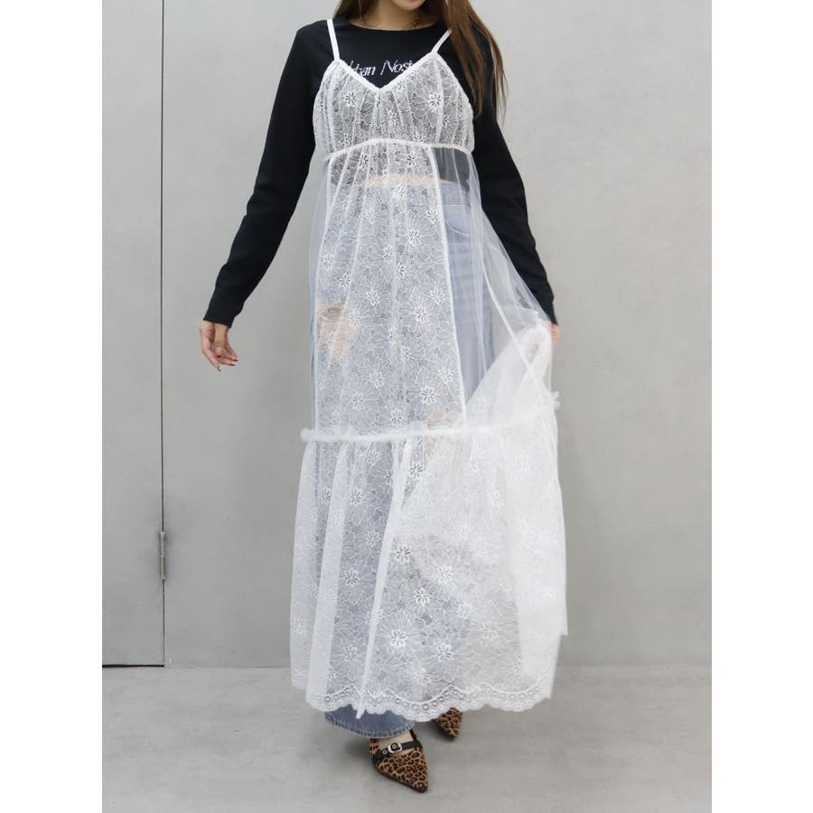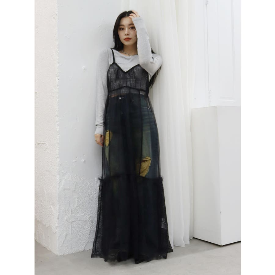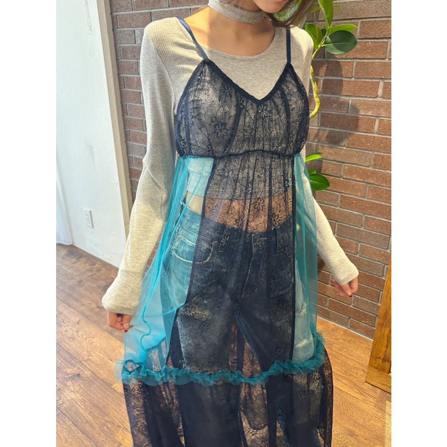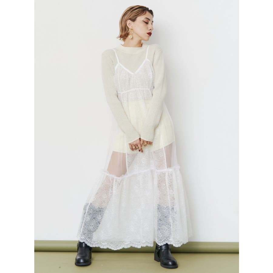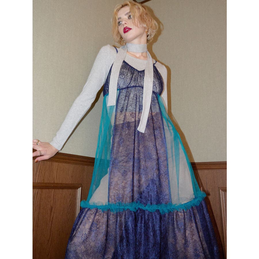 ■デザイン繊細なレースとチュール素材をコンビにしたレイヤード用のワンピースです。シアーの素材感が今年らしいムードを醸し出します。どんなコーデにも合わせやすいブラック・ホワイトに、EVRIS(エヴリス)らしさが詰まった配色のネイビーでご用意しました。いつものスタイリングにプラスするだけで今年らしい印象に仕上げてくれる優秀アイテムです。■スタイリングいつものスウェットとデニムパンツのスタイリングに加えるだけで新鮮なスタイリングに。ショートパンツ×ロングブーツの上からふわっと羽織るのも◎-------------- 透け感:あり裏地:なし 生地の厚み:薄手伸縮性:なし --------------