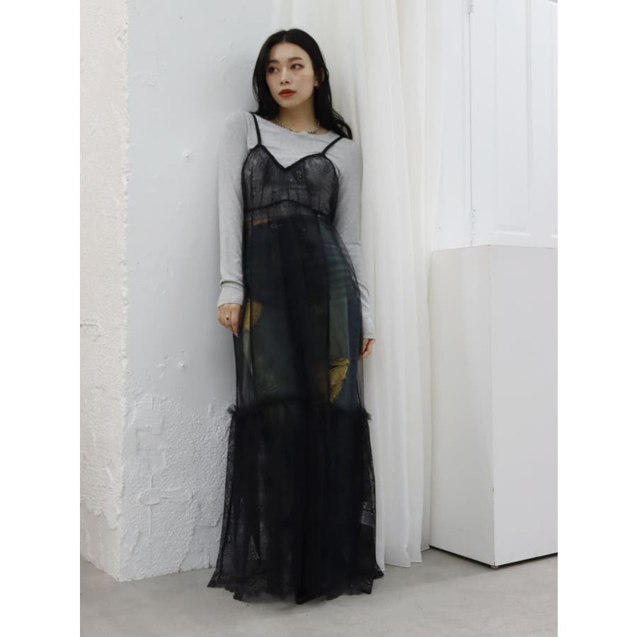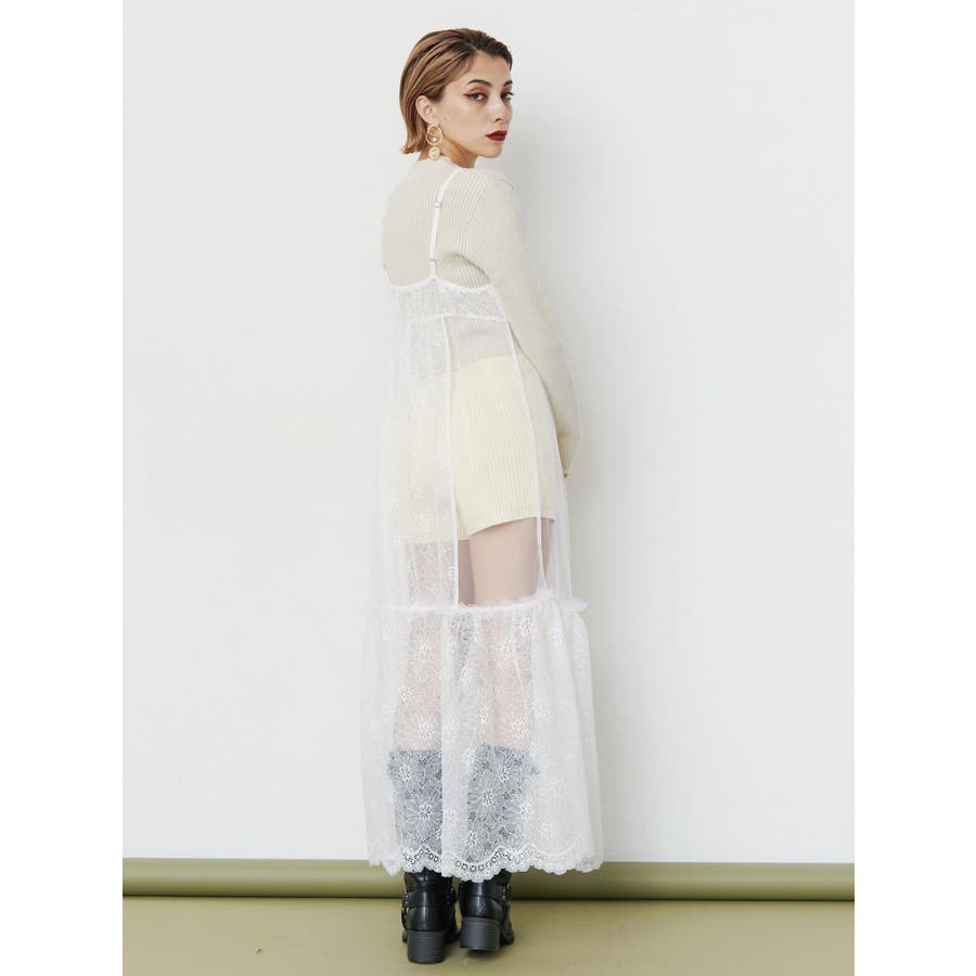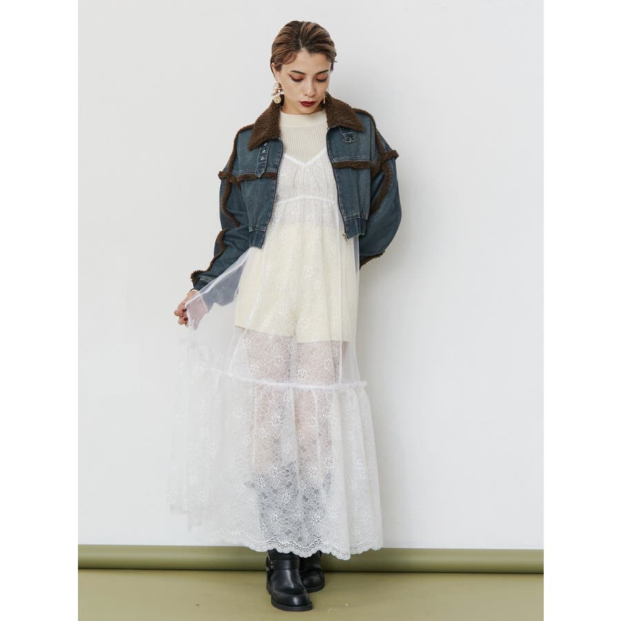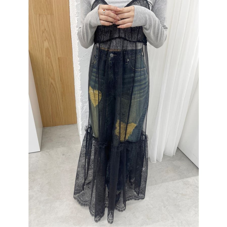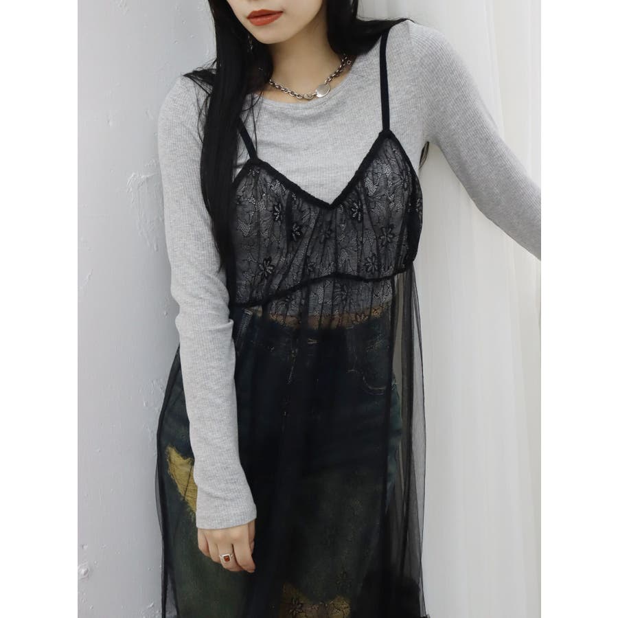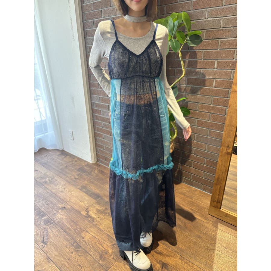 ■デザイン繊細なレースとチュール素材をコンビにしたレイヤード用のワンピースです。シアーの素材感が今年らしいムードを醸し出します。どんなコーデにも合わせやすいブラック・ホワイトに、EVRIS(エヴリス)らしさが詰まった配色のネイビーでご用意しました。いつものスタイリングにプラスするだけで今年らしい印象に仕上げてくれる優秀アイテムです。■スタイリングいつものスウェットとデニムパンツのスタイリングに加えるだけで新鮮なスタイリングに。ショートパンツ×ロングブーツの上からふわっと羽織るのも◎-------------- 透け感:あり裏地:なし 生地の厚み:薄手伸縮性:なし --------------