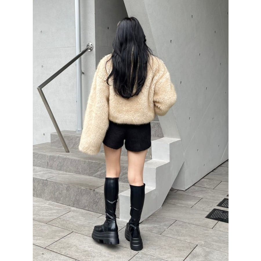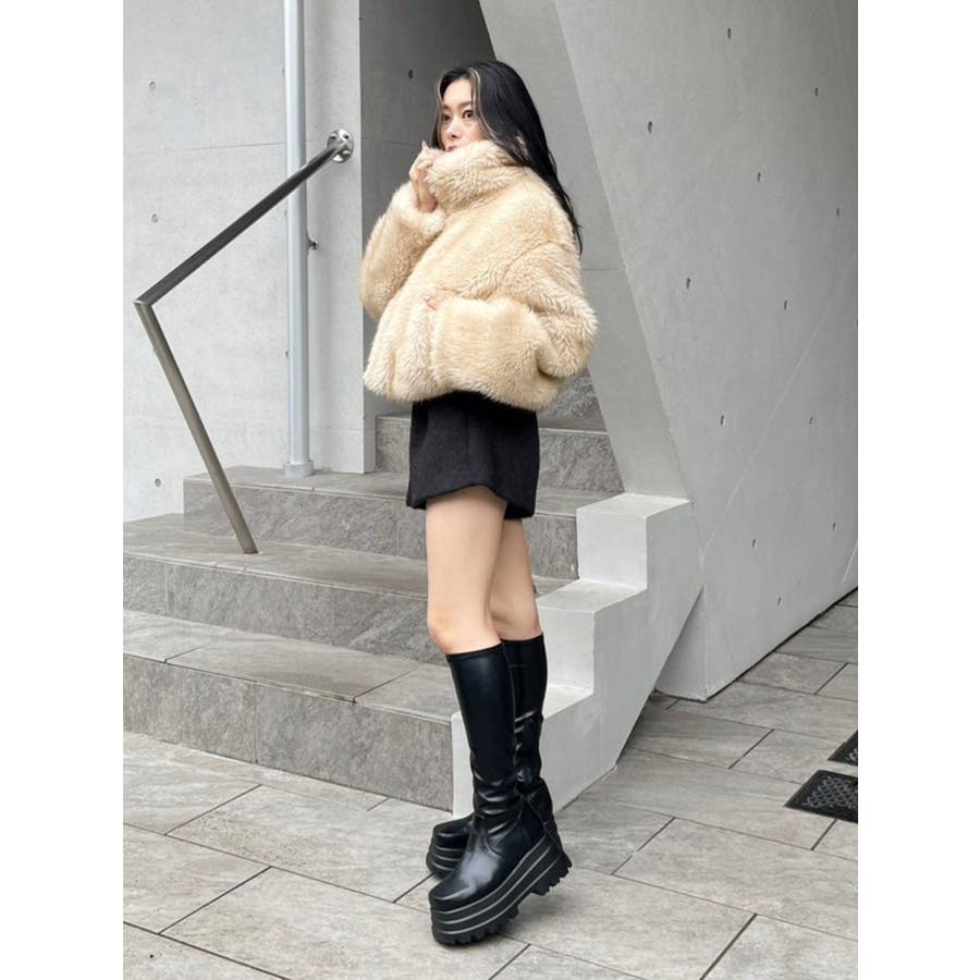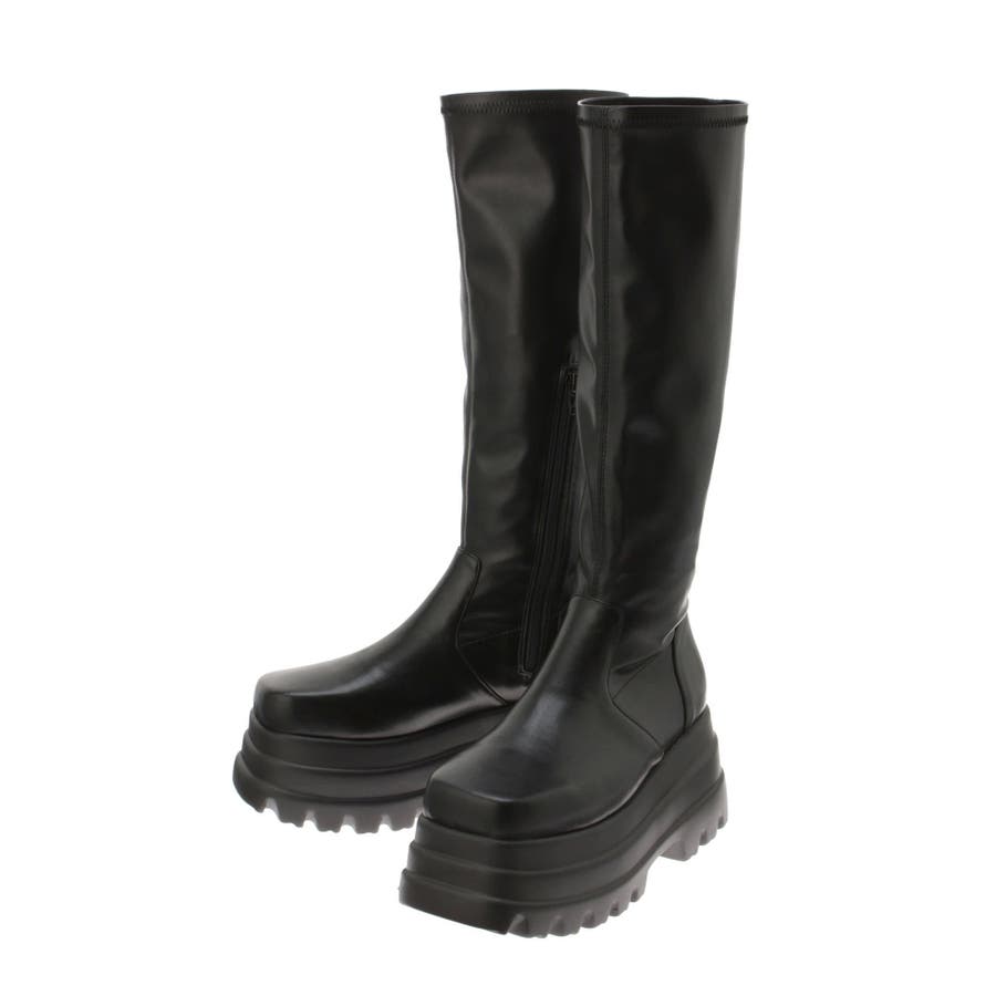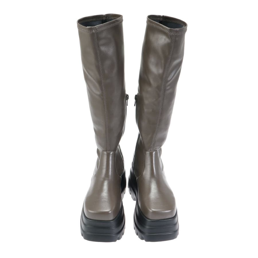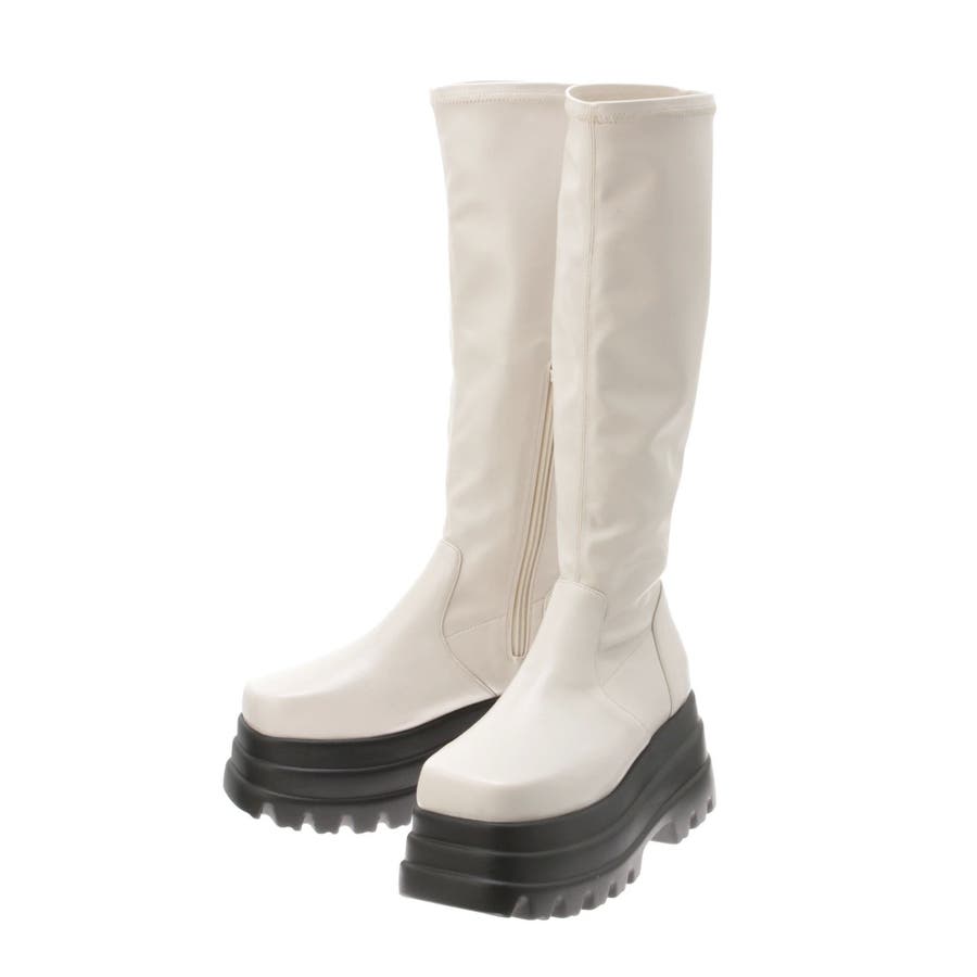 ストレッチ素材を使用したミドルブーツ。厚めのソールを使用しており、美脚効果抜群の1足です。厚底ですが軽い素材なので履き心地が良いです。ミニボトムとのスタイリングがおすすめです。