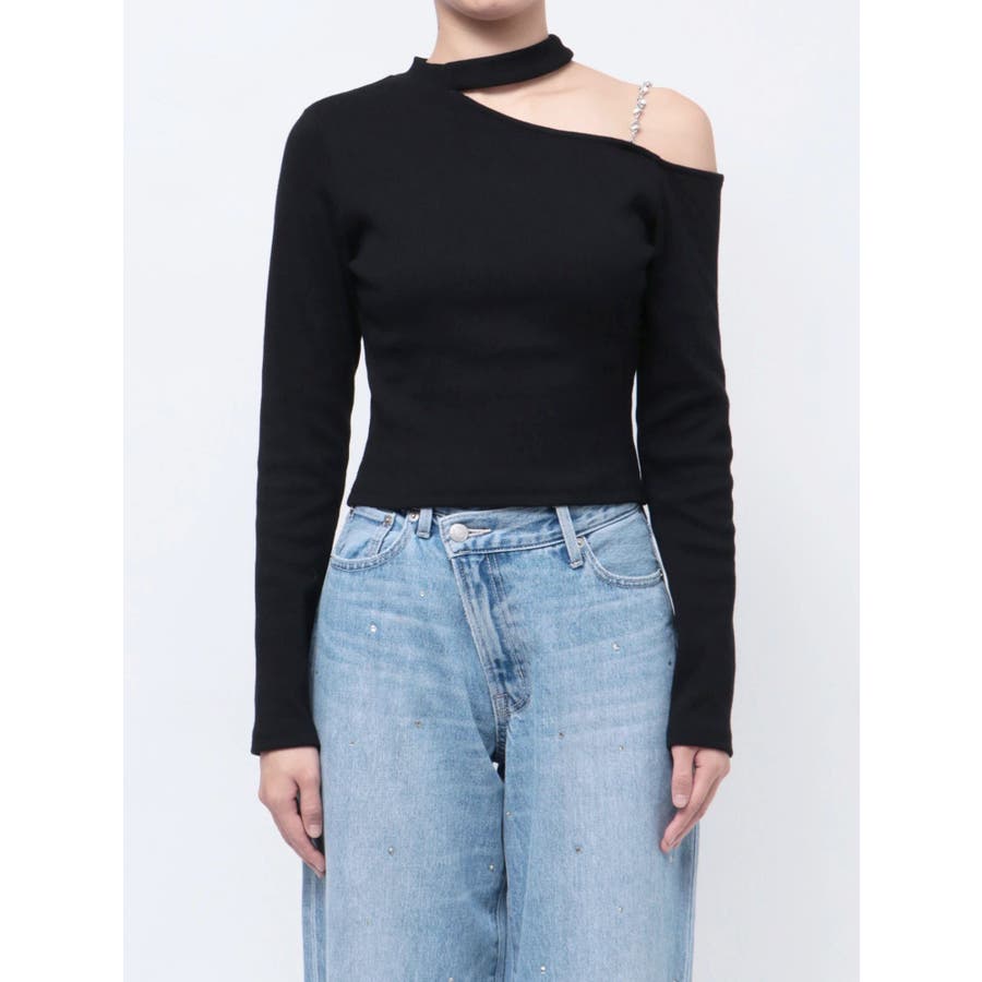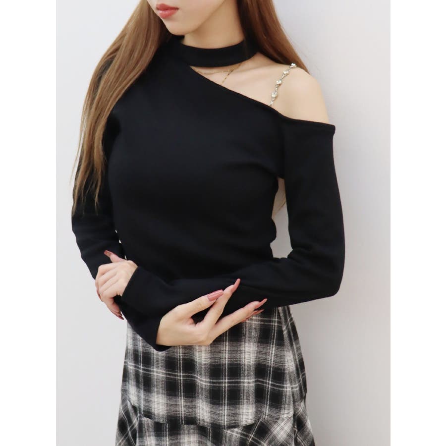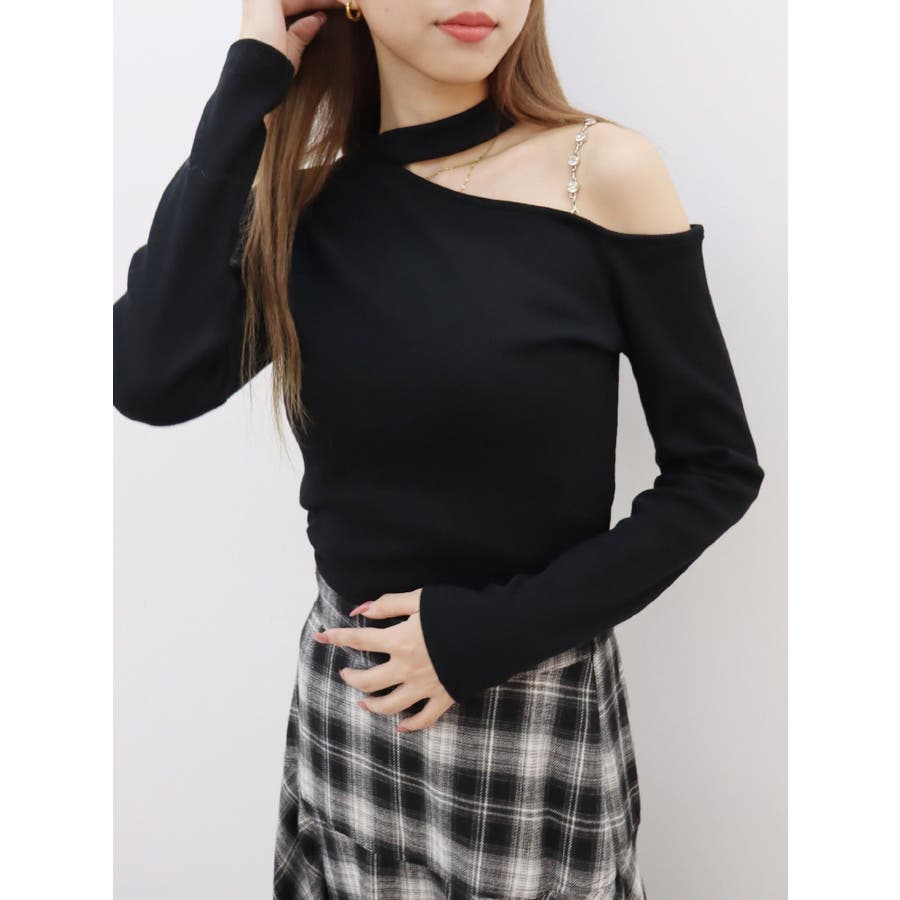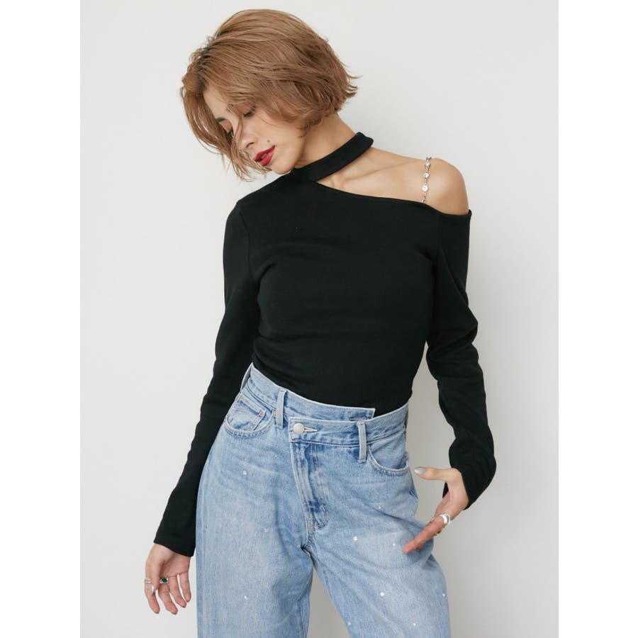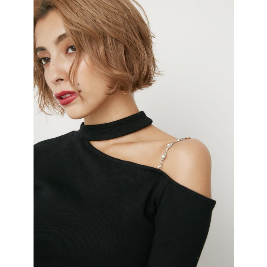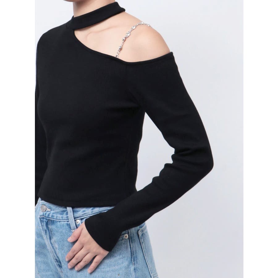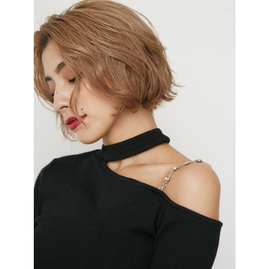 ■デザインショルダー部分にラインストーンの付いたチェーンを使用している、EVRIS(エヴリス)らしいエッジの効いたトップスです。リブ生地を使用しており、程よいフィット感で着心地が良いです。肩見せのデザインですが、ハイネックなので程よく綺麗め見えするトップスです。アウターのインナーでも着やすいサイズ感になっています。 ■スタイリングシンプルなデニム合わせやなどが幅広いコーデに取り入れやすいアイテム。ジャンスカなどのインナーにもインパクトが出ておすすめです。-------------- 透け感:なし 裏地:なし 生地の厚み:やや薄手伸縮性:なし --------------