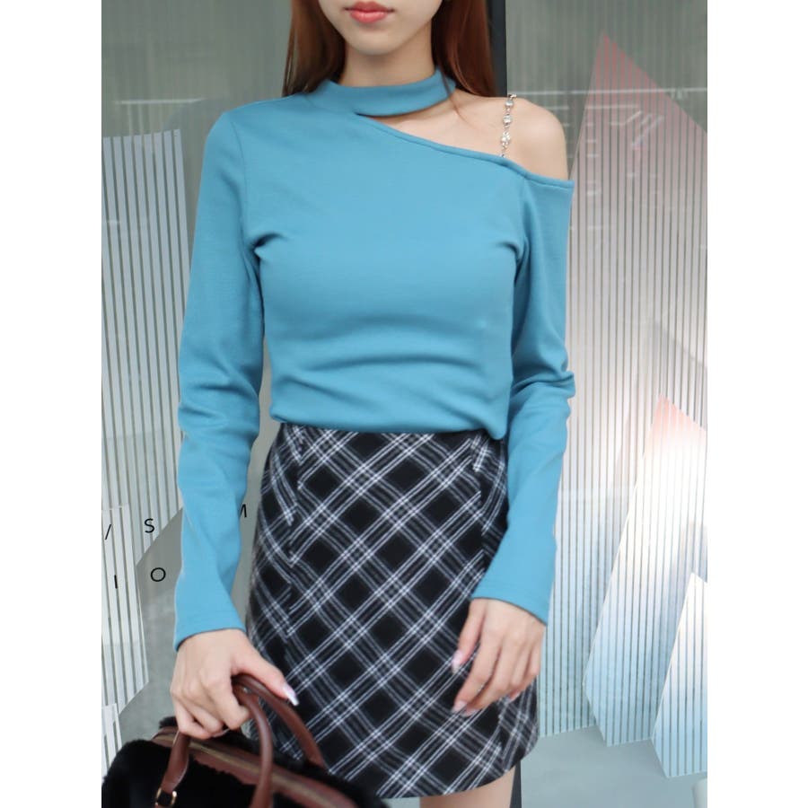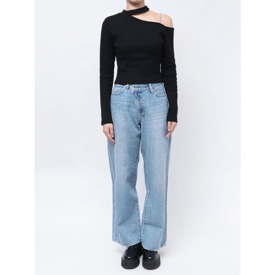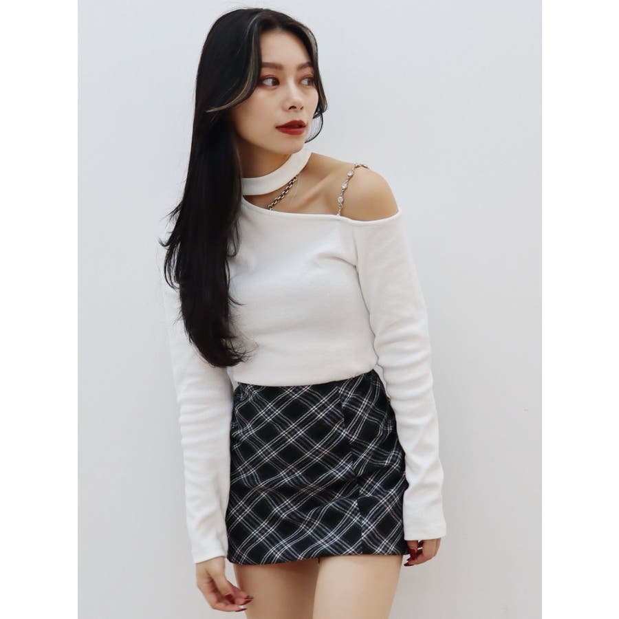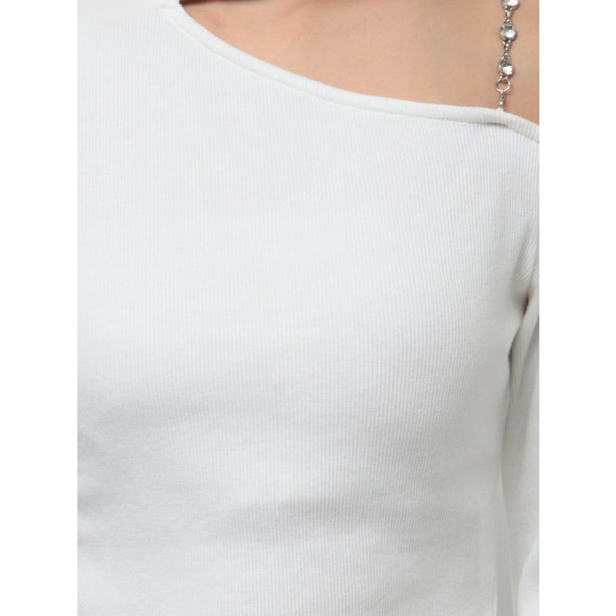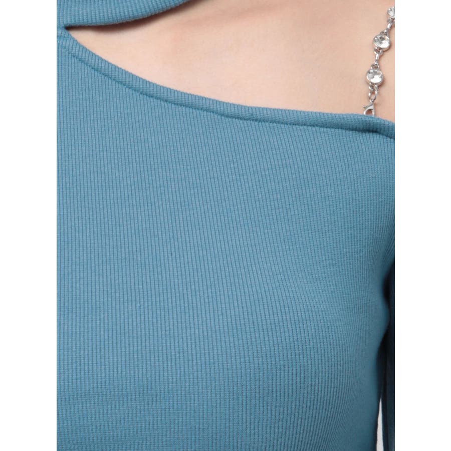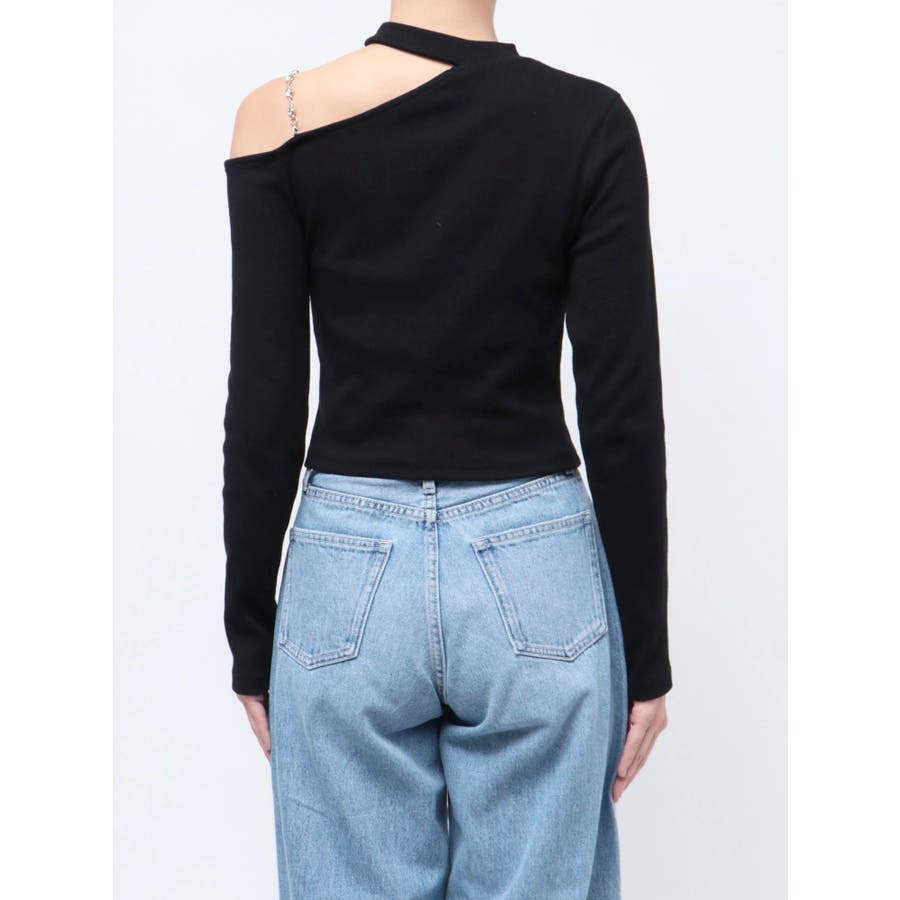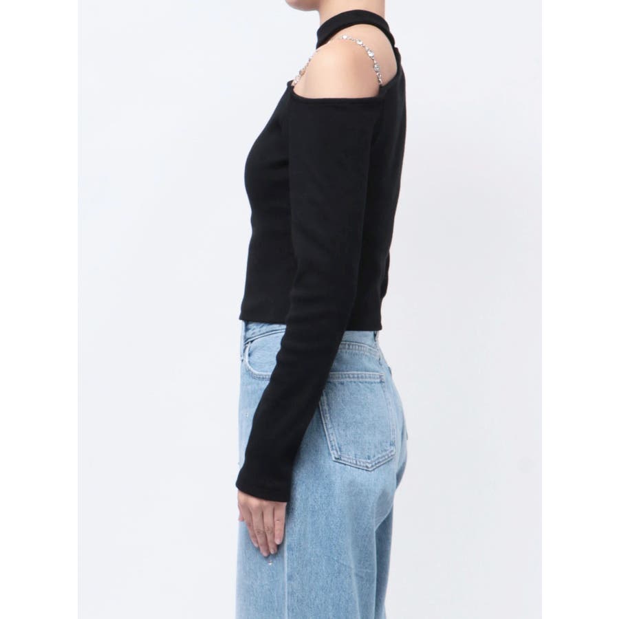 ■デザインショルダー部分にラインストーンの付いたチェーンを使用している、EVRIS(エヴリス)らしいエッジの効いたトップスです。リブ生地を使用しており、程よいフィット感で着心地が良いです。肩見せのデザインですが、ハイネックなので程よく綺麗め見えするトップスです。アウターのインナーでも着やすいサイズ感になっています。 ■スタイリングシンプルなデニム合わせやなどが幅広いコーデに取り入れやすいアイテム。ジャンスカなどのインナーにもインパクトが出ておすすめです。-------------- 透け感:なし 裏地:なし 生地の厚み:やや薄手伸縮性:なし --------------