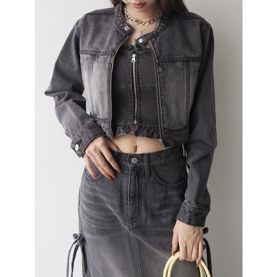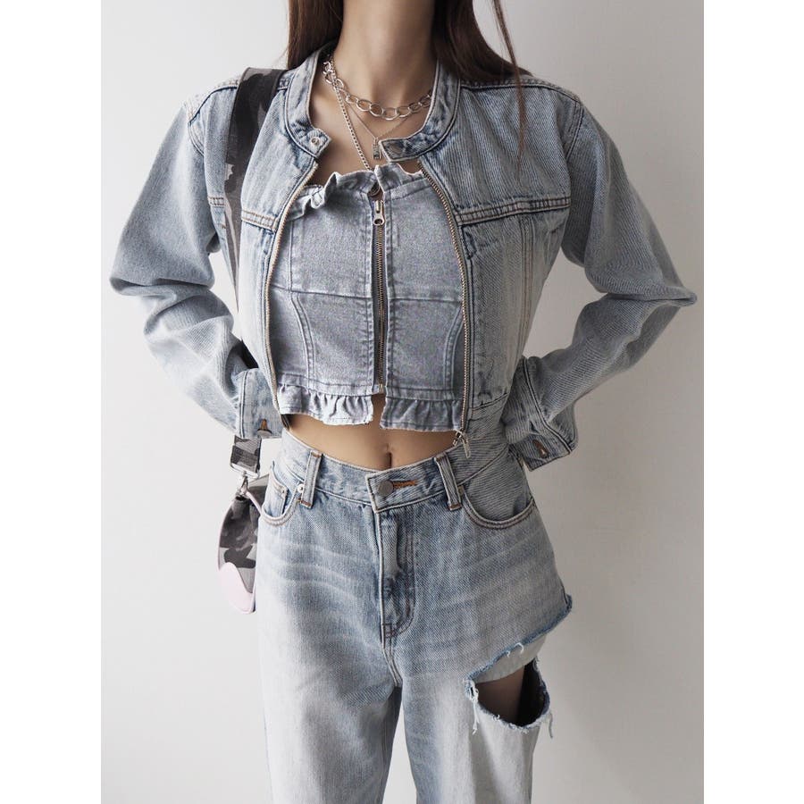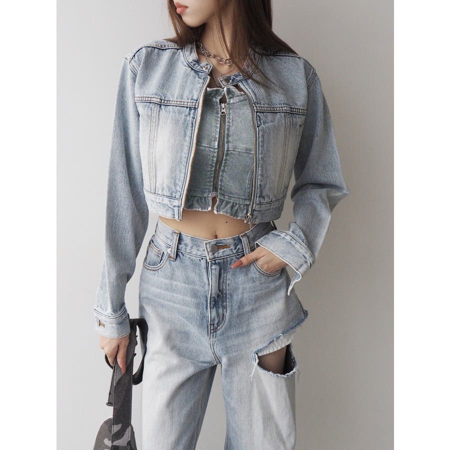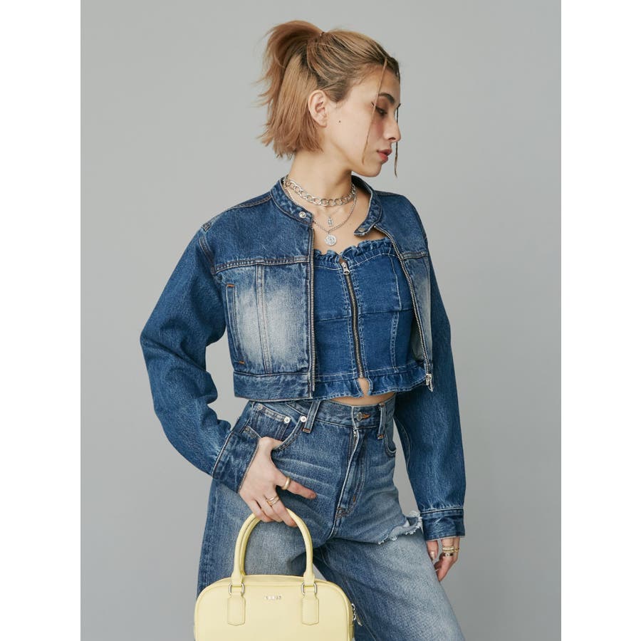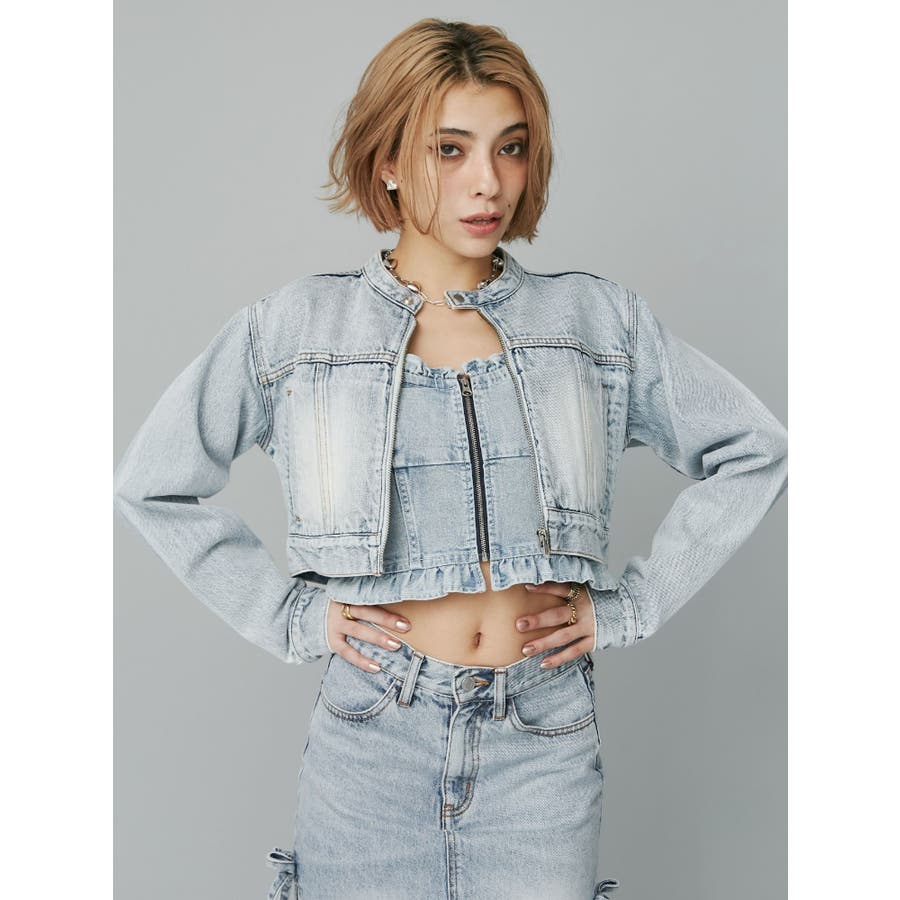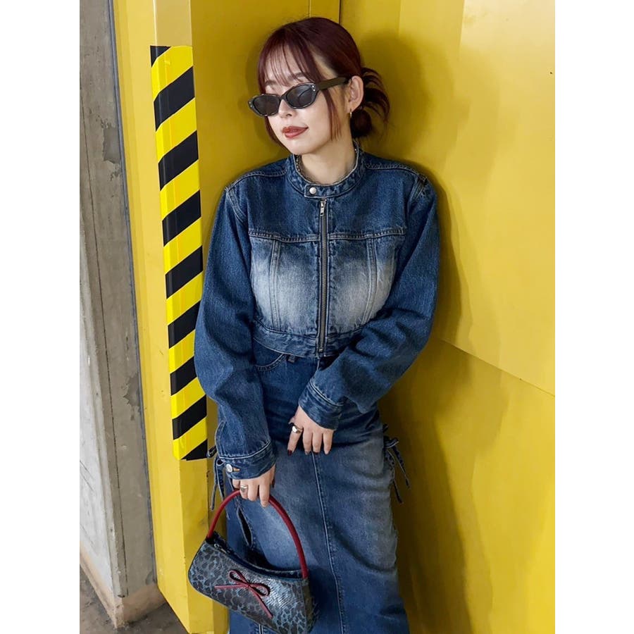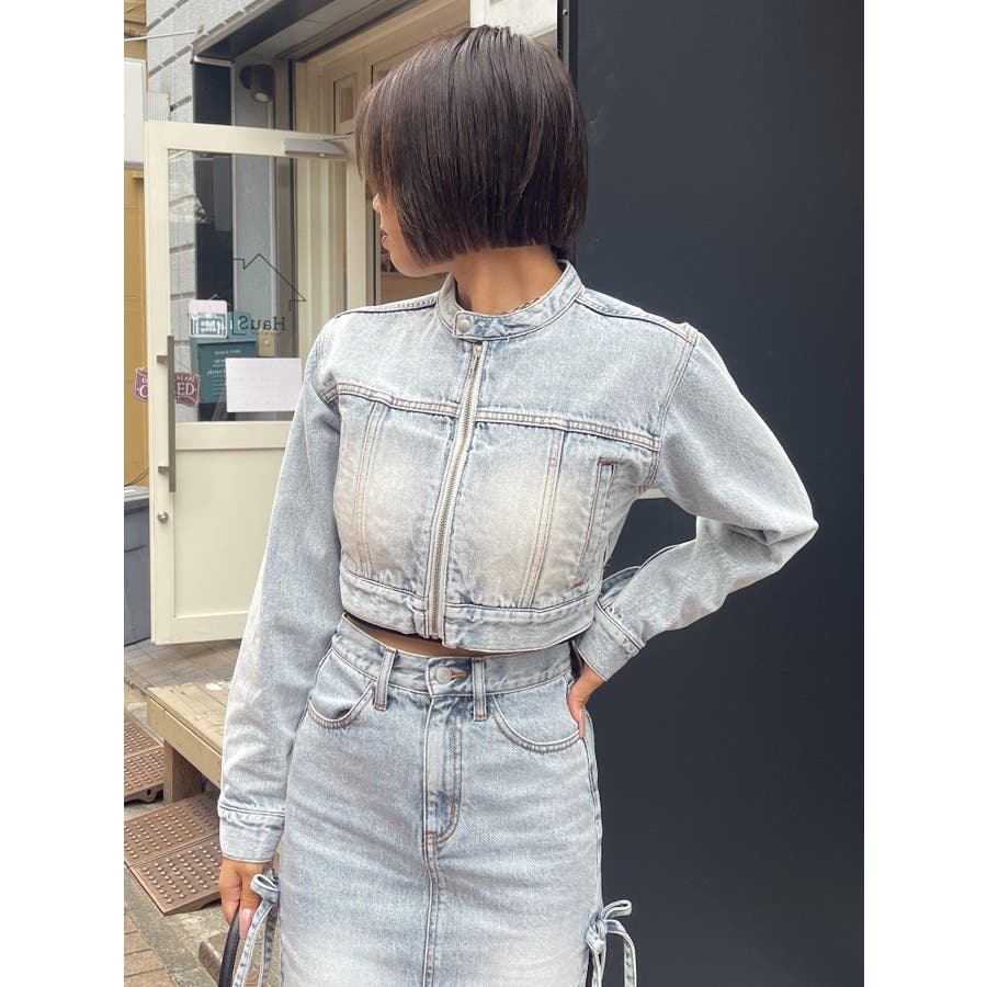 ■デザイン今季トレンドのバイカー風デザインのデニムブルゾンです。袖周りやバストなど少しタイトなシルエットにしており、ジップを閉めて着用したときのシルエットが綺麗な一枚。同素材でパンツ、スカート、ビスチェのご用意があり、お好きなスタイリングをお楽しみいただけます。■セットアップアイテム>>サイドカッティングワイドデニム>>サイドリボンカットロングデニムスカート>>デニムフリルビスチェ■スタイリングセットアップでの着用はもちろん、単体でも着回しが効くのが魅力のデニムジャケット。レディライクなワンピースなどに合わせるのが今年らしくおすすめです。-------------- 透け感:なし生地の厚み:普通伸縮性:なし --------------
