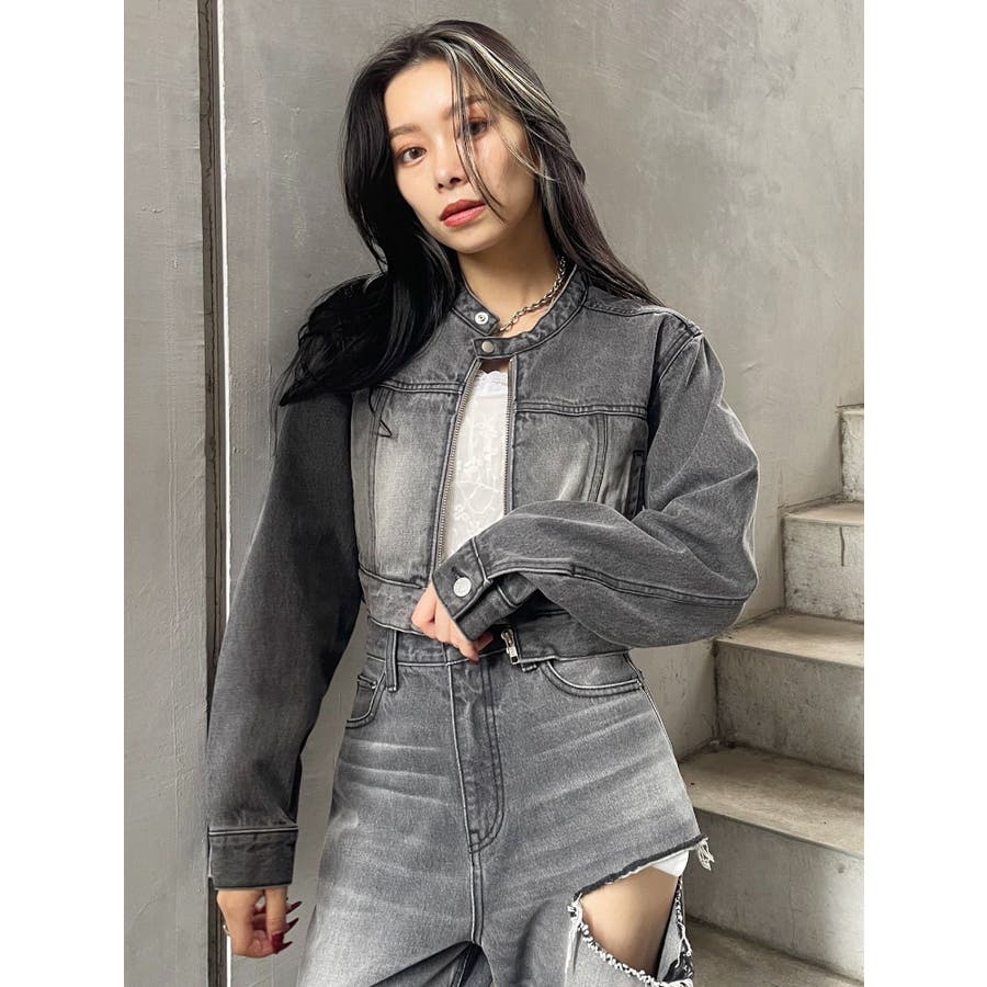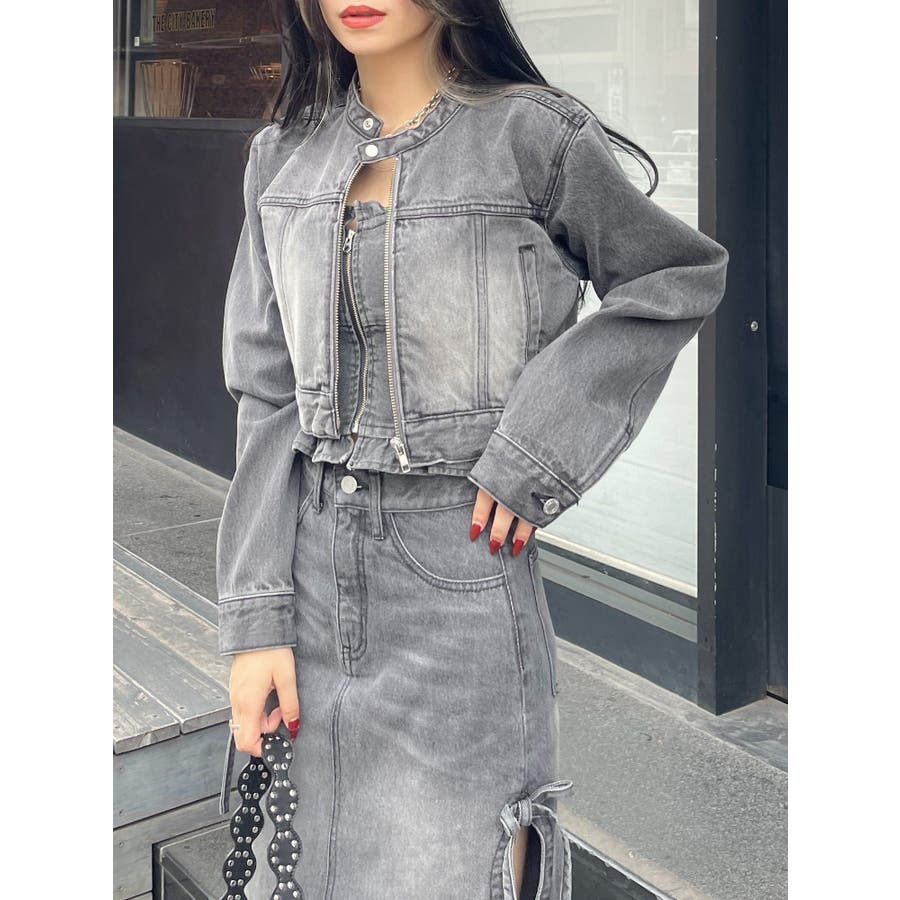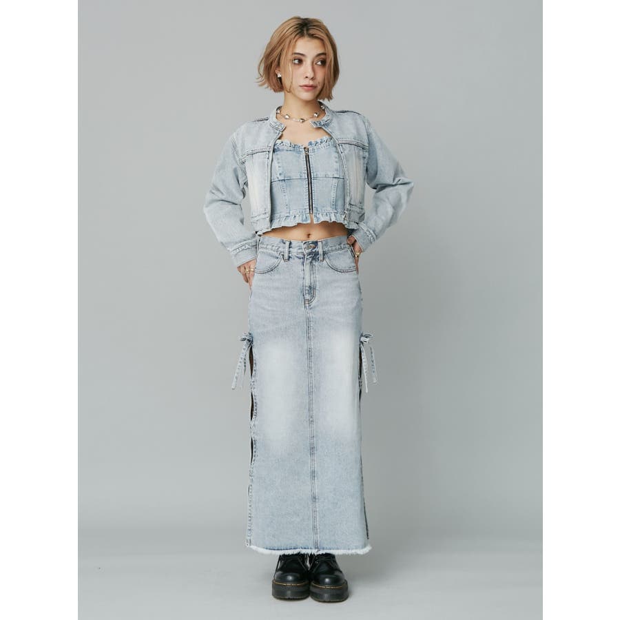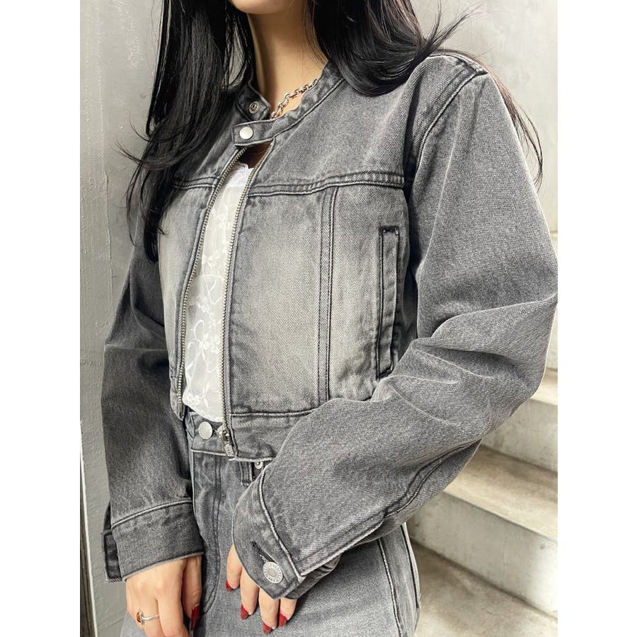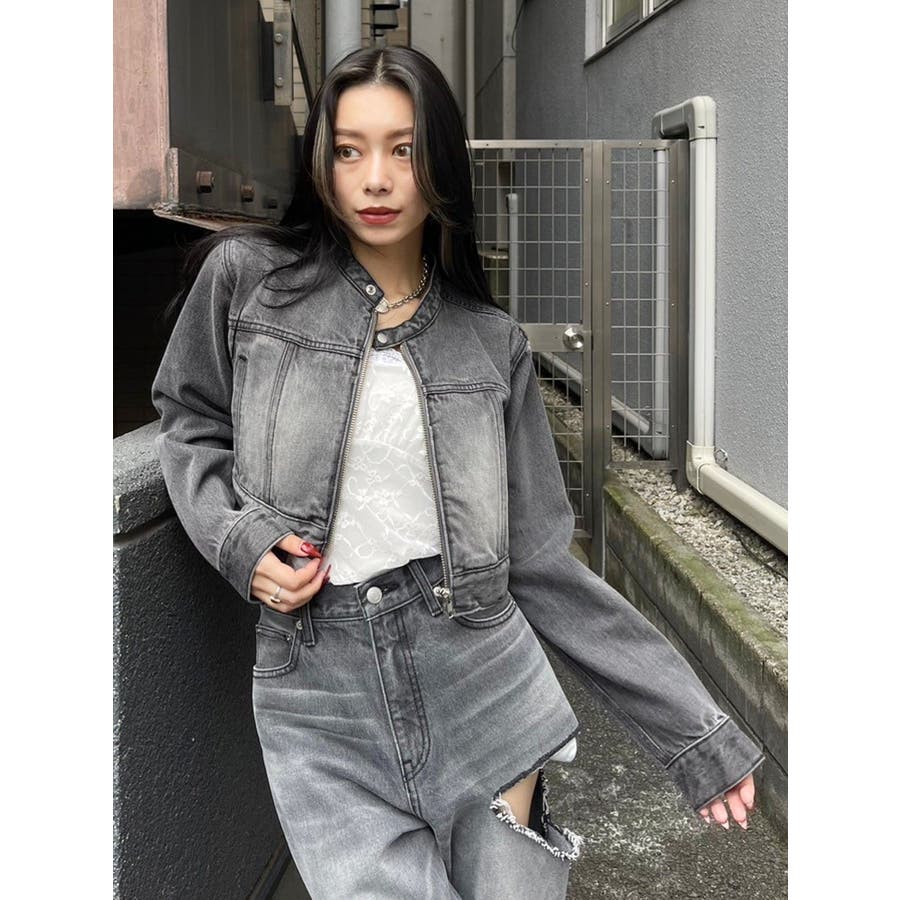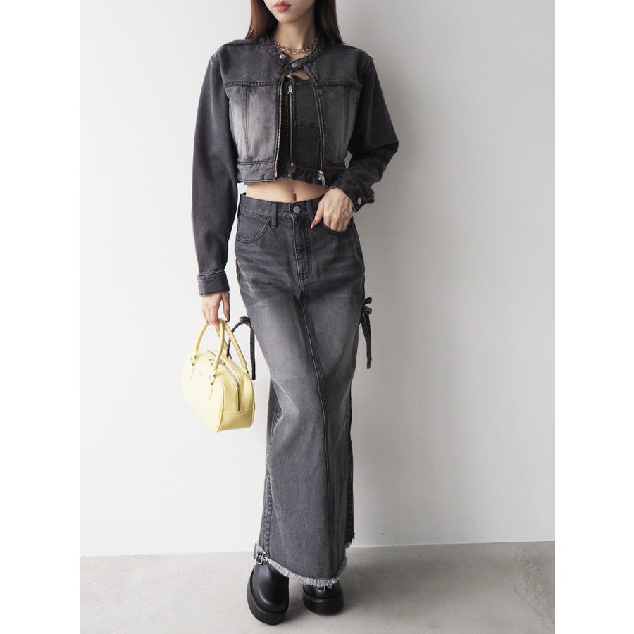 ■デザイン今季トレンドのバイカー風デザインのデニムブルゾンです。袖周りやバストなど少しタイトなシルエットにしており、ジップを閉めて着用したときのシルエットが綺麗な一枚。同素材でパンツ、スカート、ビスチェのご用意があり、お好きなスタイリングをお楽しみいただけます。■セットアップアイテム>>サイドカッティングワイドデニム>>サイドリボンカットロングデニムスカート>>デニムフリルビスチェ■スタイリングセットアップでの着用はもちろん、単体でも着回しが効くのが魅力のデニムジャケット。レディライクなワンピースなどに合わせるのが今年らしくおすすめです。-------------- 透け感:なし生地の厚み:普通伸縮性:なし --------------