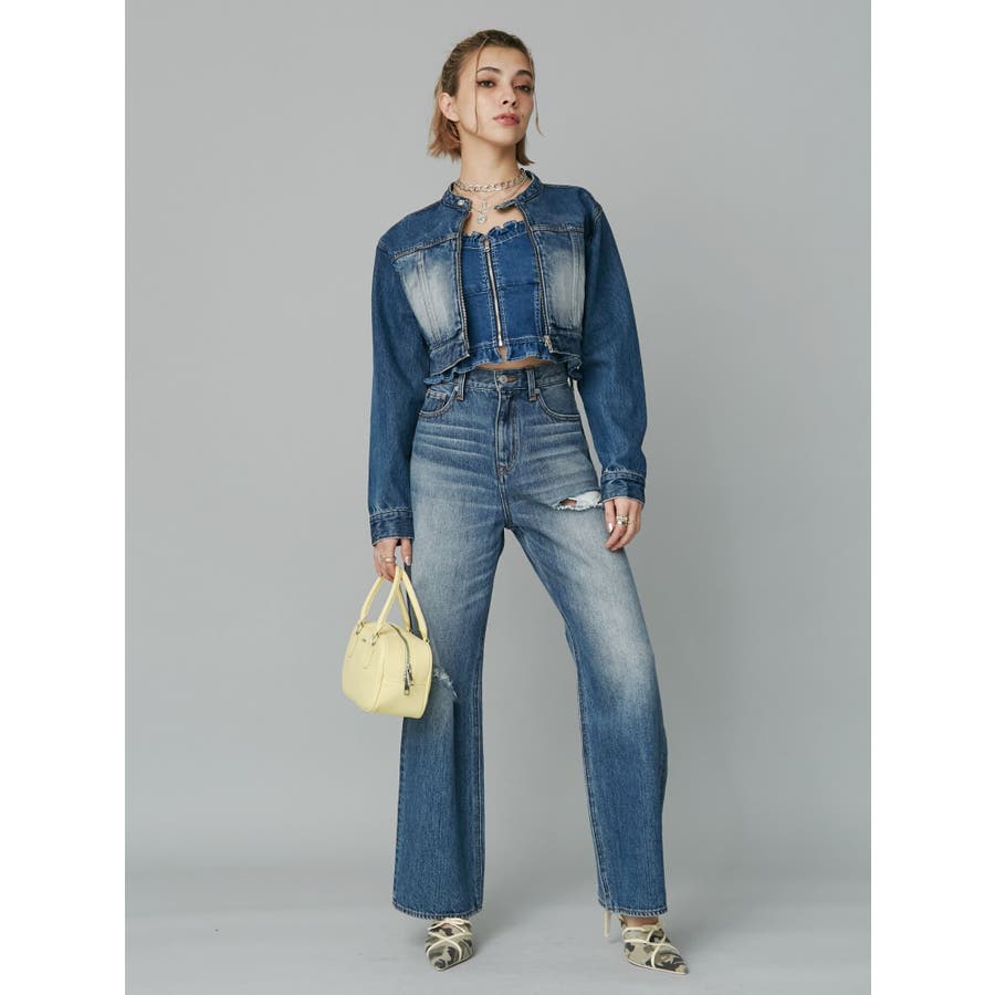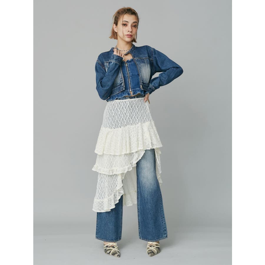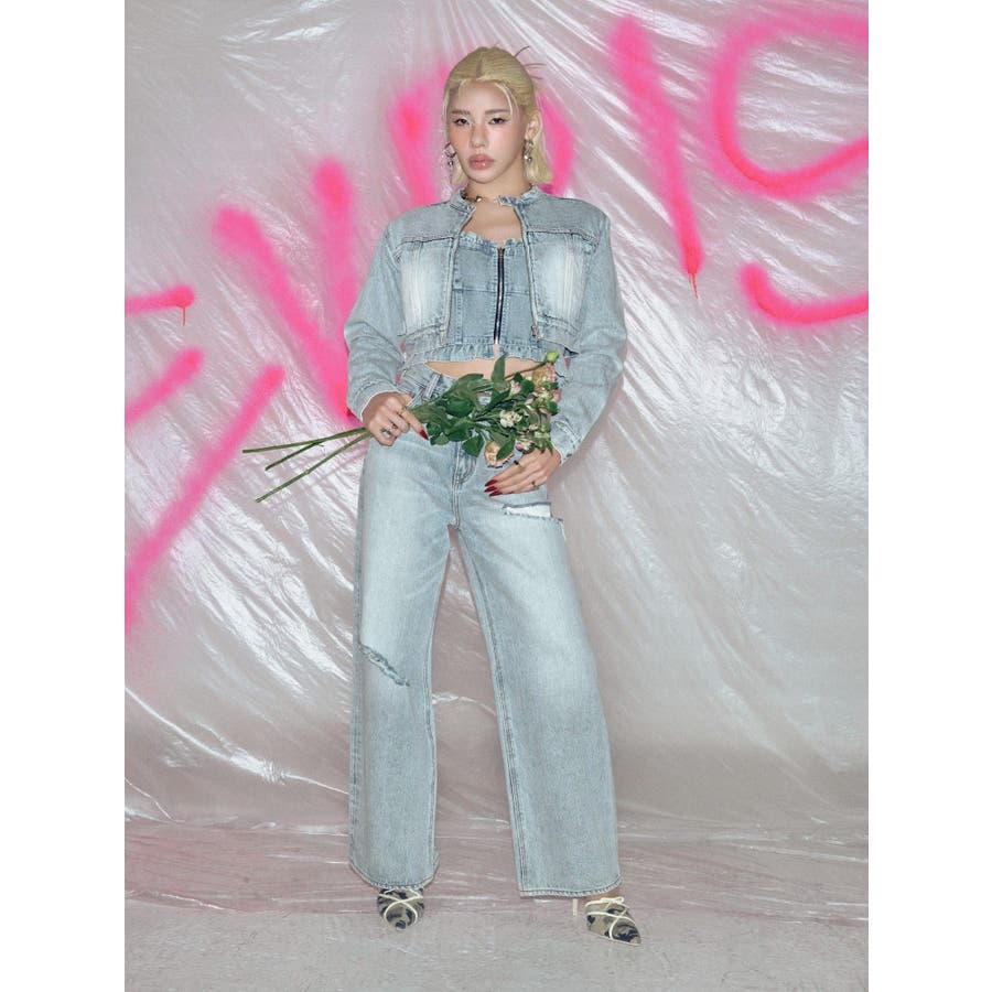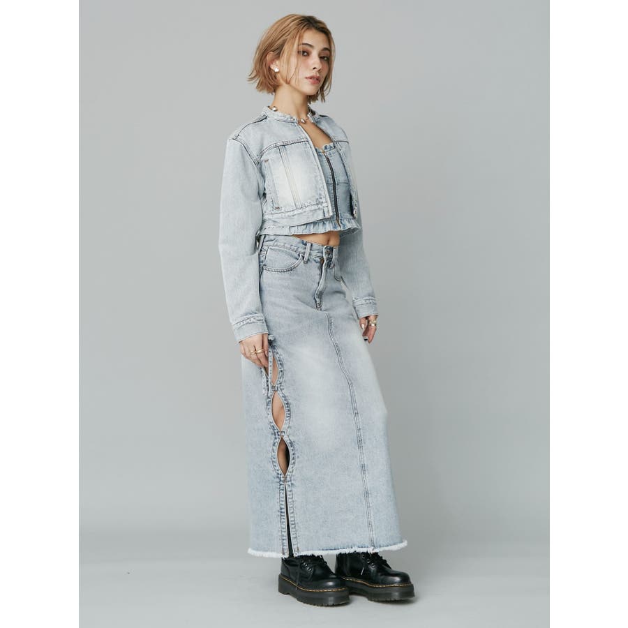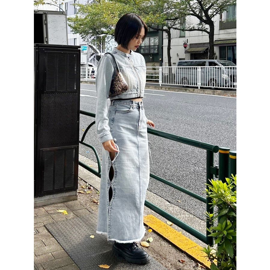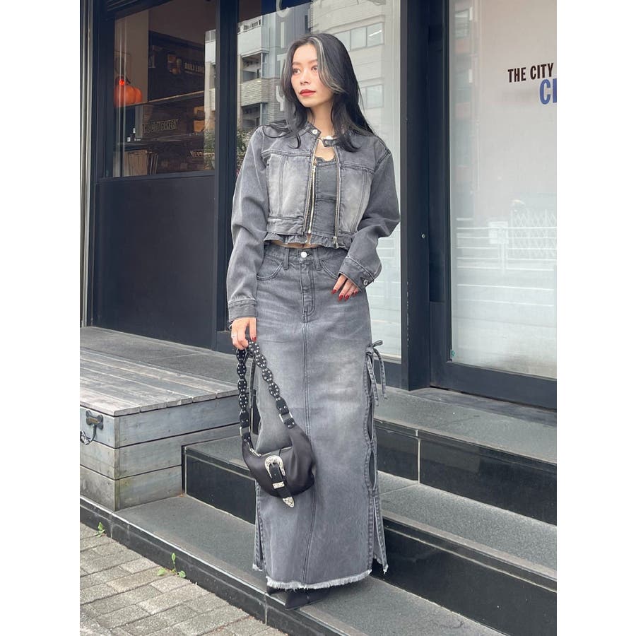 ■デザイン今季トレンドのバイカー風デザインのデニムブルゾンです。袖周りやバストなど少しタイトなシルエットにしており、ジップを閉めて着用したときのシルエットが綺麗な一枚。同素材でパンツ、スカート、ビスチェのご用意があり、お好きなスタイリングをお楽しみいただけます。■セットアップアイテム>>サイドカッティングワイドデニム>>サイドリボンカットロングデニムスカート>>デニムフリルビスチェ■スタイリングセットアップでの着用はもちろん、単体でも着回しが効くのが魅力のデニムジャケット。レディライクなワンピースなどに合わせるのが今年らしくおすすめです。-------------- 透け感:なし生地の厚み:普通伸縮性:なし --------------