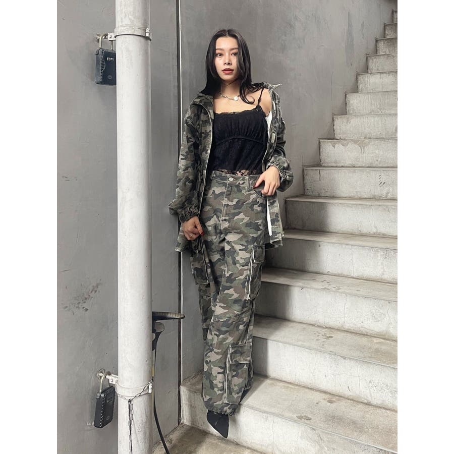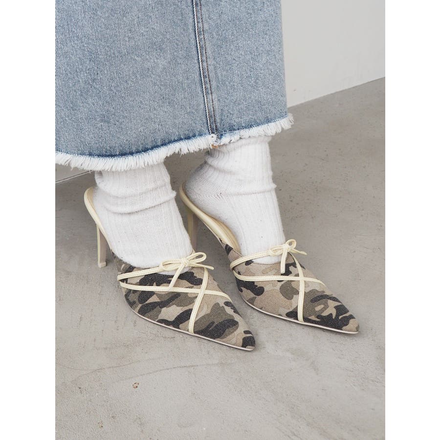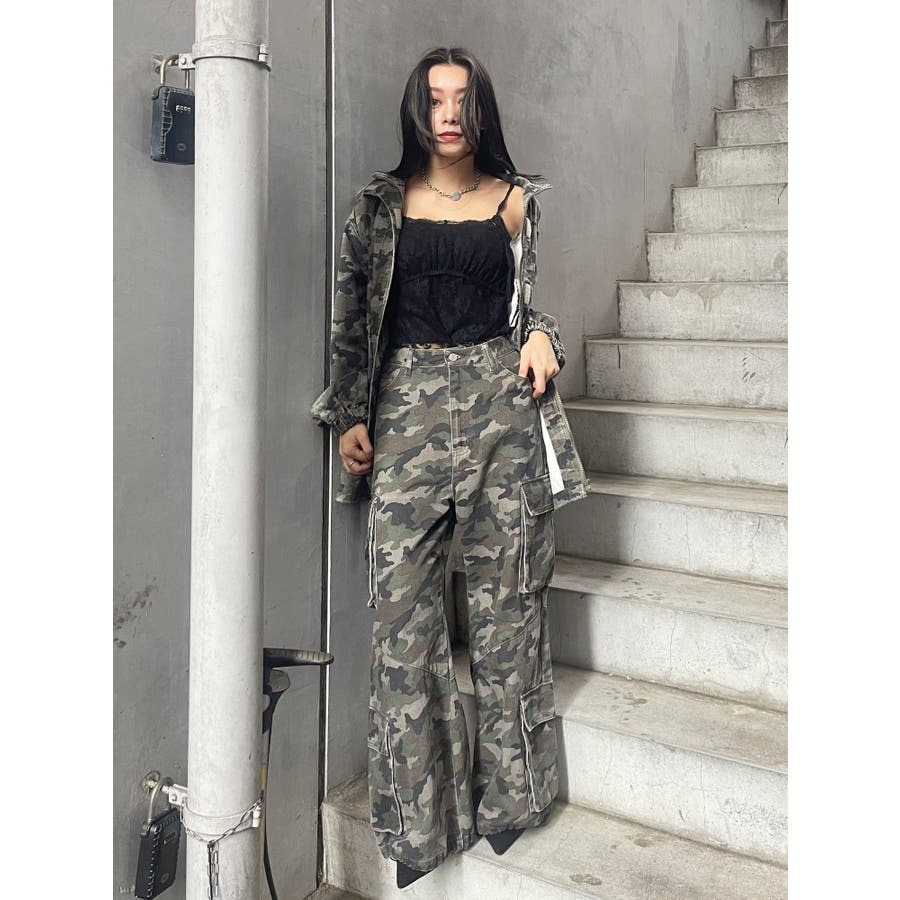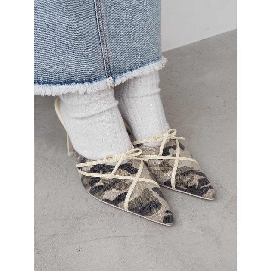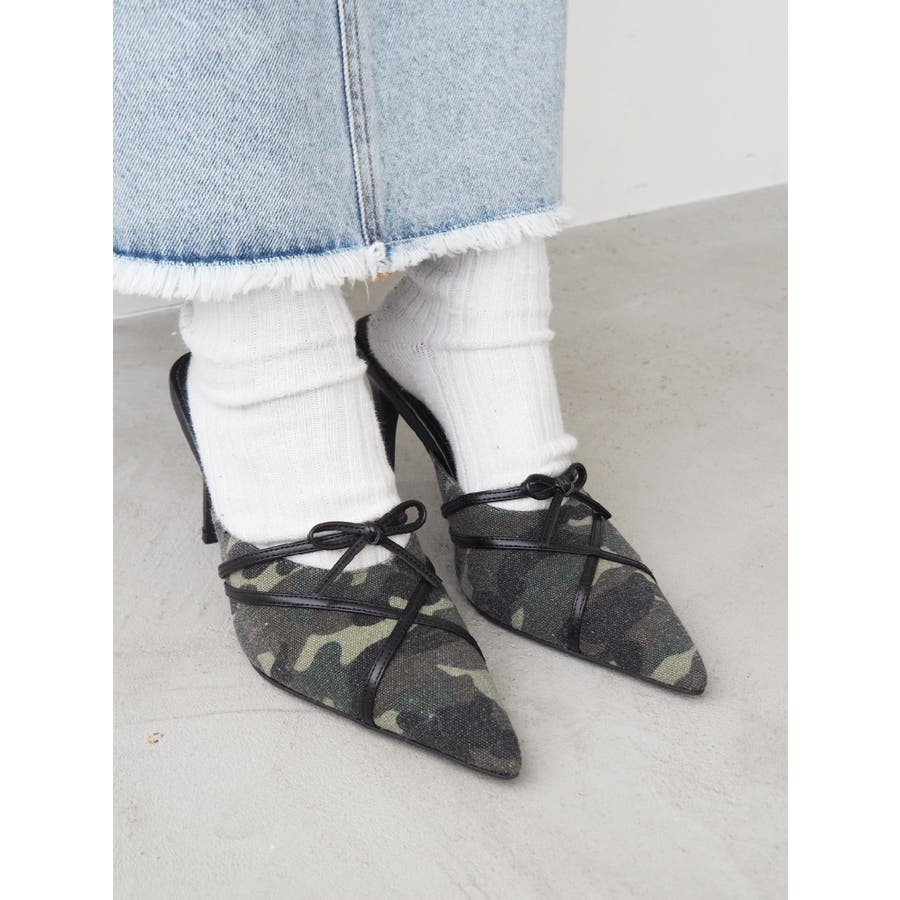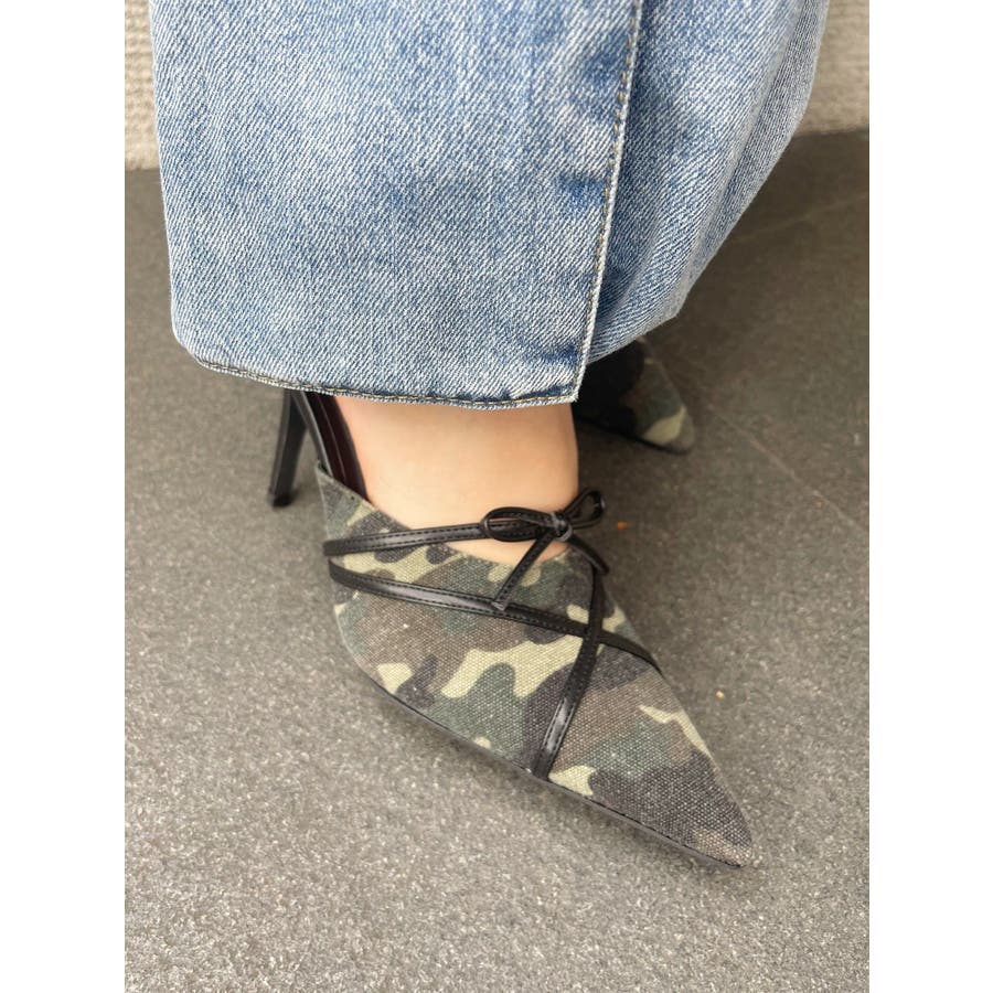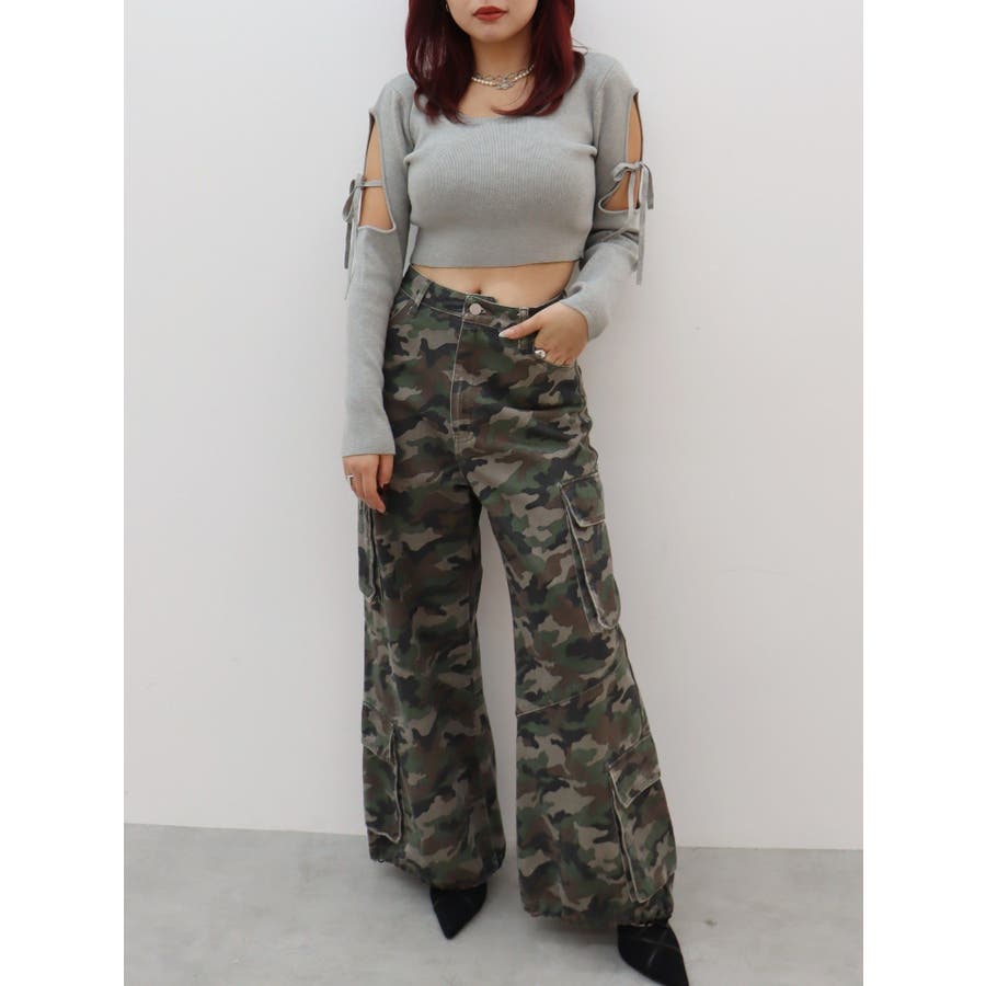 色褪せた迷彩生地のカジュアルな生地にレースアップ風のリボンモチーフで、甘辛ミックスなデザインがポイント。
