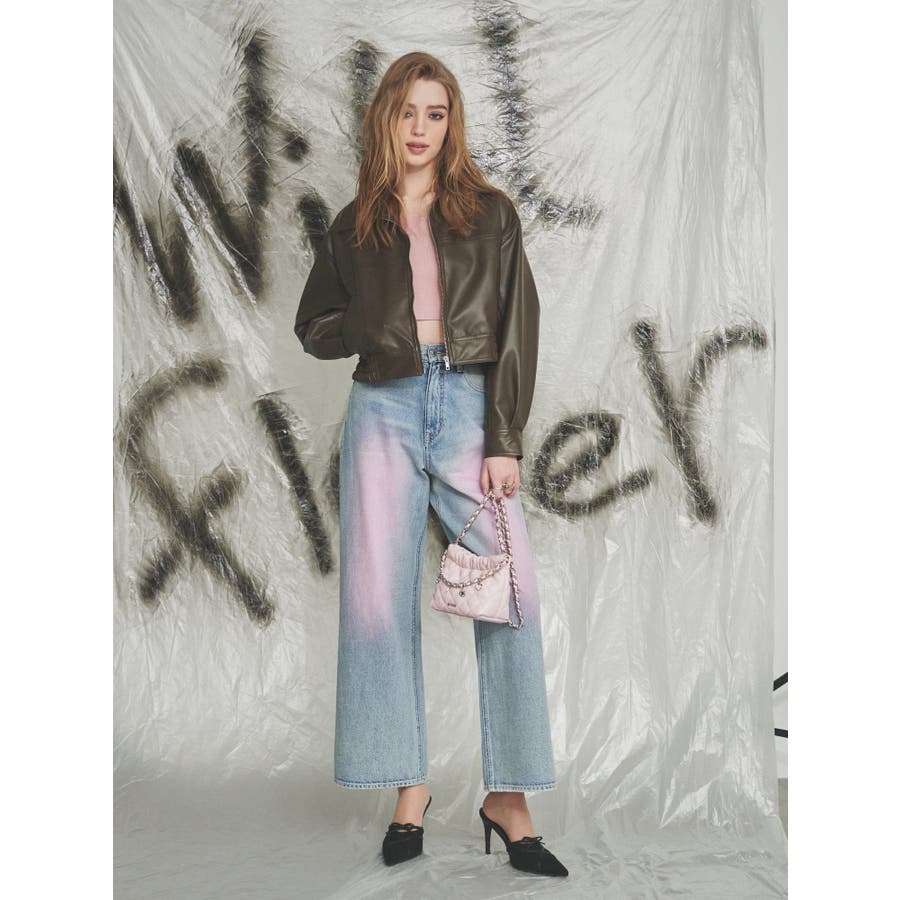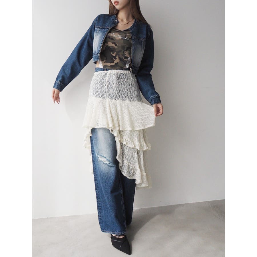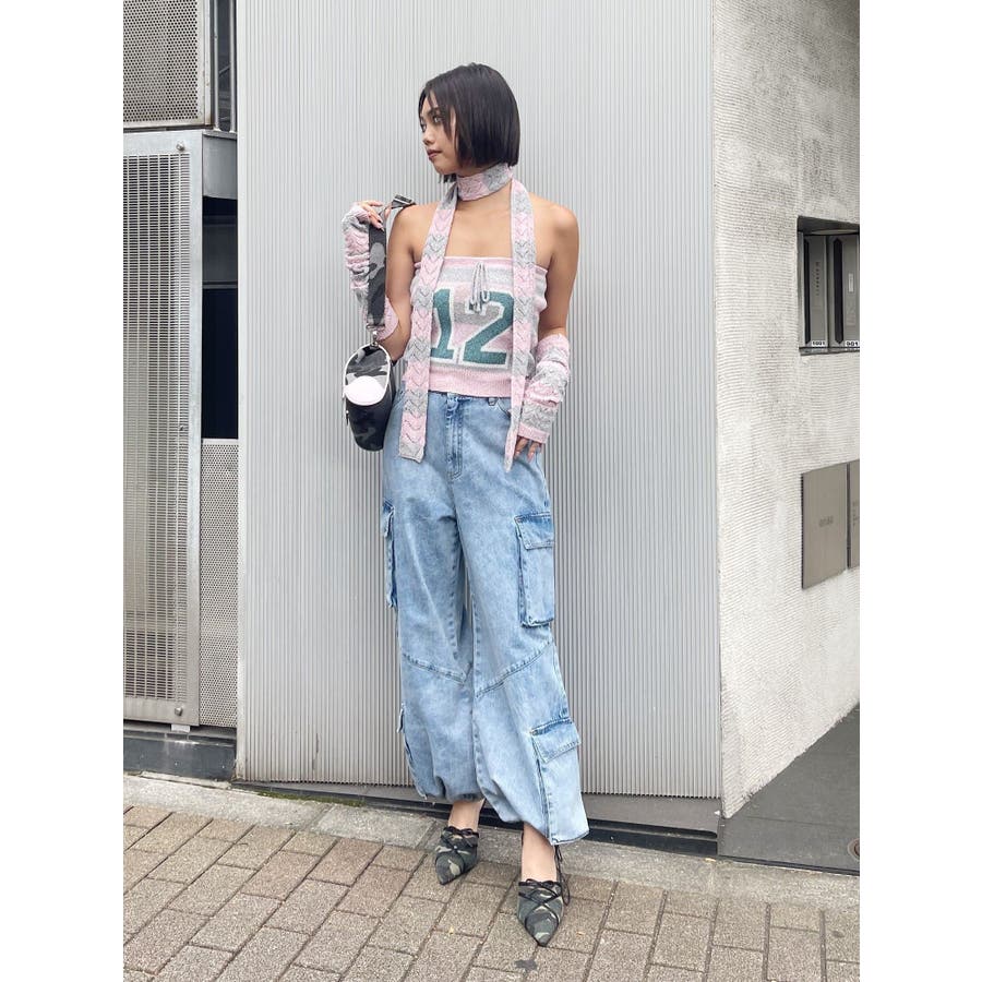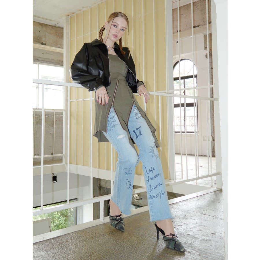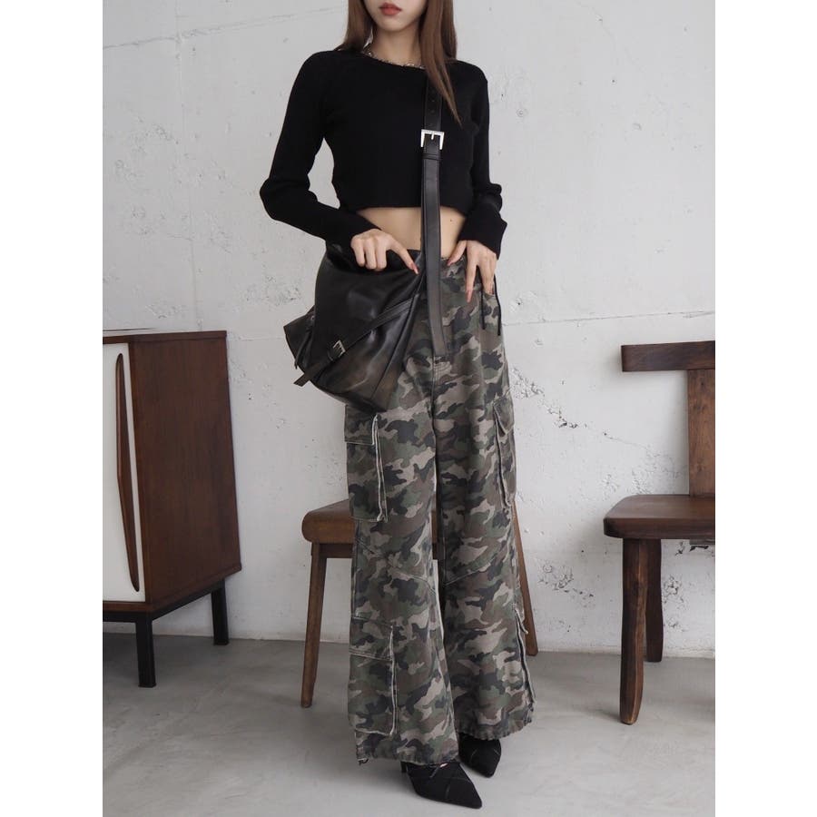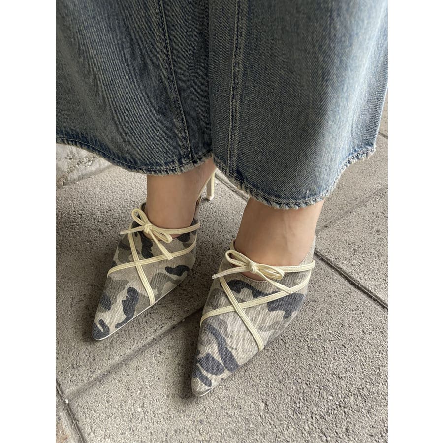 色褪せた迷彩生地のカジュアルな生地にレースアップ風のリボンモチーフで、甘辛ミックスなデザインがポイント。