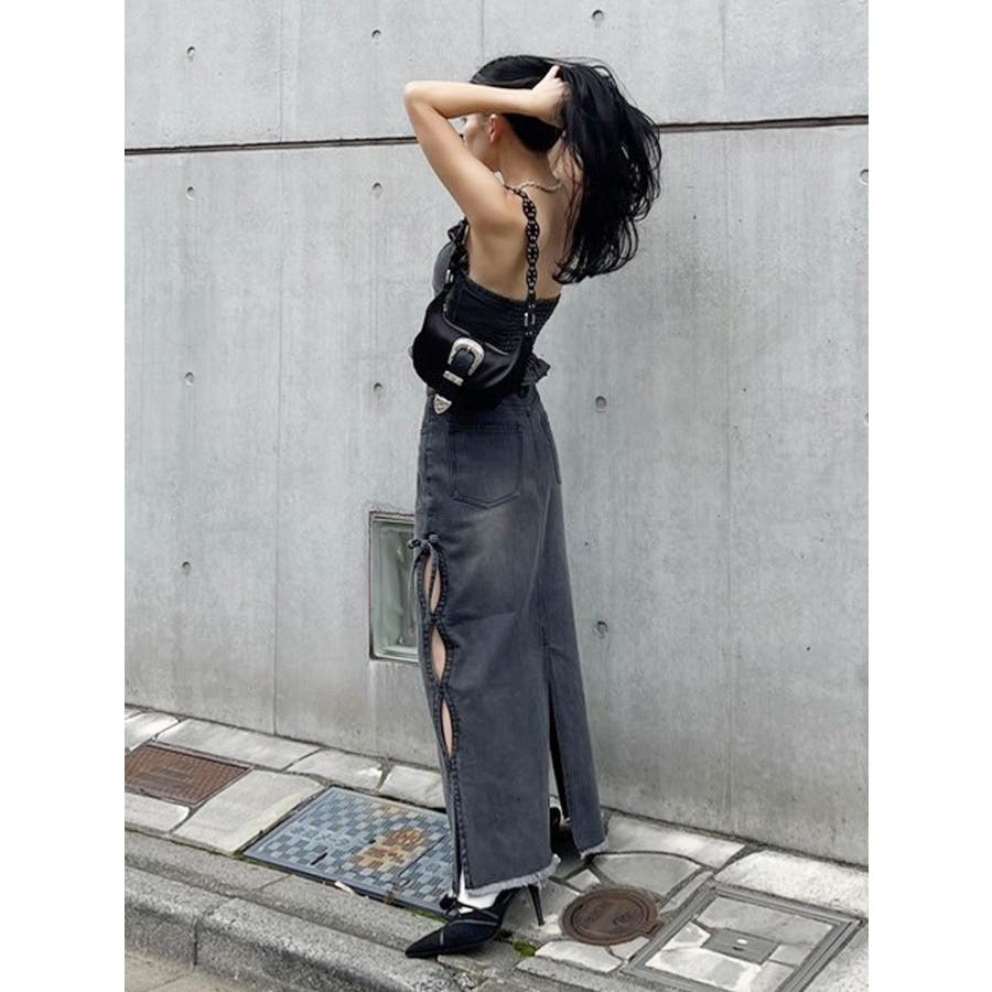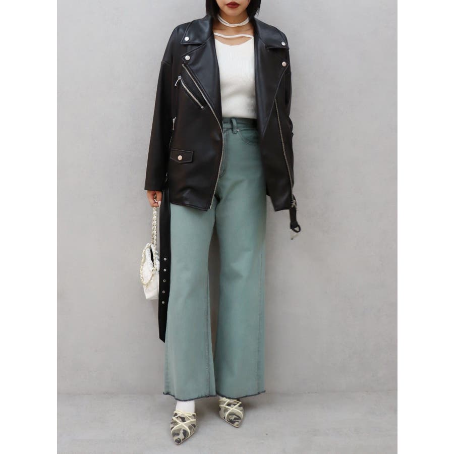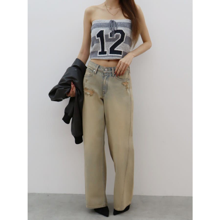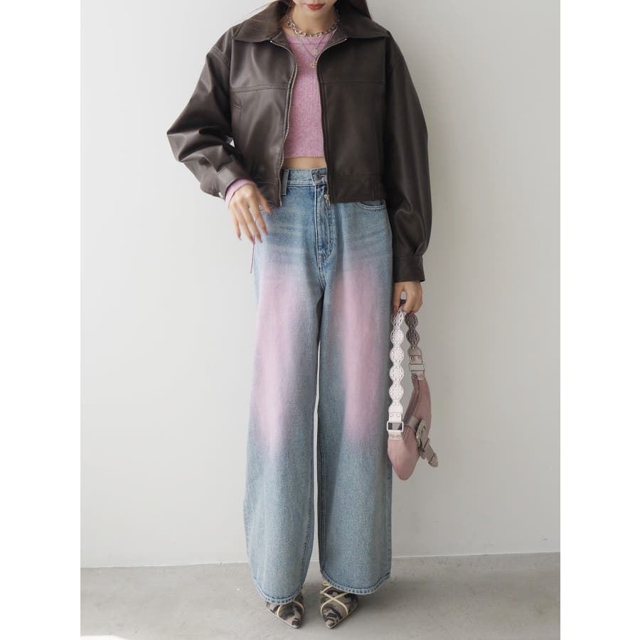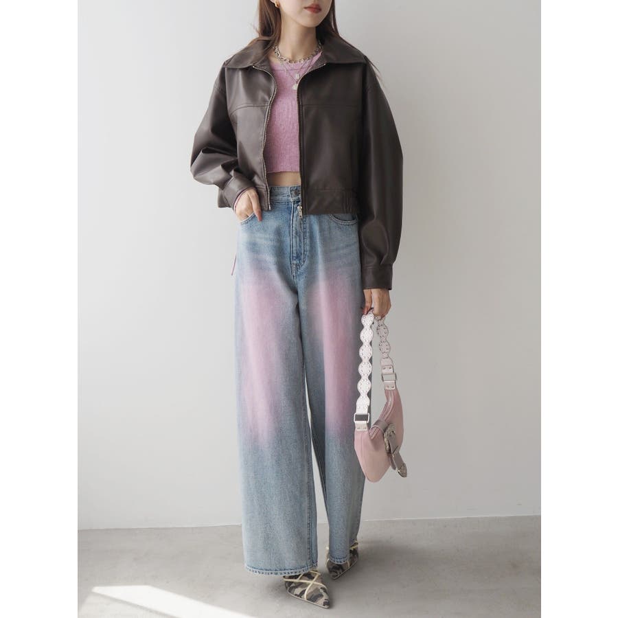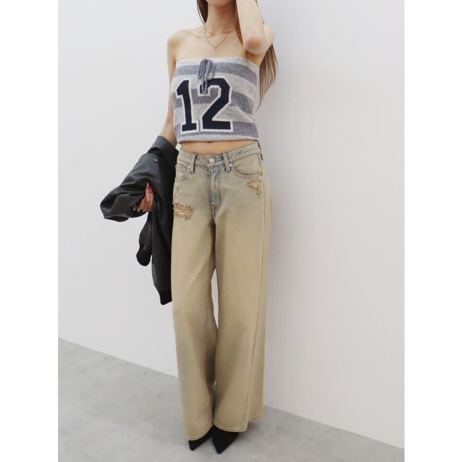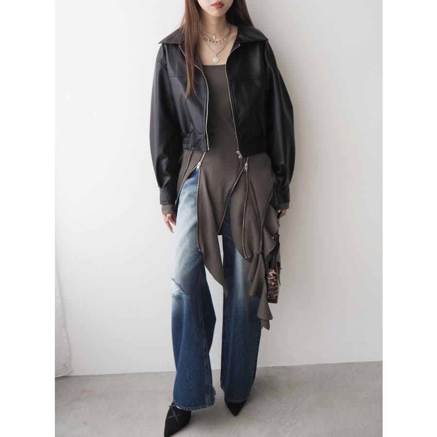 色褪せた迷彩生地のカジュアルな生地にレースアップ風のリボンモチーフで、甘辛ミックスなデザインがポイント。