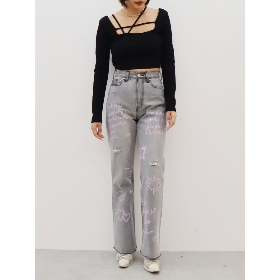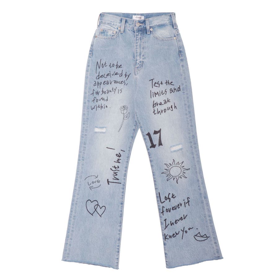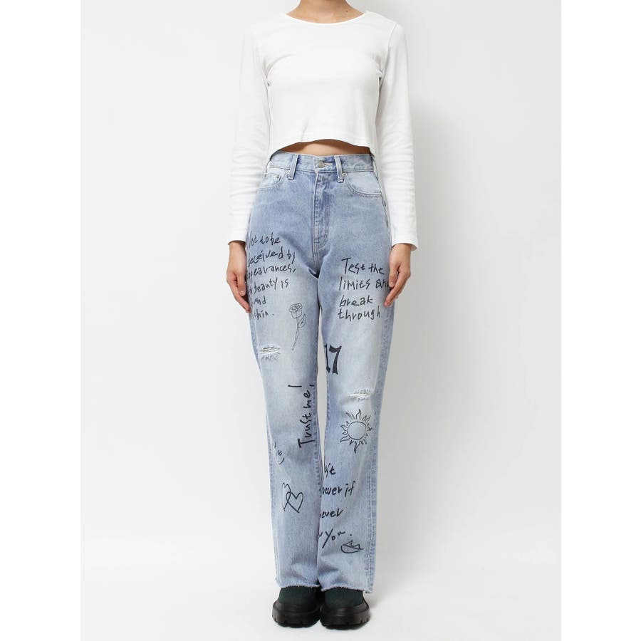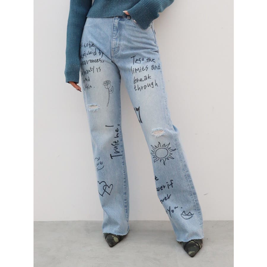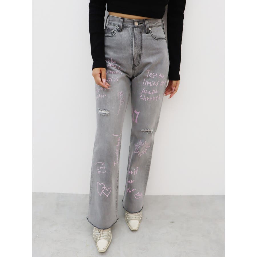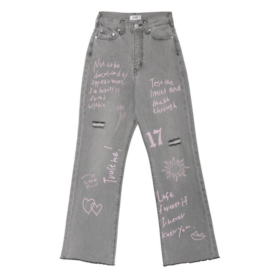 ■デザインフロントにペイント風のグラフィックを施したデニムパンツです。シーズンのキーデティールでもある、ペイントのグラフィックがEVRIS(エヴリス)らしい唯一無二のアイテム。形は腰回りをしっかりと綺麗に包み込むストレートタイプ。裾の切りっぱなしやペイント、薄めのカラーでカジュアルな印象に。ハイウエストなのでスタイルアップも◎■スタイリングデニムのデザインを活かした、シンプルなクロップド丈のニットなどがおすすめ。>>グラフィックオーバーサイズチェックジャケットとの合わせもおすすめです。ブラックにはピンクのペイント、ブルーにはブラックのペイントを施していますので、ペイントカラーにあわせたトップスでのコーディネートだと全体的にまとまります。春夏は、シンプルにロンTやTシャツ一枚でも様になるデニムです。-------------- 透け感:なし生地の厚み:普通伸縮性:なし --------------