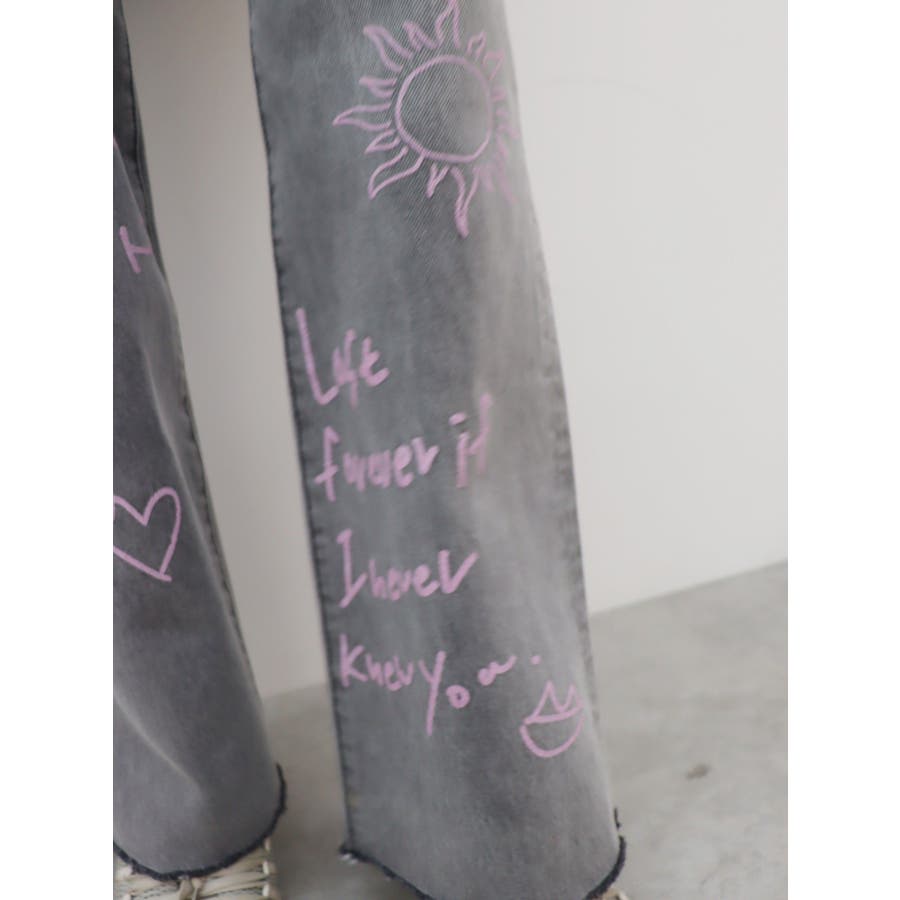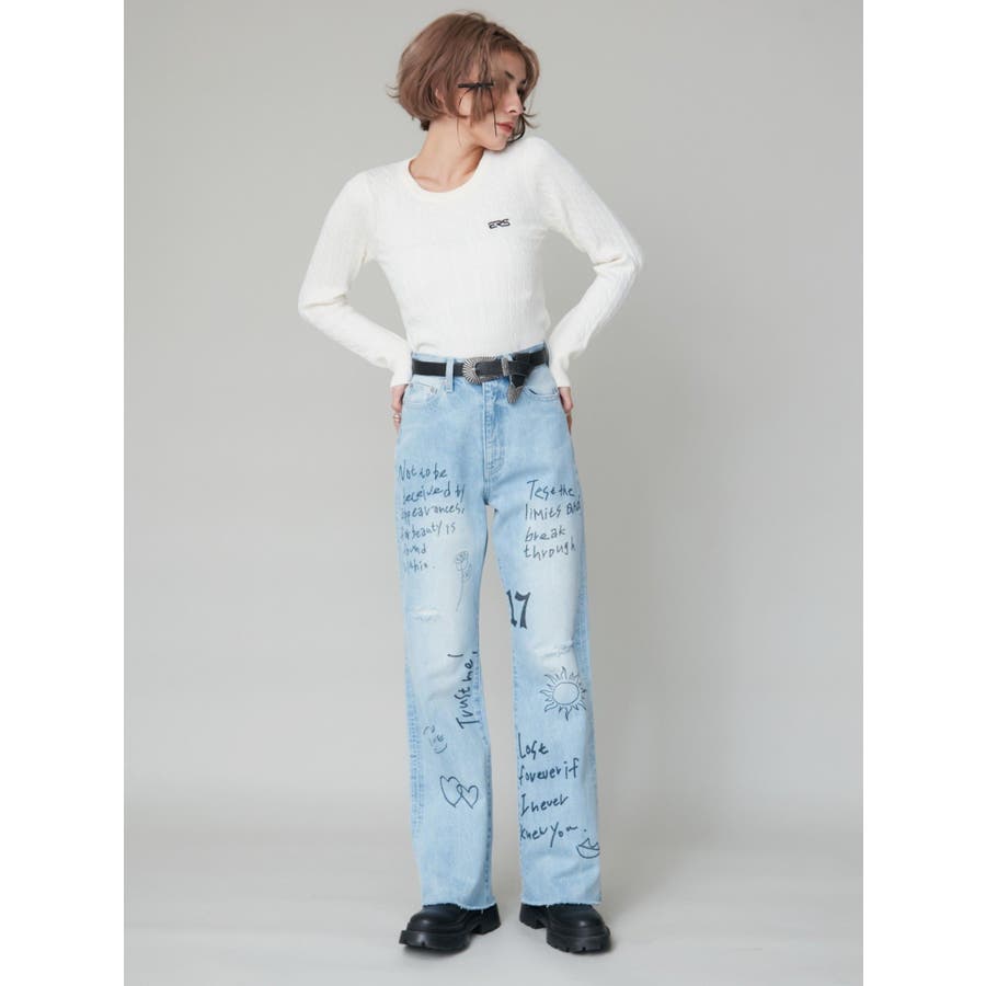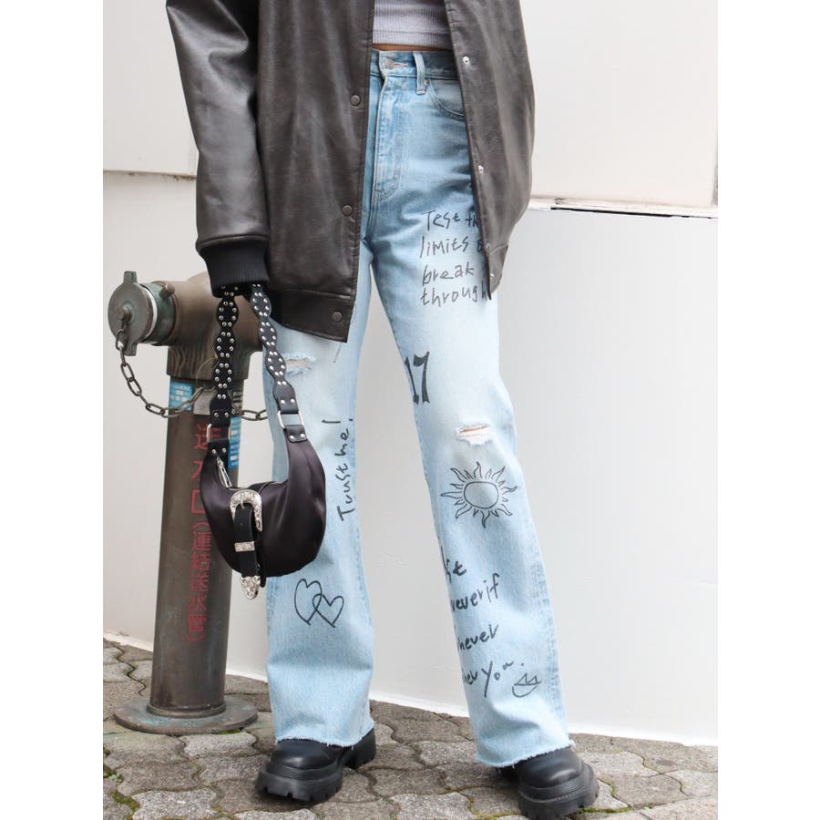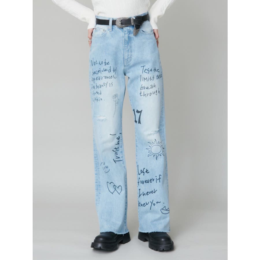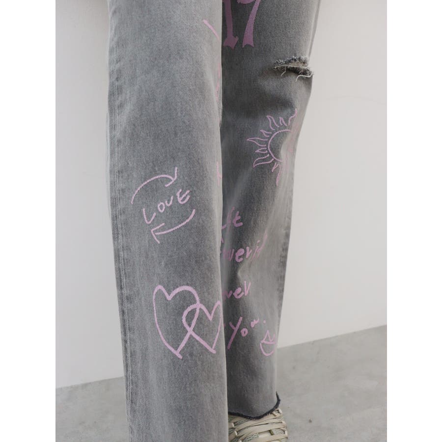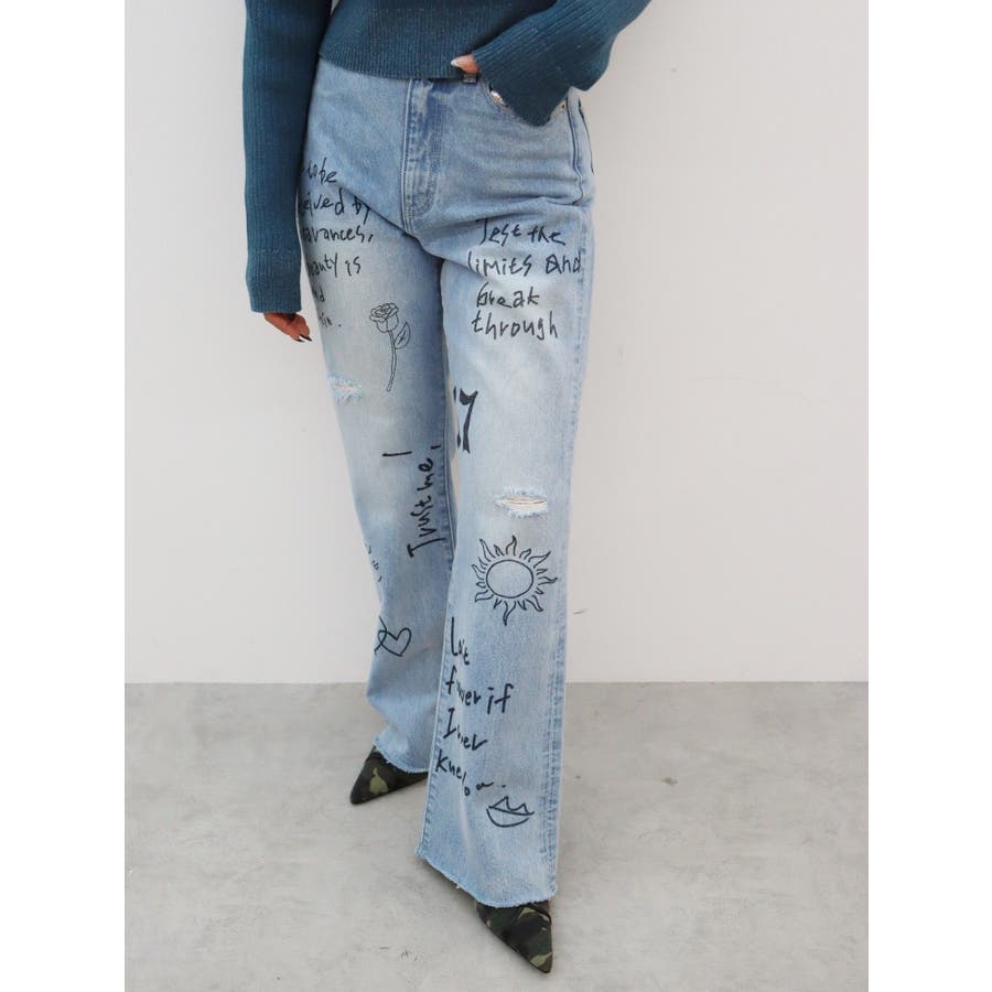 ■デザインフロントにペイント風のグラフィックを施したデニムパンツです。シーズンのキーデティールでもある、ペイントのグラフィックがEVRIS(エヴリス)らしい唯一無二のアイテム。形は腰回りをしっかりと綺麗に包み込むストレートタイプ。裾の切りっぱなしやペイント、薄めのカラーでカジュアルな印象に。ハイウエストなのでスタイルアップも◎■スタイリングデニムのデザインを活かした、シンプルなクロップド丈のニットなどがおすすめ。>>グラフィックオーバーサイズチェックジャケットとの合わせもおすすめです。ブラックにはピンクのペイント、ブルーにはブラックのペイントを施していますので、ペイントカラーにあわせたトップスでのコーディネートだと全体的にまとまります。春夏は、シンプルにロンTやTシャツ一枚でも様になるデニムです。-------------- 透け感:なし生地の厚み:普通伸縮性:なし --------------
