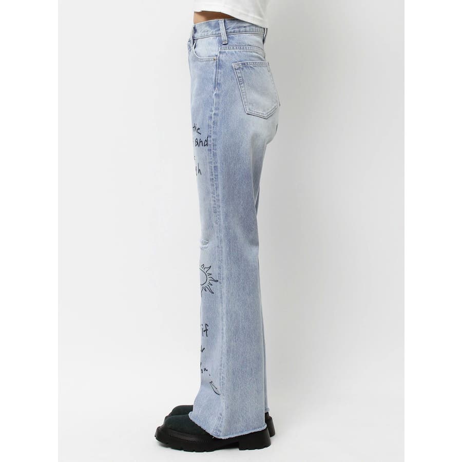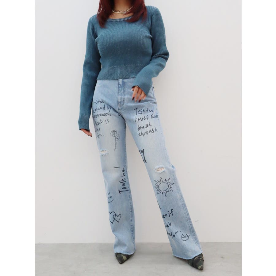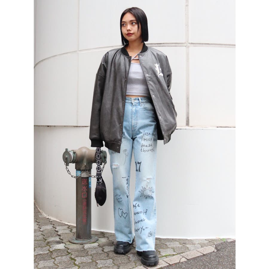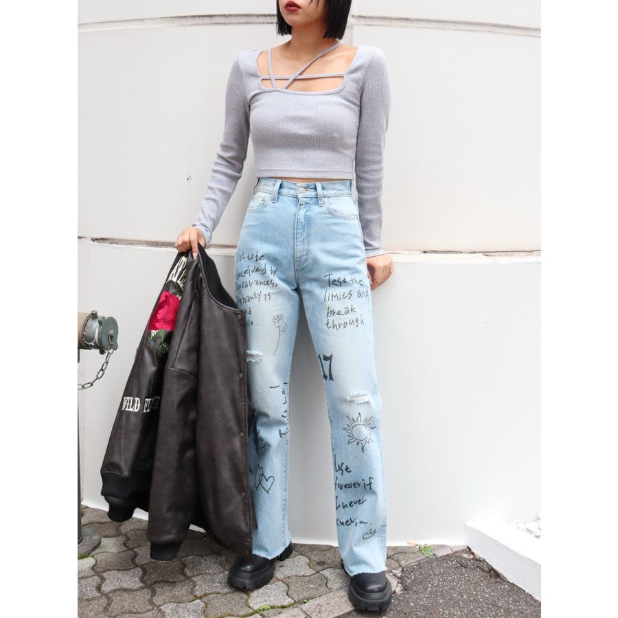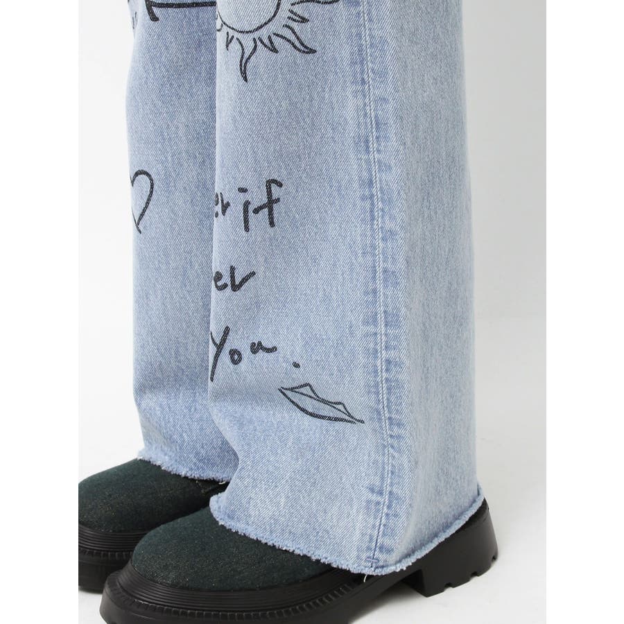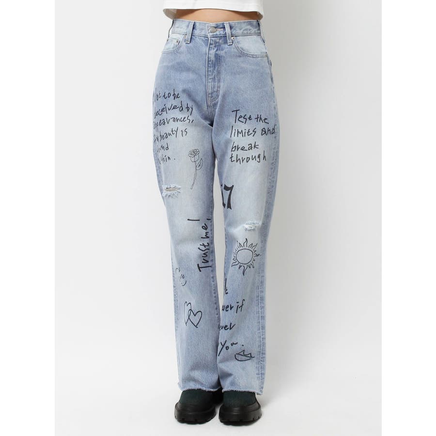 ■デザインフロントにペイント風のグラフィックを施したデニムパンツです。シーズンのキーデティールでもある、ペイントのグラフィックがEVRIS(エヴリス)らしい唯一無二のアイテム。形は腰回りをしっかりと綺麗に包み込むストレートタイプ。裾の切りっぱなしやペイント、薄めのカラーでカジュアルな印象に。ハイウエストなのでスタイルアップも◎■スタイリングデニムのデザインを活かした、シンプルなクロップド丈のニットなどがおすすめ。>>グラフィックオーバーサイズチェックジャケットとの合わせもおすすめです。ブラックにはピンクのペイント、ブルーにはブラックのペイントを施していますので、ペイントカラーにあわせたトップスでのコーディネートだと全体的にまとまります。春夏は、シンプルにロンTやTシャツ一枚でも様になるデニムです。-------------- 透け感:なし生地の厚み:普通伸縮性:なし --------------