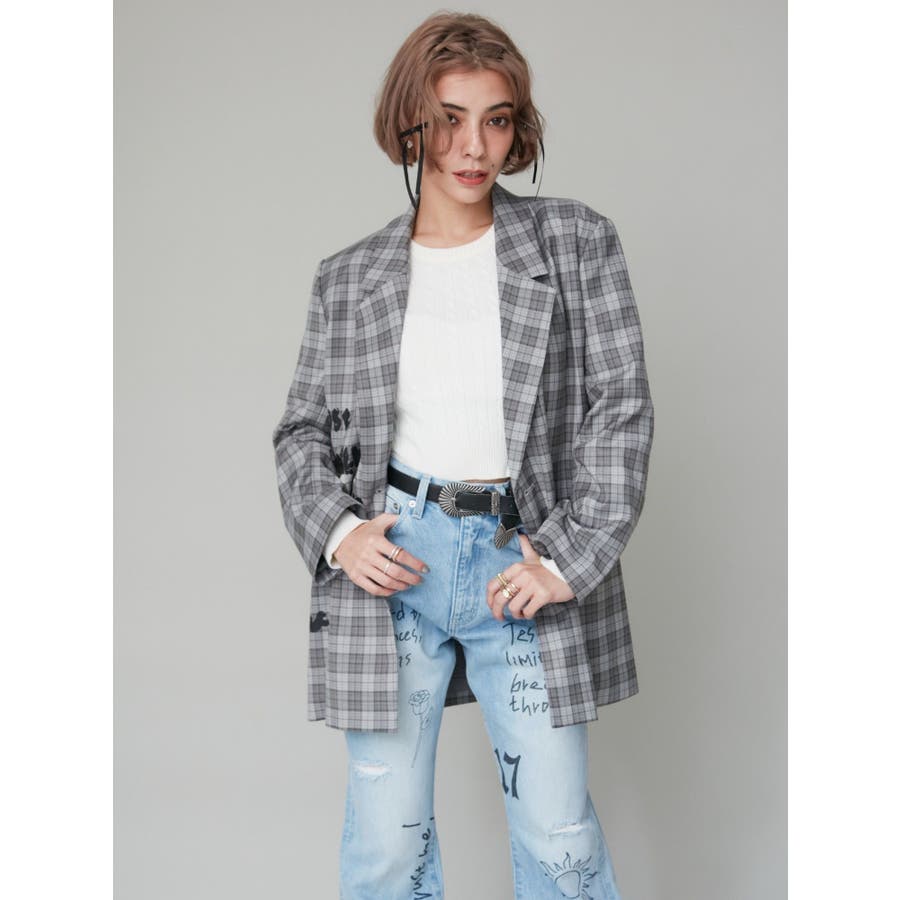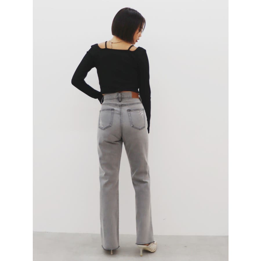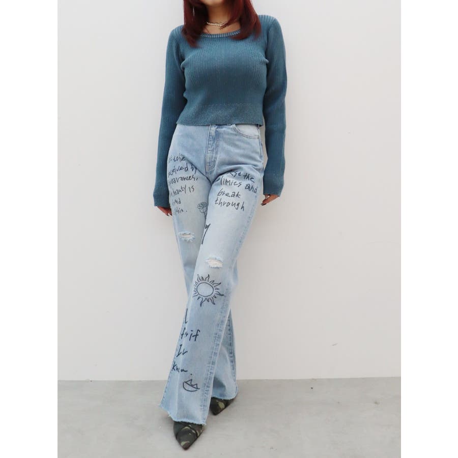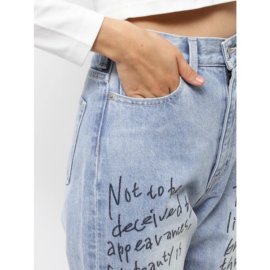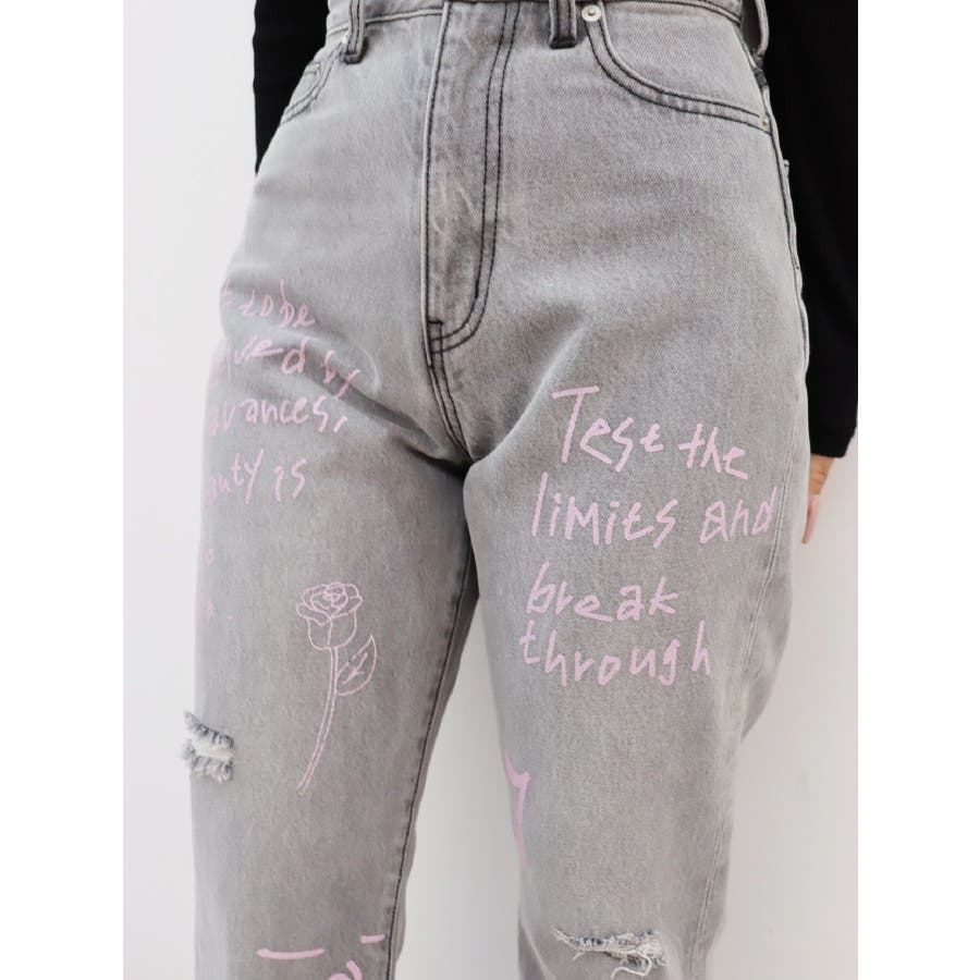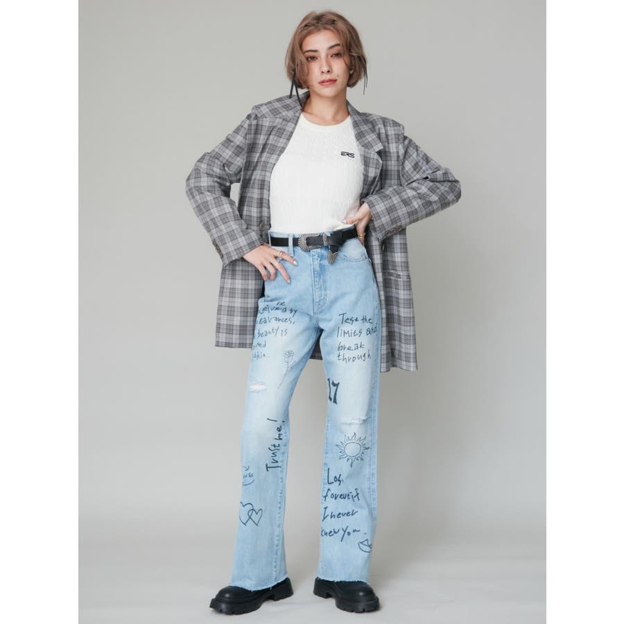 ■デザインフロントにペイント風のグラフィックを施したデニムパンツです。シーズンのキーデティールでもある、ペイントのグラフィックがEVRIS(エヴリス)らしい唯一無二のアイテム。形は腰回りをしっかりと綺麗に包み込むストレートタイプ。裾の切りっぱなしやペイント、薄めのカラーでカジュアルな印象に。ハイウエストなのでスタイルアップも◎■スタイリングデニムのデザインを活かした、シンプルなクロップド丈のニットなどがおすすめ。>>グラフィックオーバーサイズチェックジャケットとの合わせもおすすめです。ブラックにはピンクのペイント、ブルーにはブラックのペイントを施していますので、ペイントカラーにあわせたトップスでのコーディネートだと全体的にまとまります。春夏は、シンプルにロンTやTシャツ一枚でも様になるデニムです。-------------- 透け感:なし生地の厚み:普通伸縮性:なし --------------
