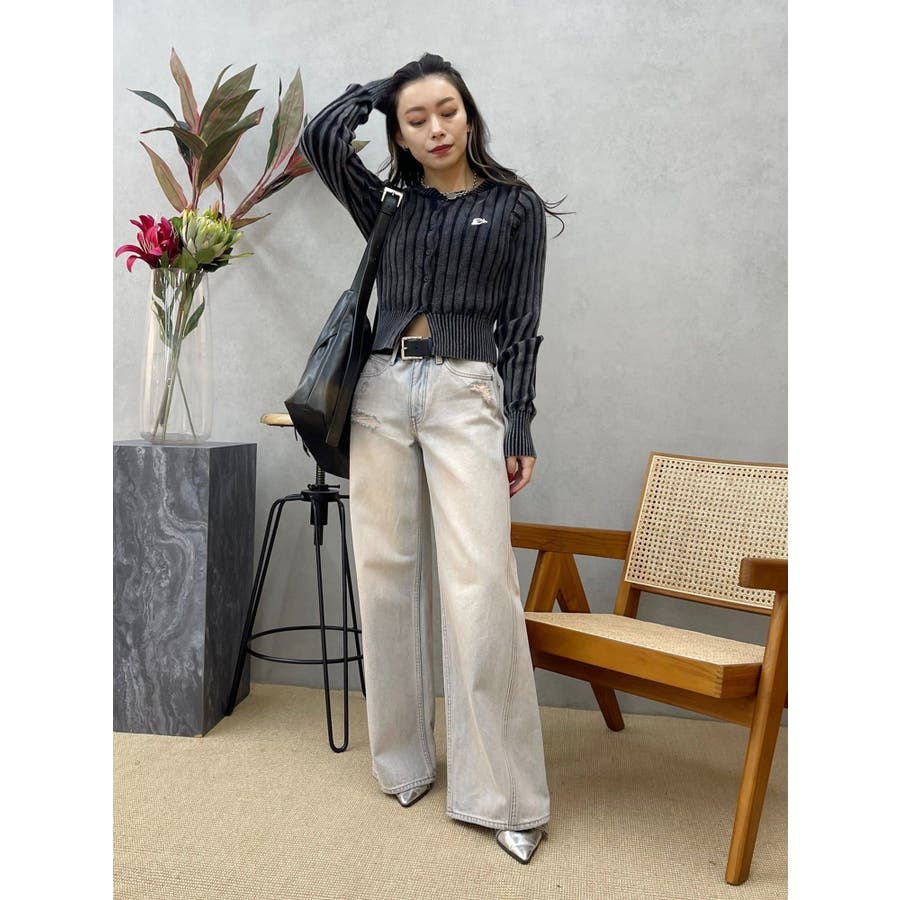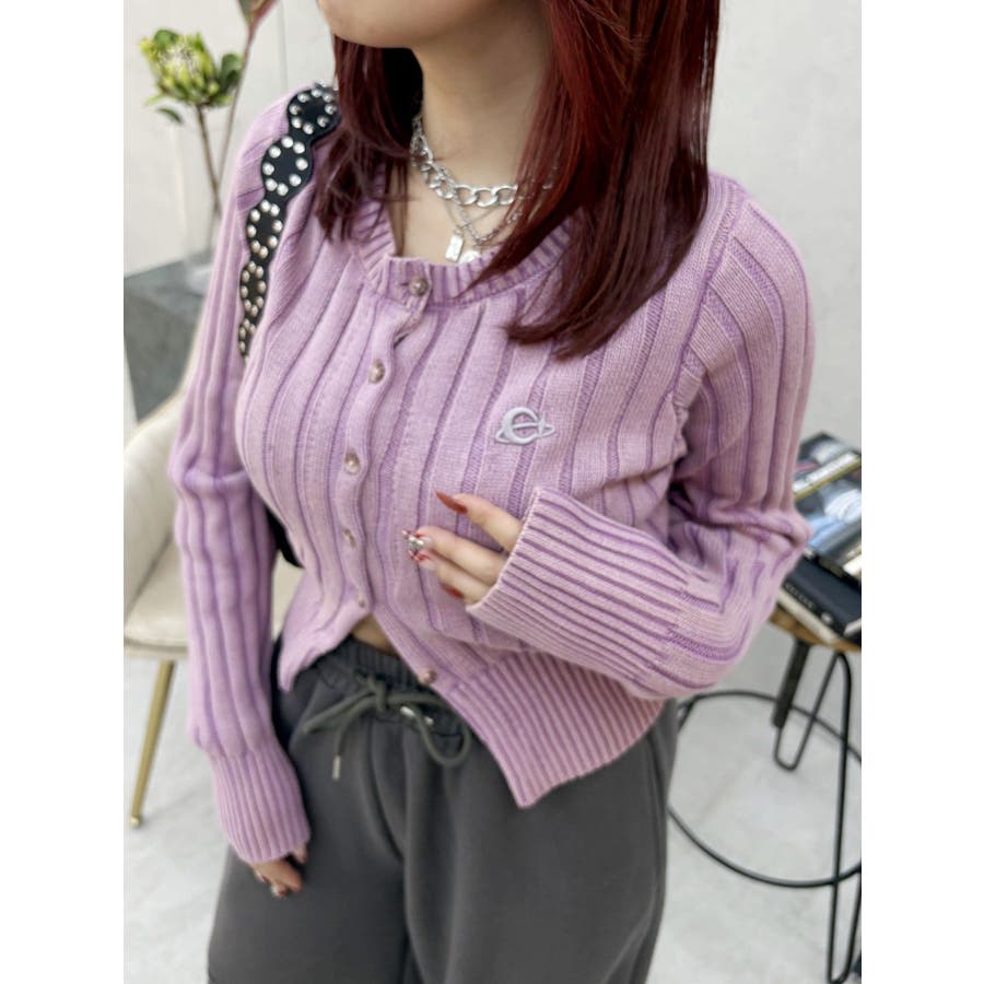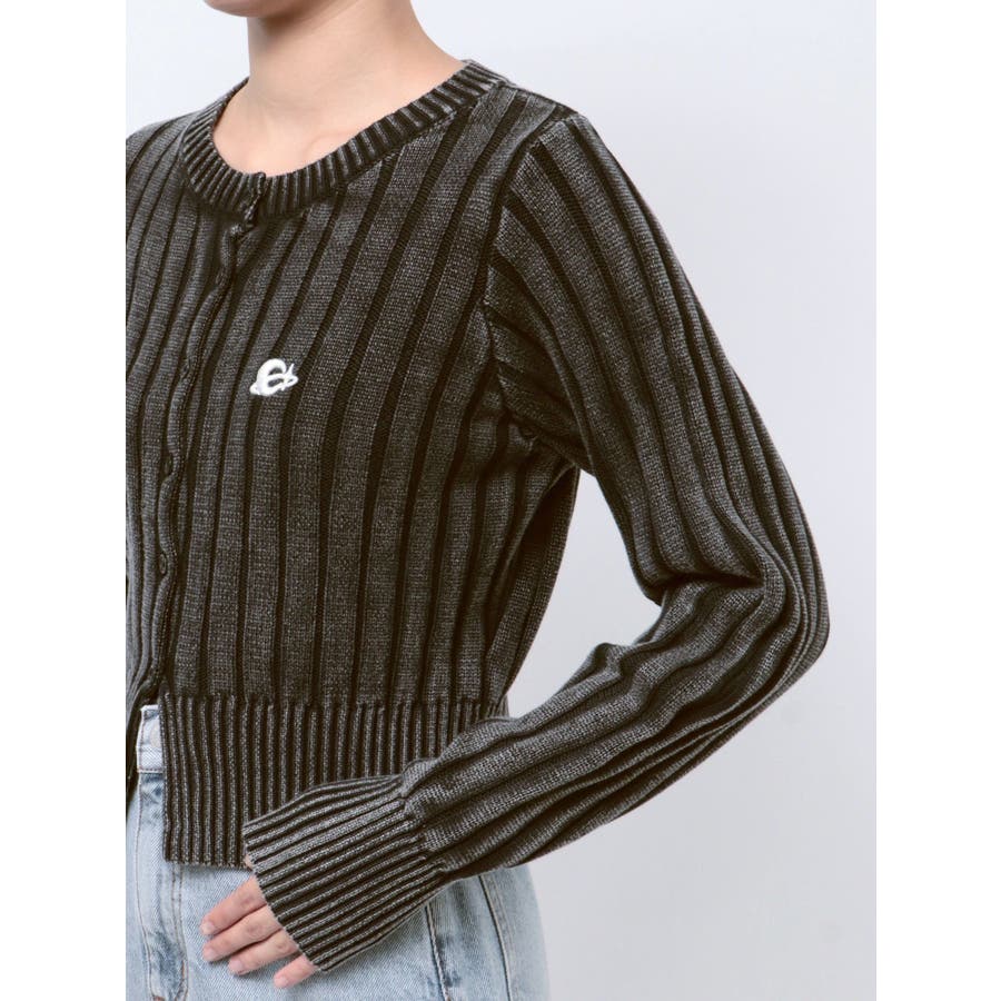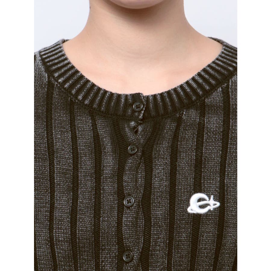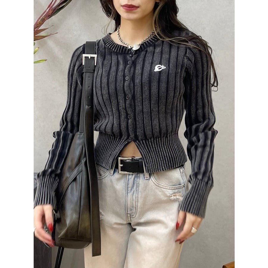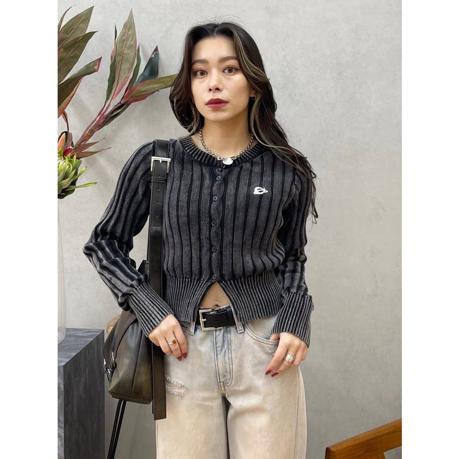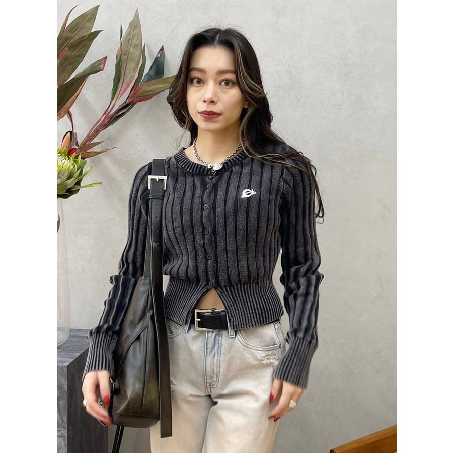 ■デザインブリーチ加工を施した、ヴィンテージ感のあるニットカーディガンです。裾は少しスリットをいれており、トレンド感のある仕上がりに。左胸のワンポイントは今季のオリジナルロゴを使用しています。※加工物なので個体差が出る可能性があります。 ■スタイリングコンパクトなサイズ感で、前を閉めてトップス風に着用できます。ワイドパンツやフレアパンツとの合わせがスタイルUPして見え、おすすめ。アウターのインナーにも着用しやすい一枚です。-------------- 透け感:なし 裏地:なし 生地の厚み:普通伸縮性:あり--------------