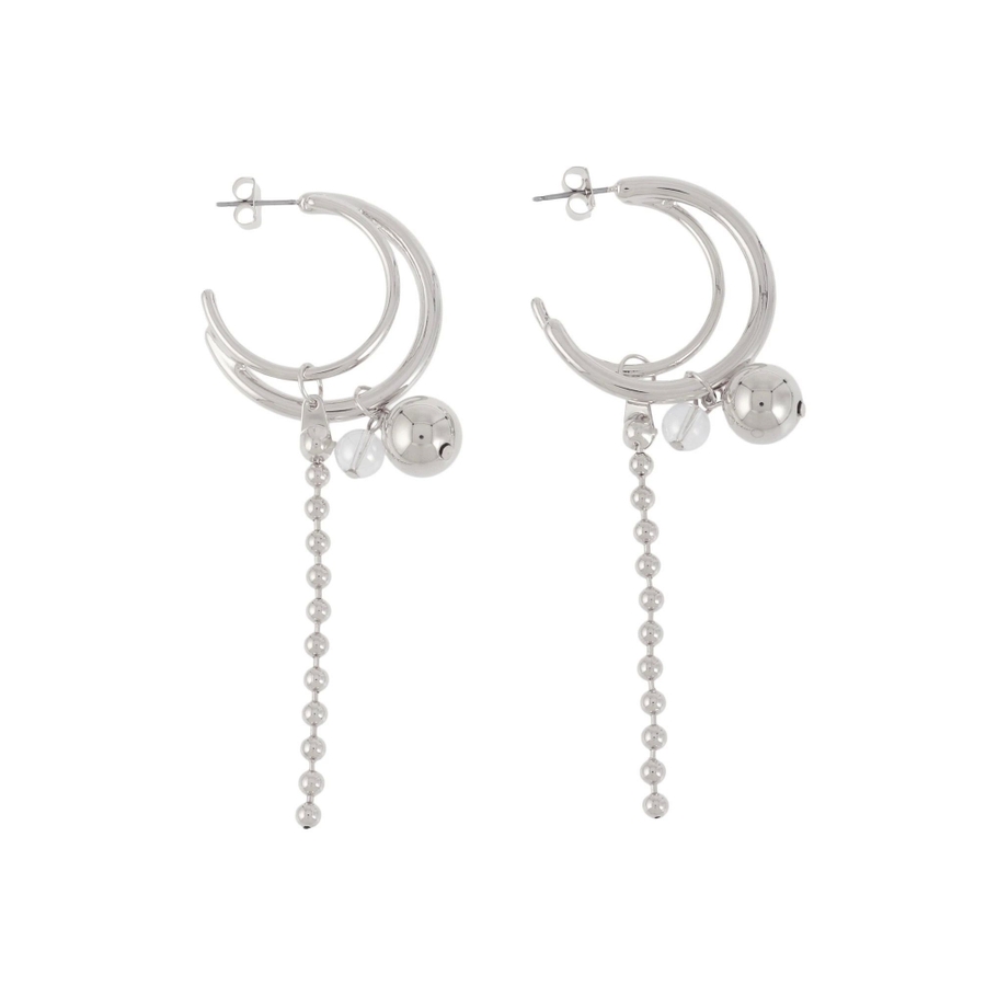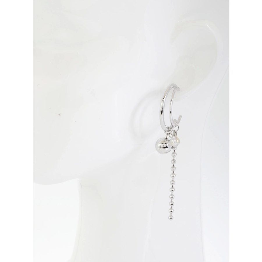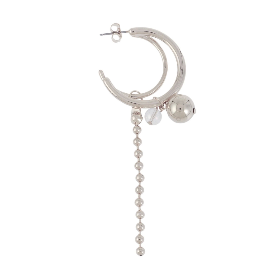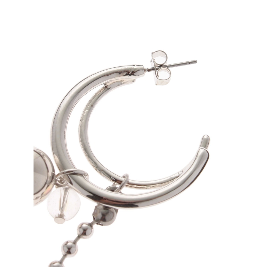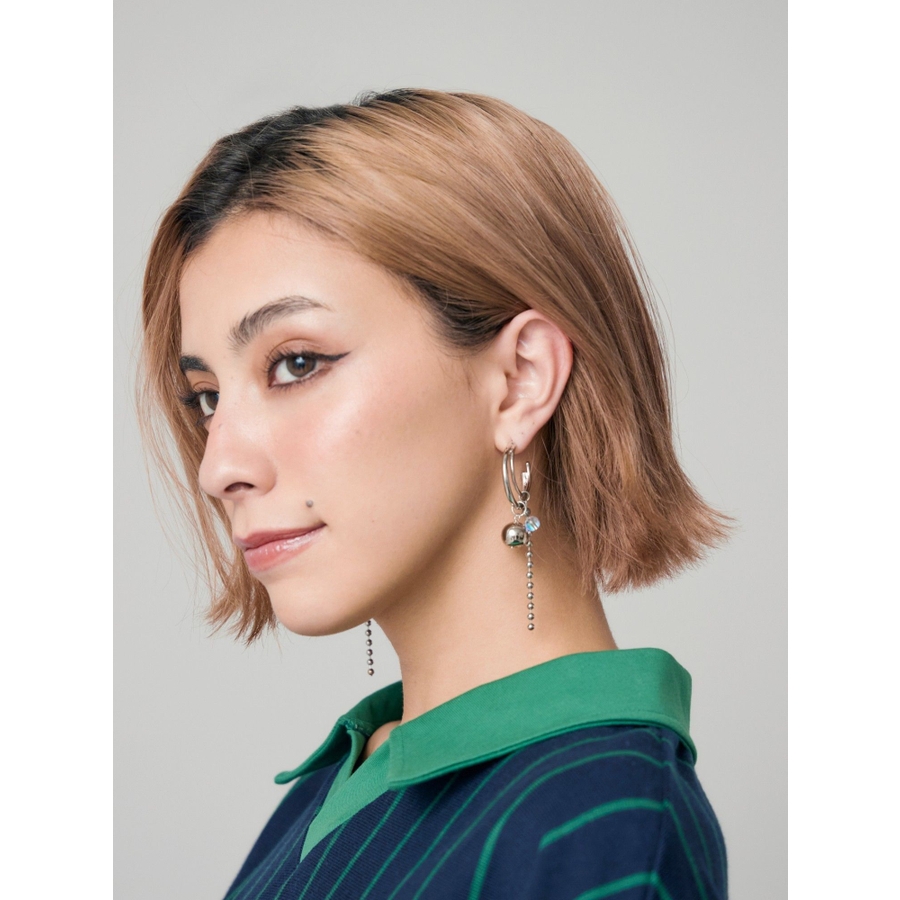 パール・ボールチェーン・クリアボールなど様々なパーツが沢山ついたピアスです。存在感のあるデザインですが、カラーの統一感があるので服に馴染みやすいアクセサリーです。