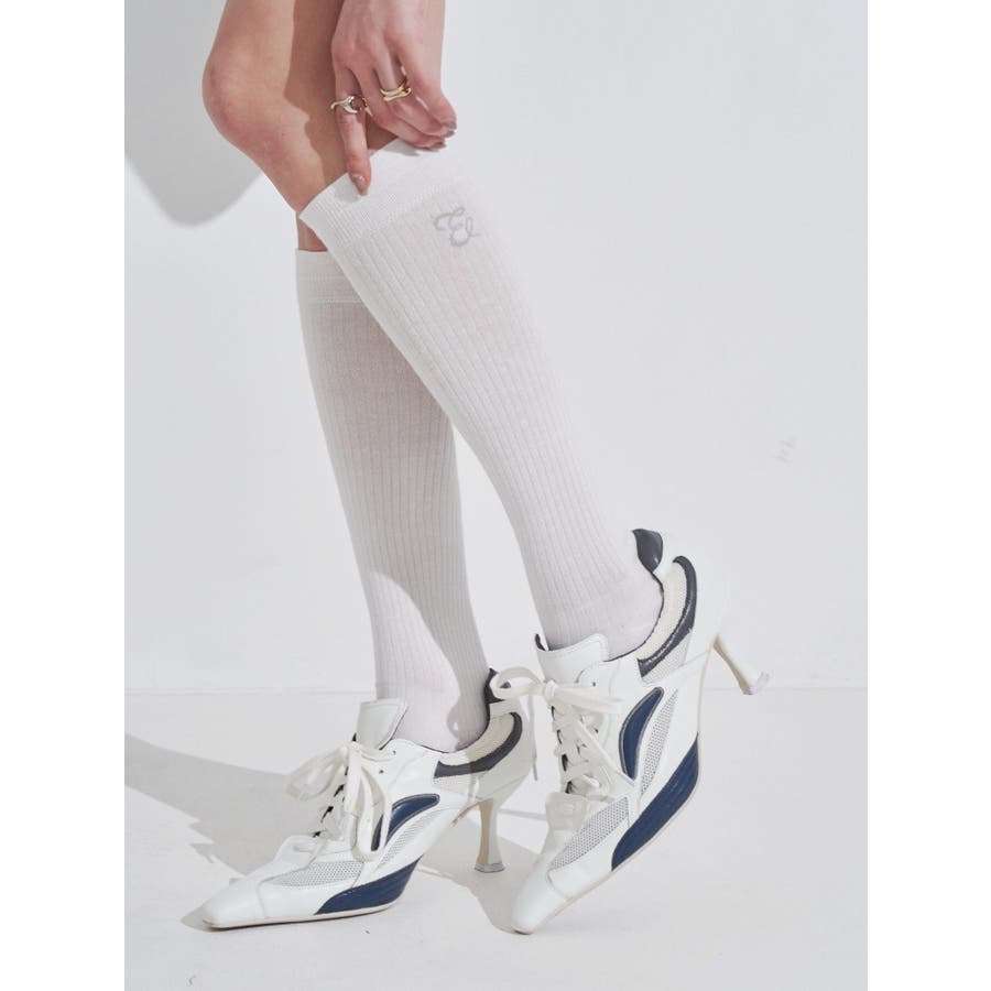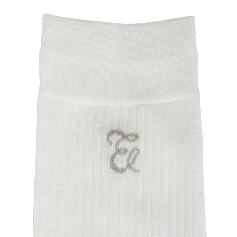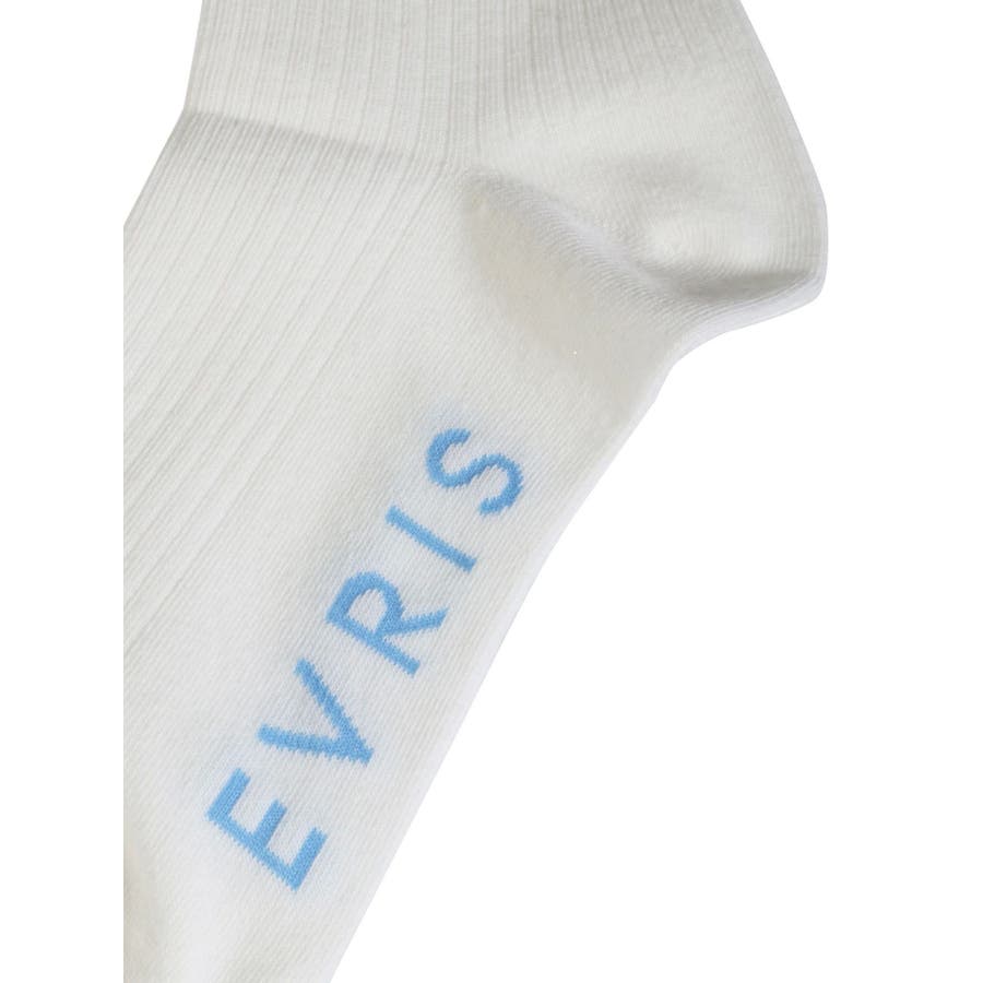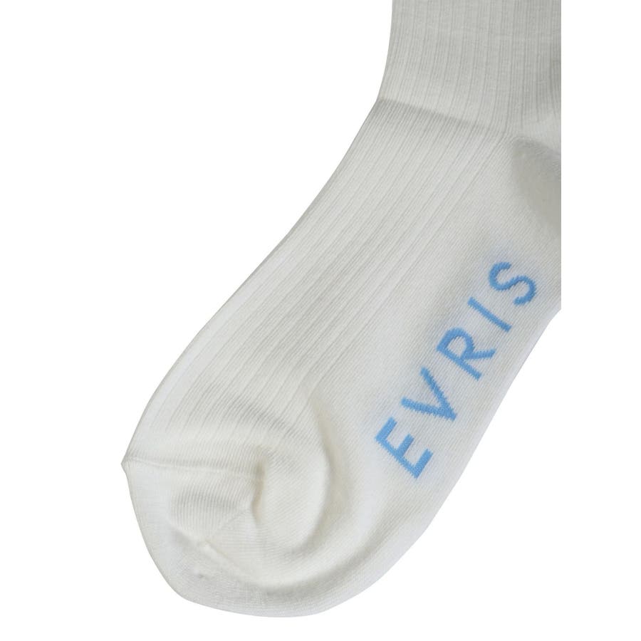 サイドにオリジナルのワンポイントロゴをジャガード編みした膝下丈のソックスです。リブ編みの仕様で脚長効果があります。薄手の素材を使用しシアー感のある見た目で、夏場でも着用しやすい靴下です。足裏にはポップなカラーでEVRISのブランドロゴを入れています。サンダルやスニーカーなどと合わせたミニボトムとのスタイリングがおすすめです。どんなコーディネートにも取り入れやすいWHITE・GRAYの2カラー。