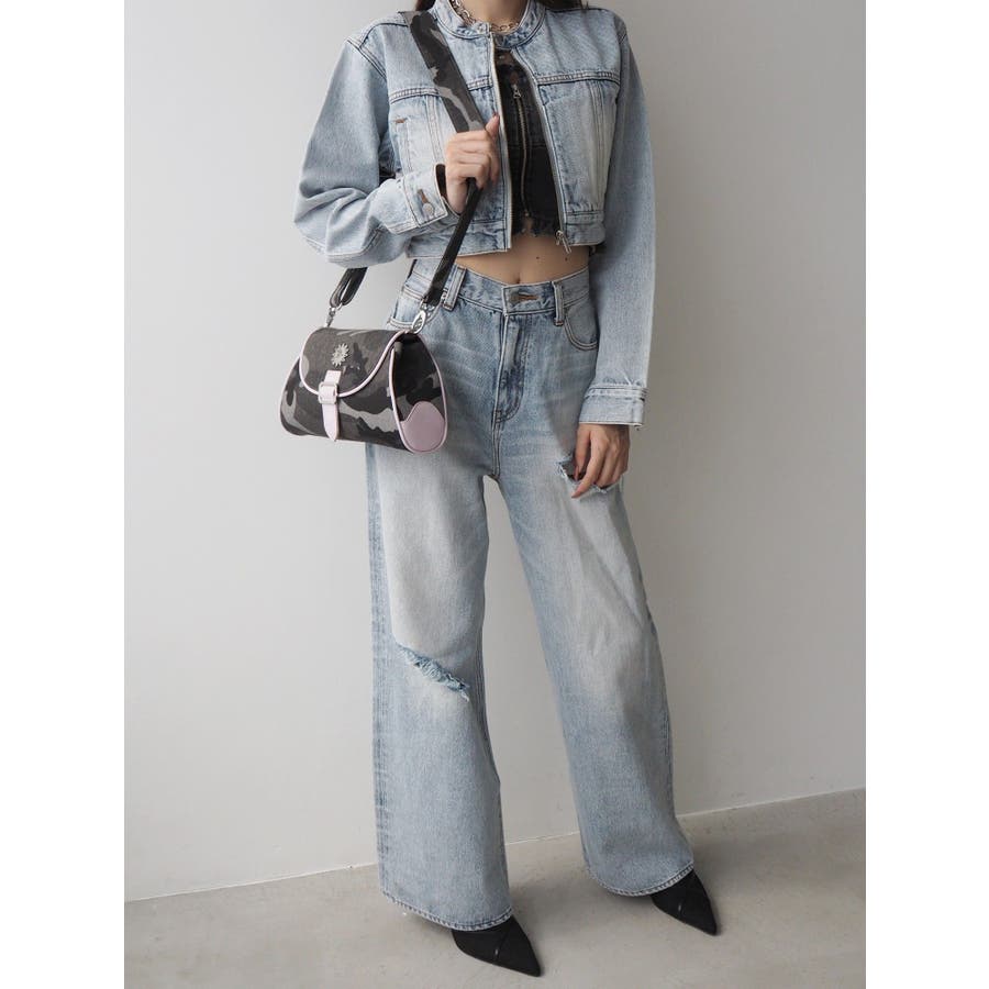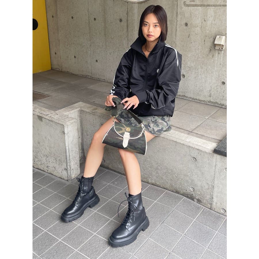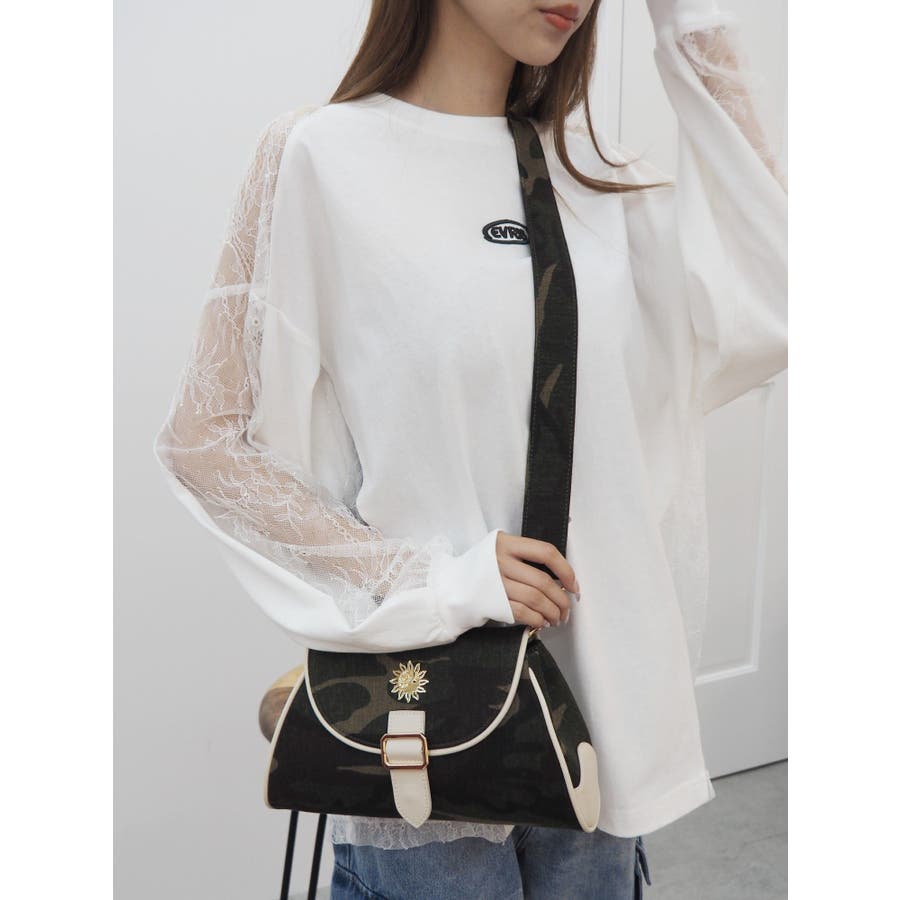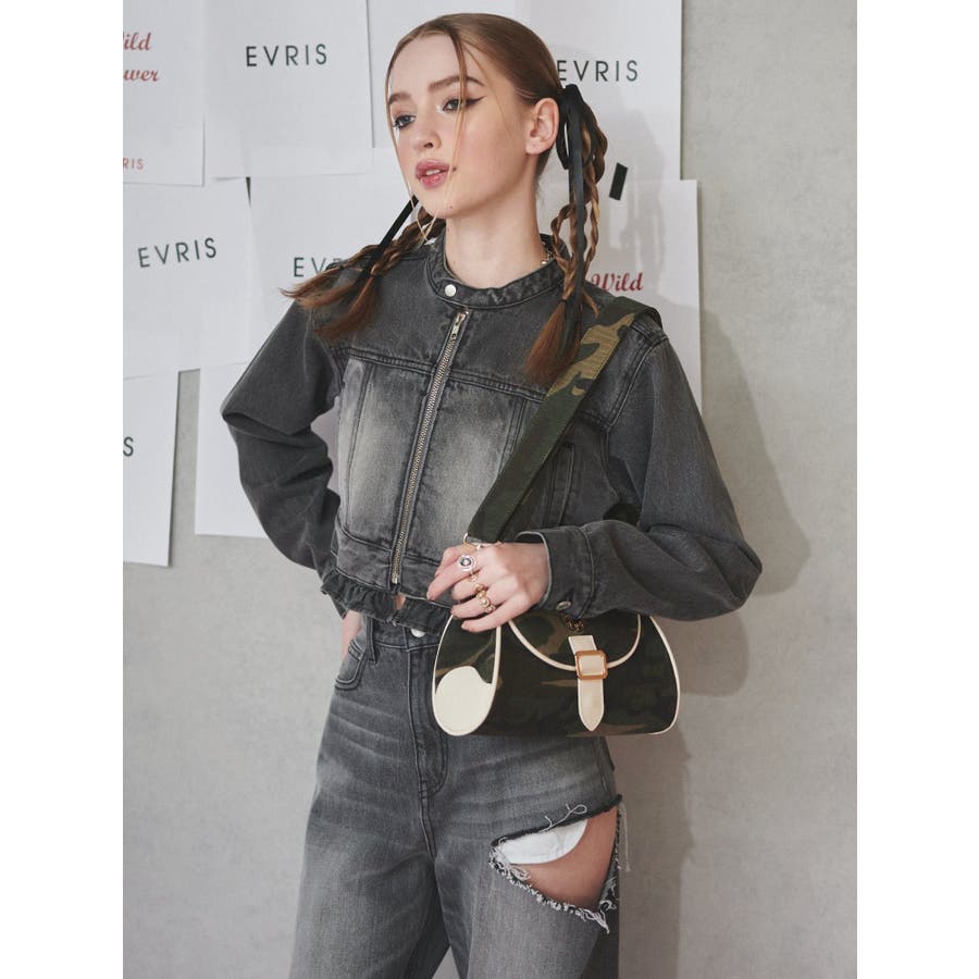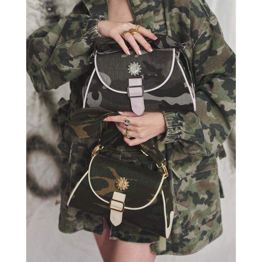 ■デザインツイルの迷彩生地にフェイクレザーでパイピングが施されたショルダーバッグです。迷彩生地とフェイクレザー生地のバイカラーの配色がEVRISらしいデザイン。コンパクトに見えますが、奥行きがしっかりあるので荷物が沢山入るのもポイントです。