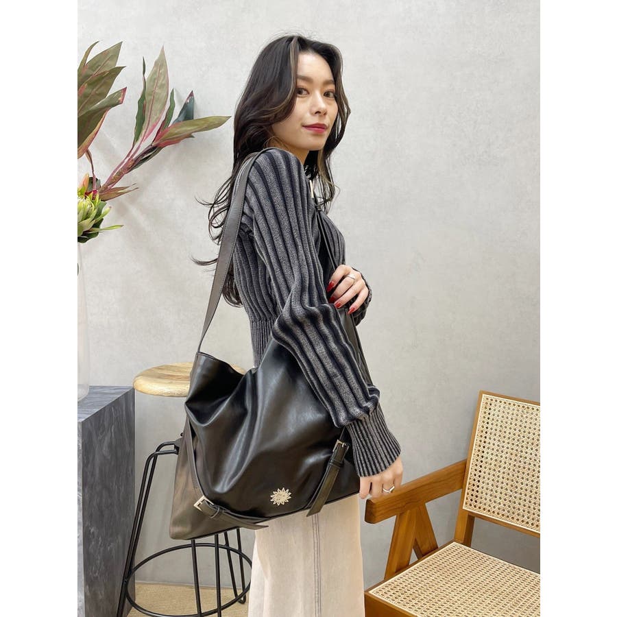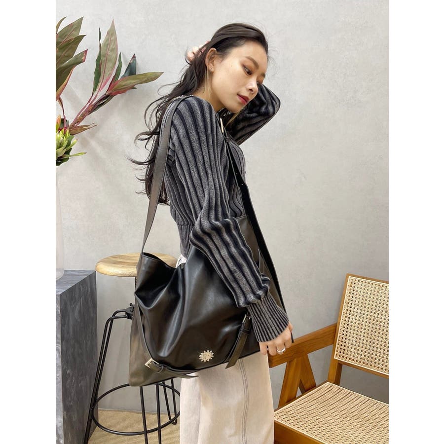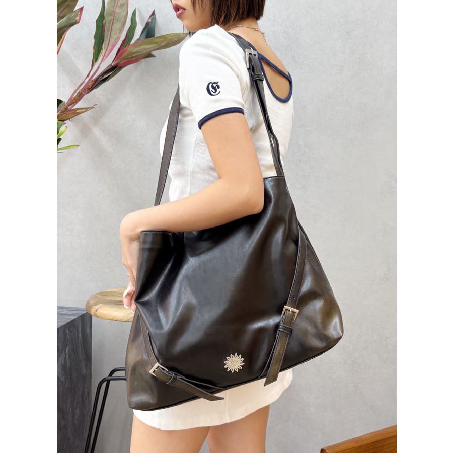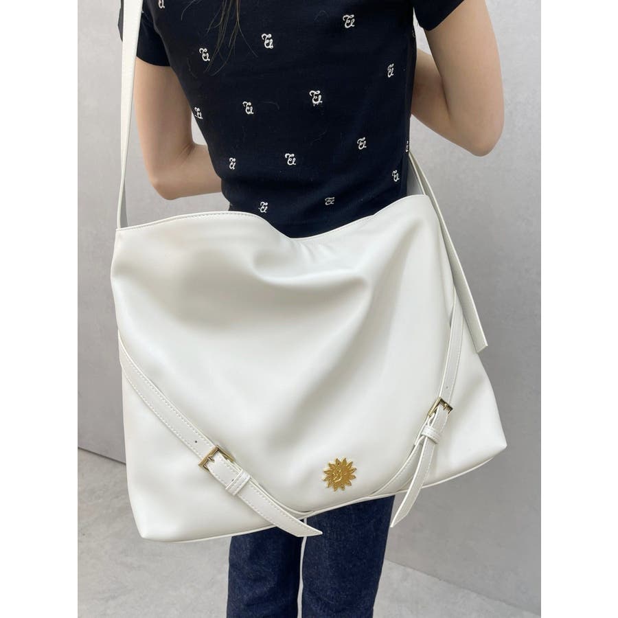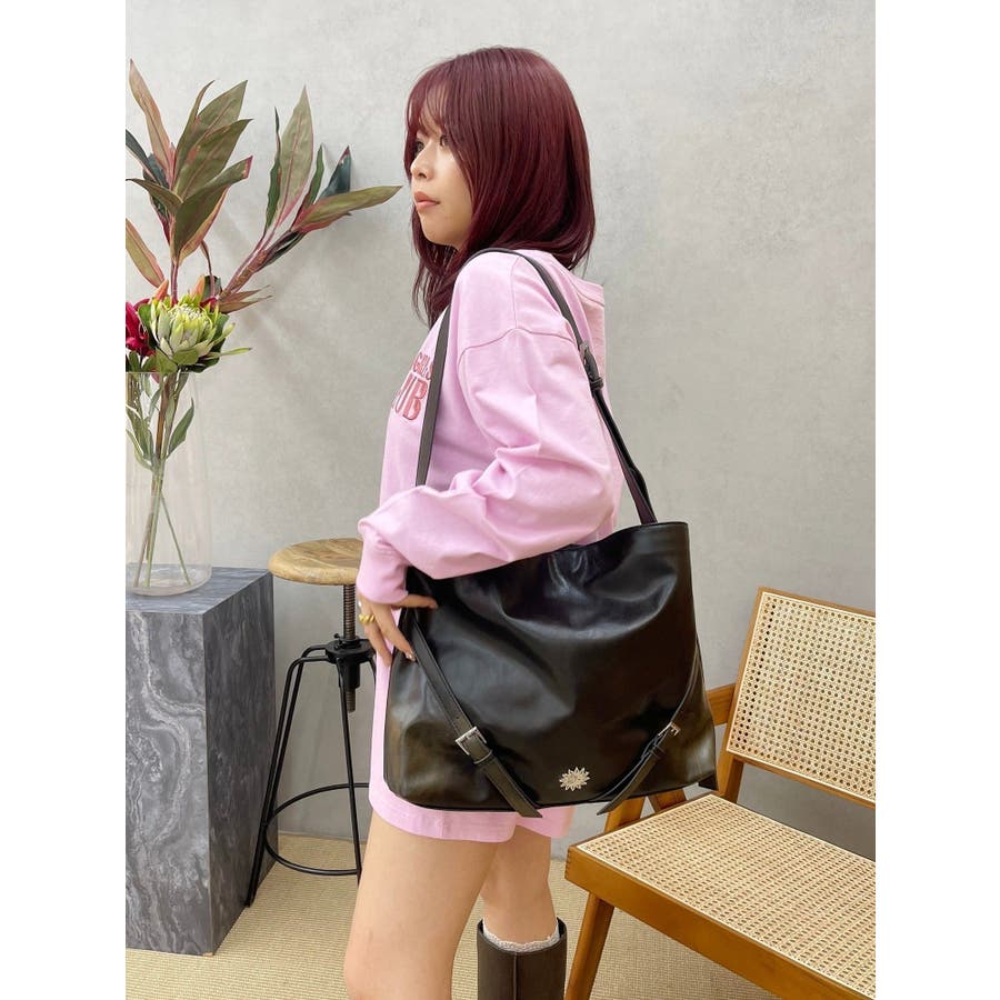 本体とショルダー部分のベルトはポイントです。柔らかい素材を使用しているため、くたっとしたシルエットに仕上がっています。