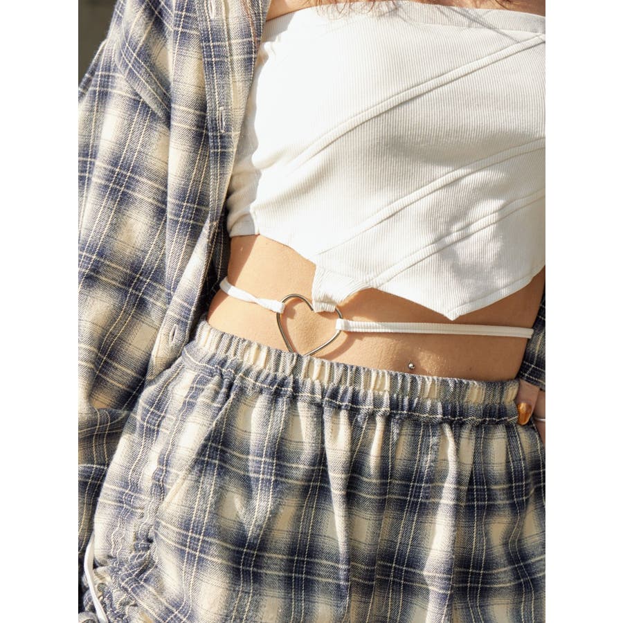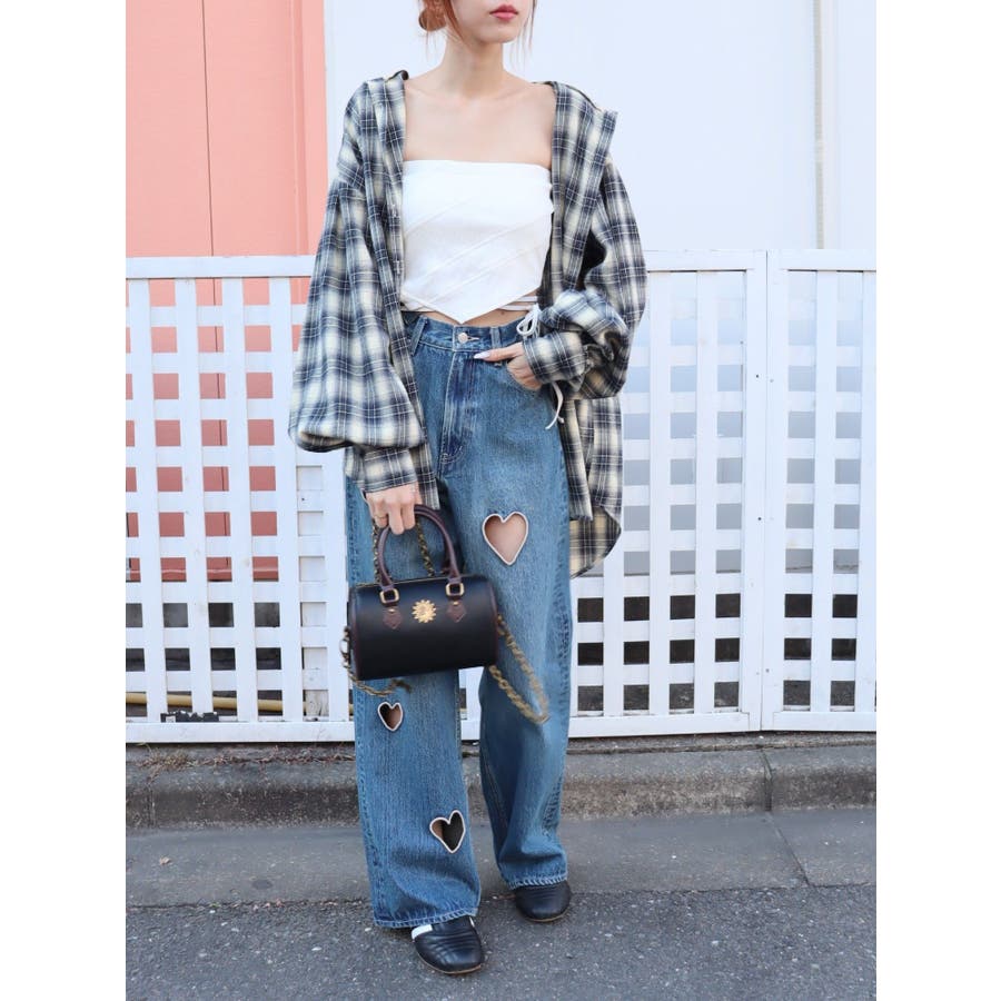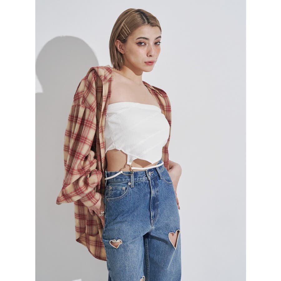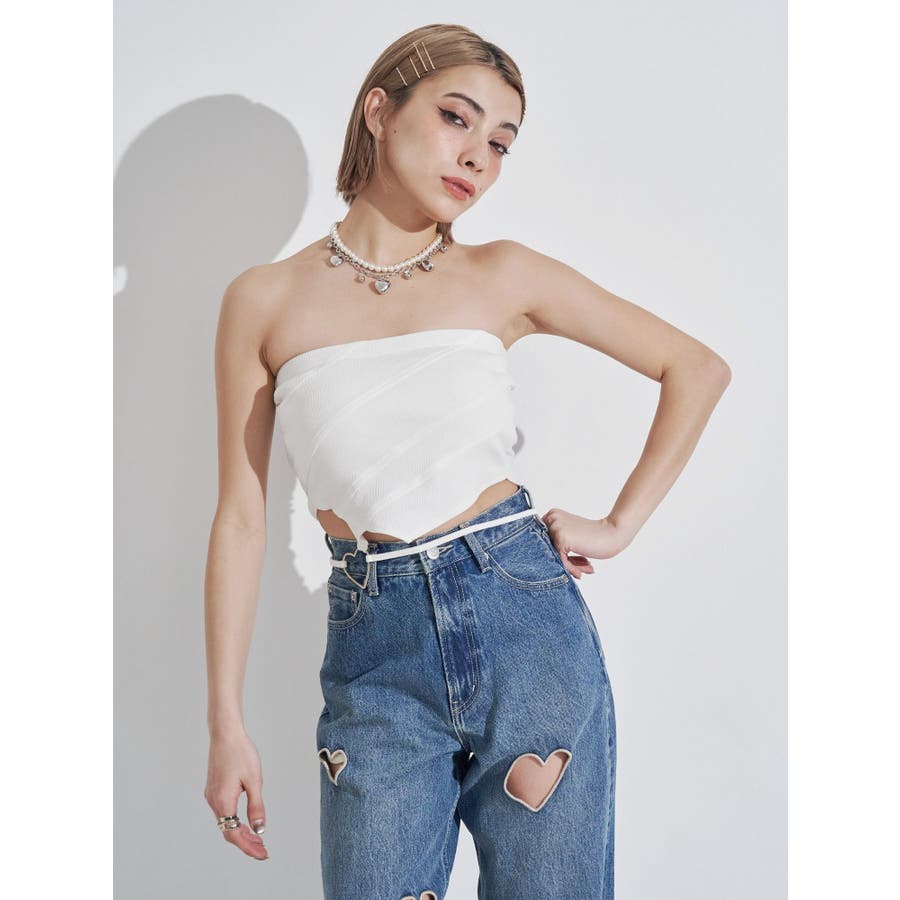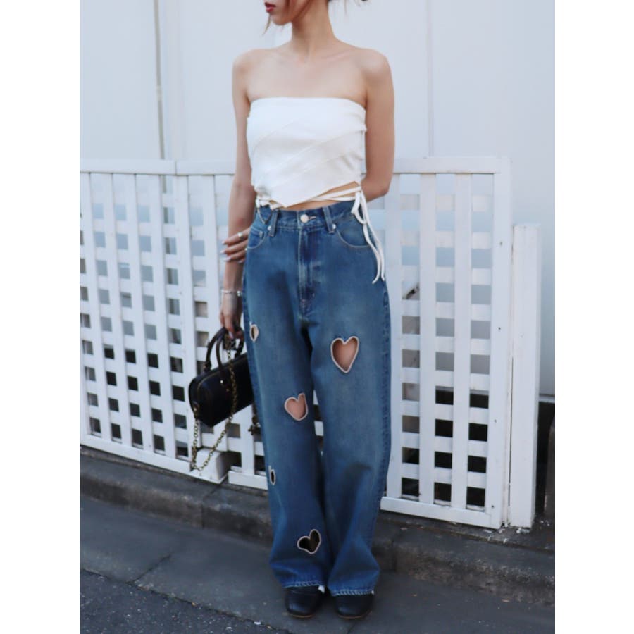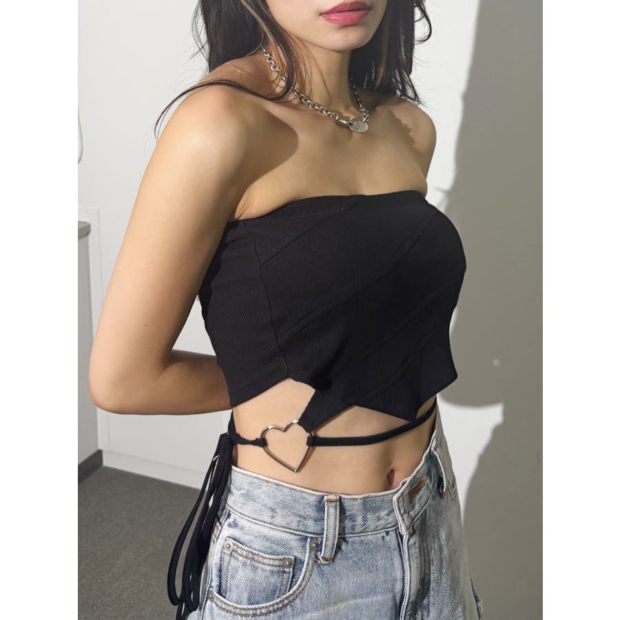 ■デザインハートモチーフがポイントのベアトップスです。パット入りでアンダーバスト部分にもゴムが入っており安心感のある1枚です。羽織モノのインナーとして着回ししやすいアイテムです。■スタイリングワイドなボトムやデニム合わせがおすすめ◎-------------- 透け感:なし 裏地:あり(パッド付き)生地の厚み:普通伸縮性:なし --------------