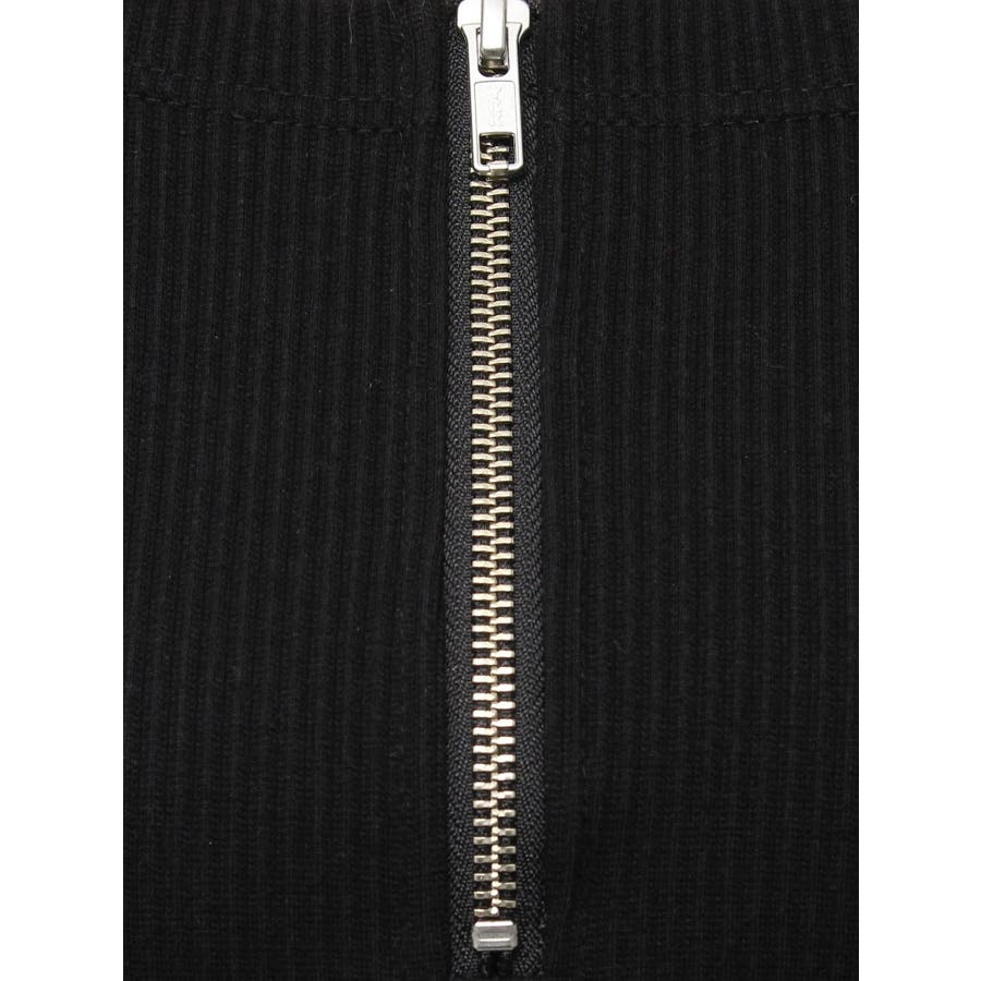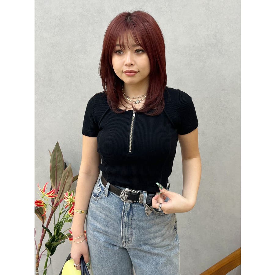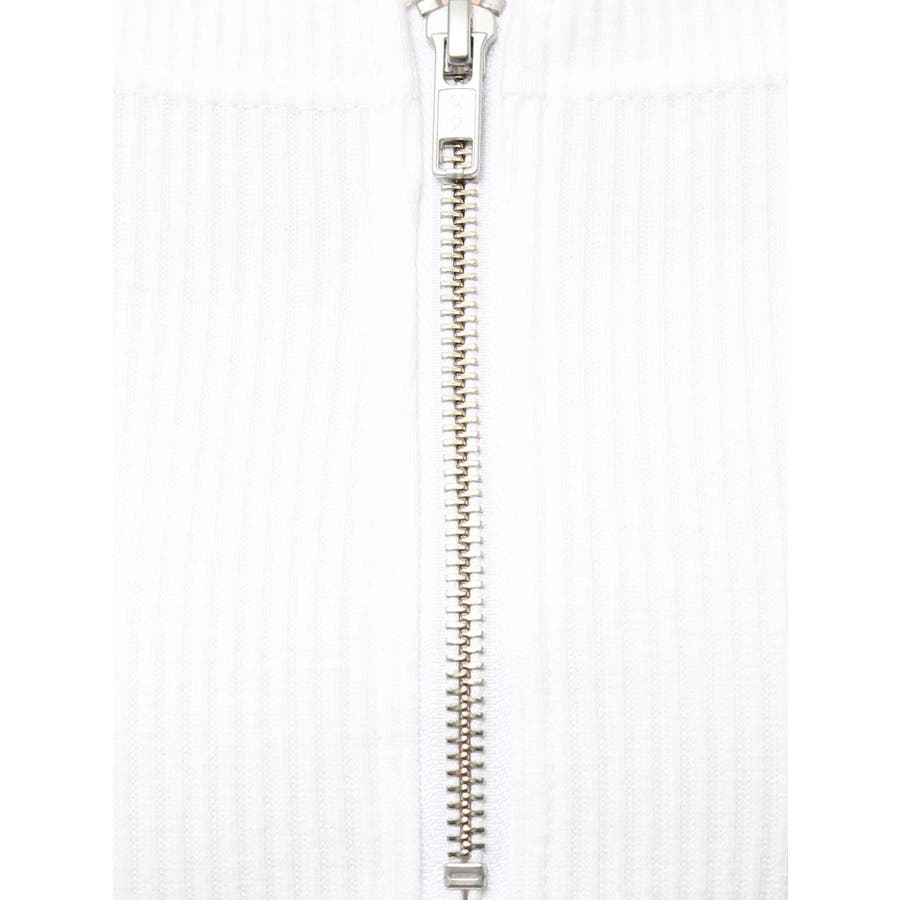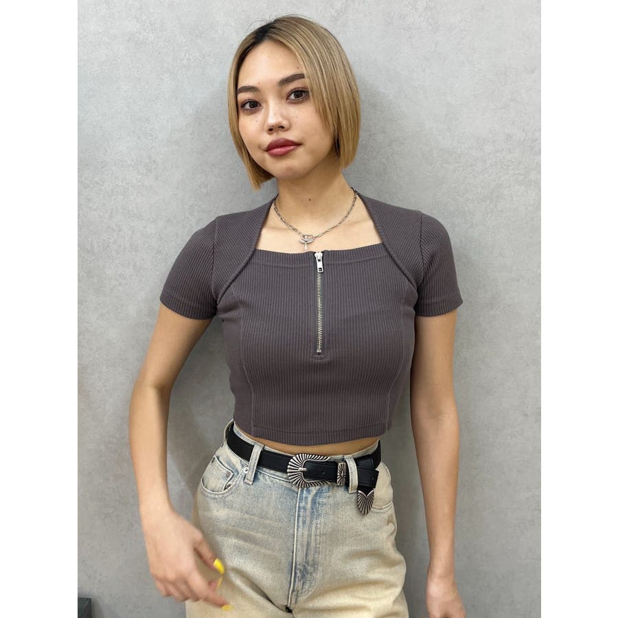 ボレロとベアトップをセットで着用しているようなデザインのリブトップスです。フロント部分のジップデザインがポイントとなっています。バスト部分はパネル切り替えが入っておりボディラインをすっきり見せてくれるデザインです。