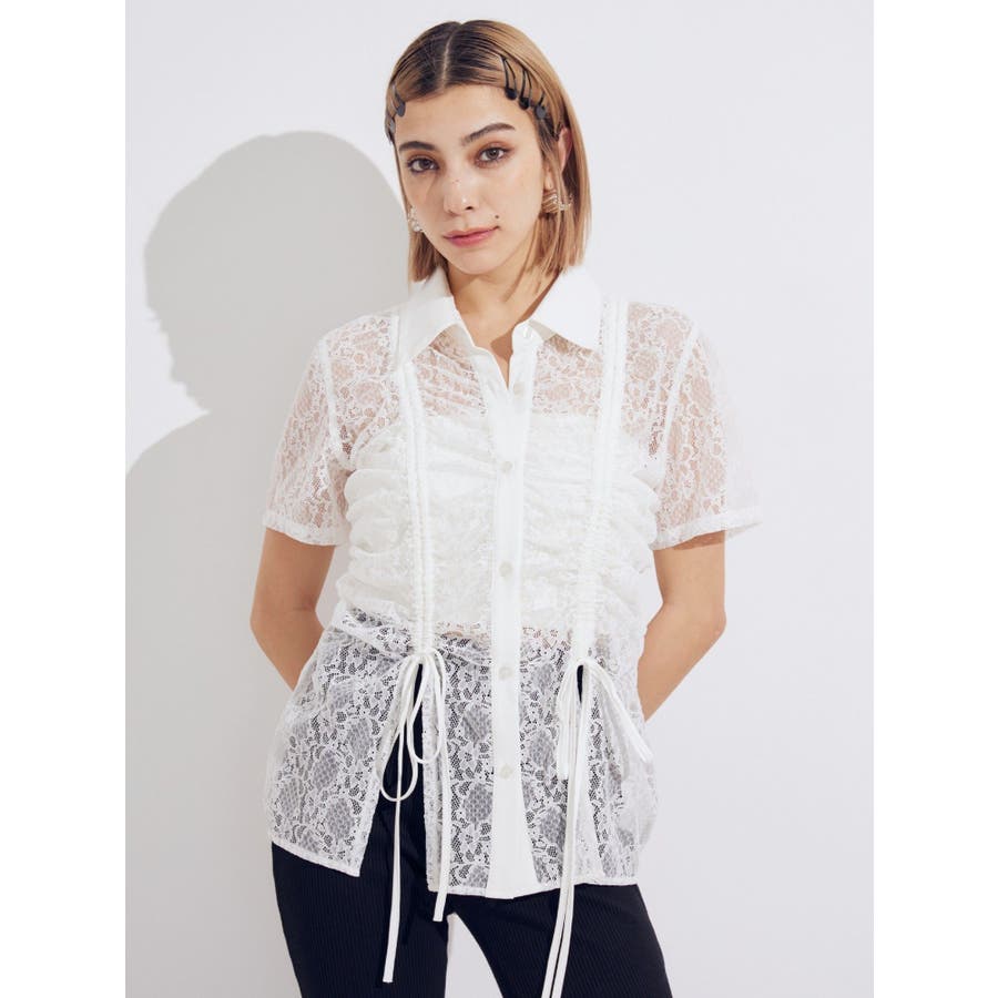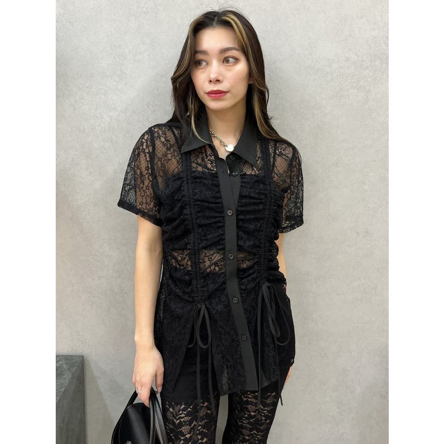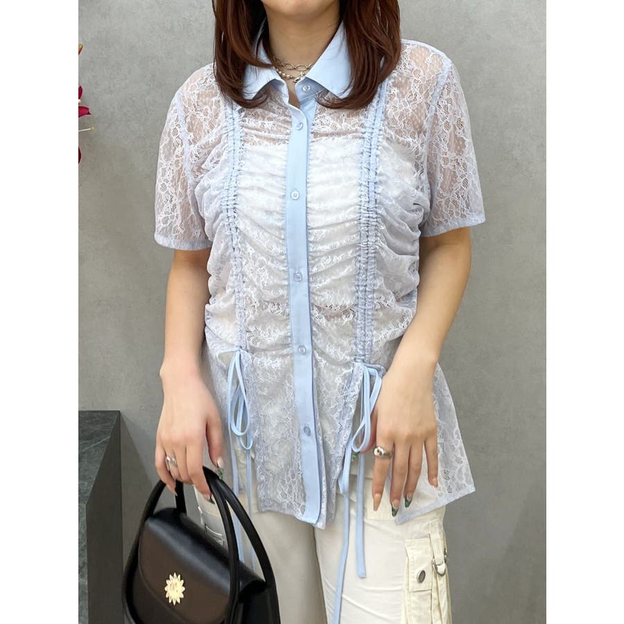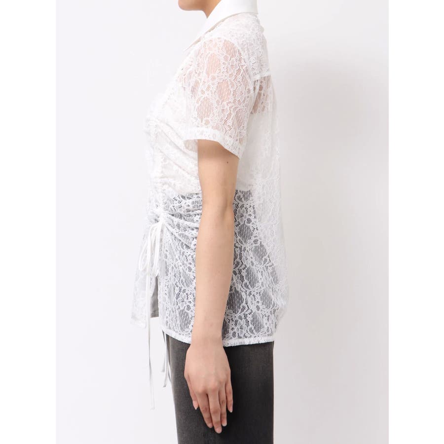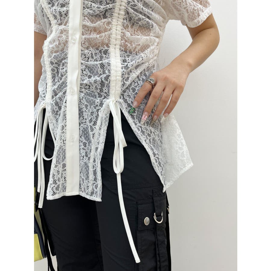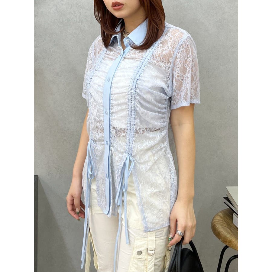 フロントのドロストがポイントのレース生地を使用したシアーシャツ。