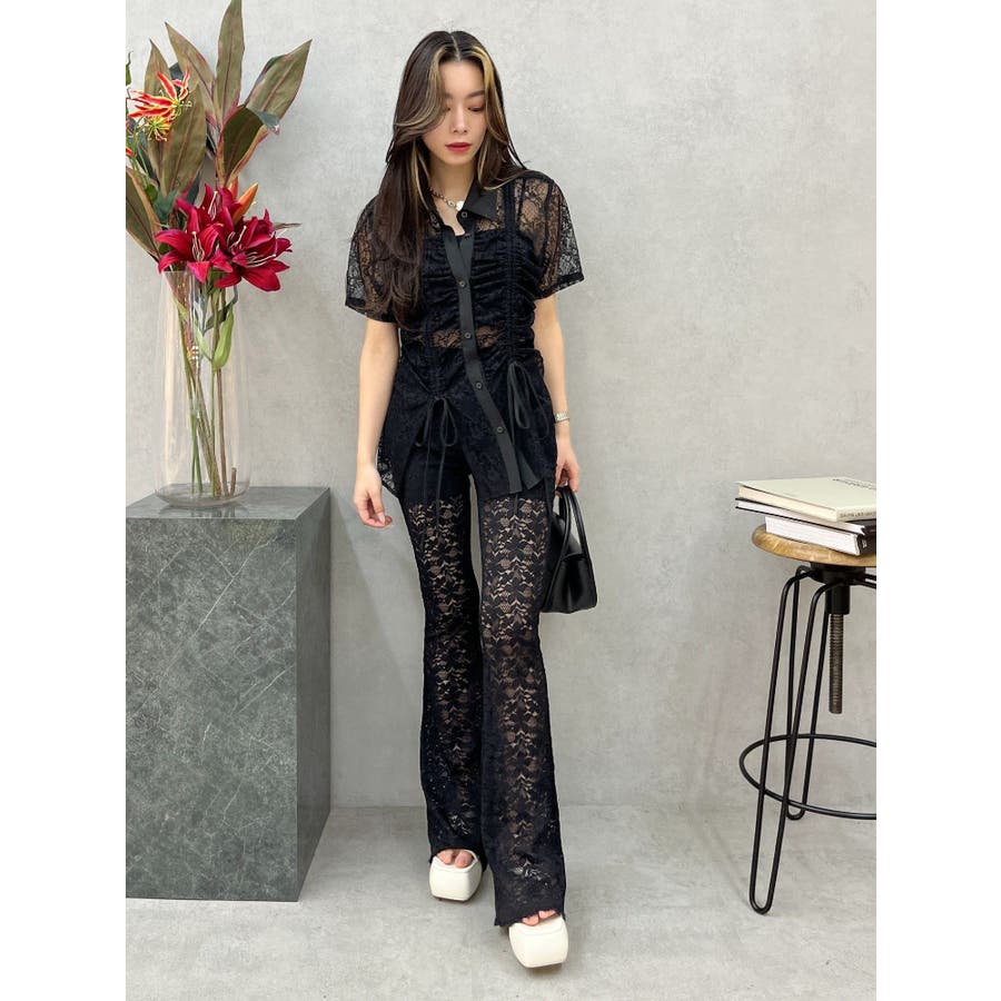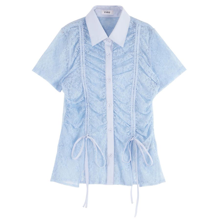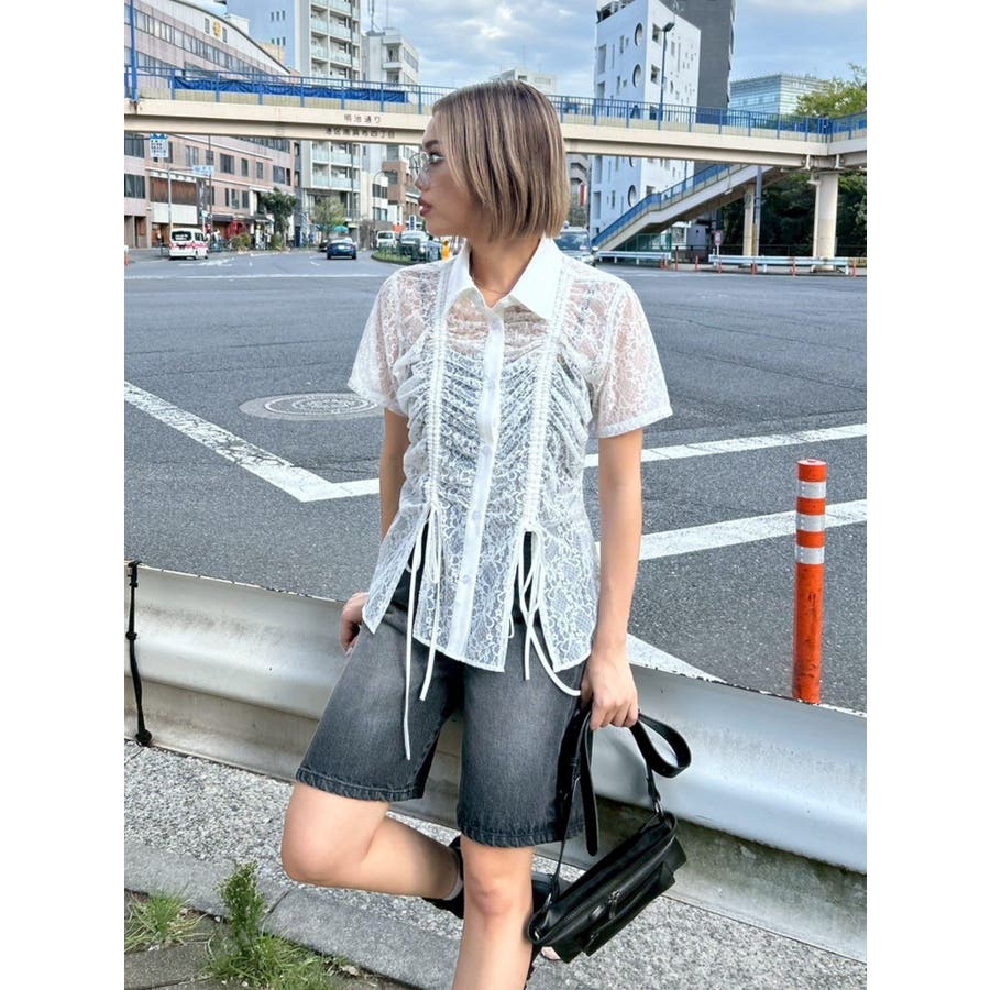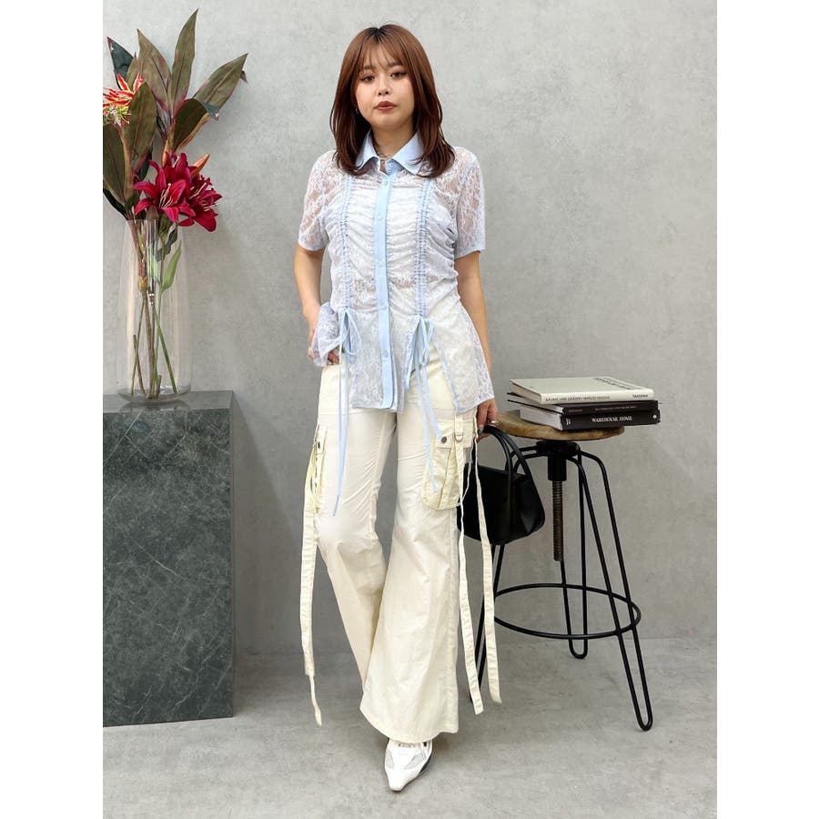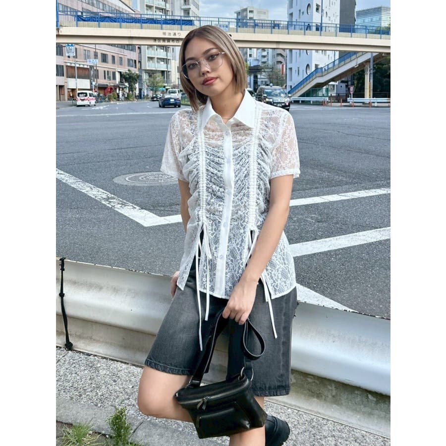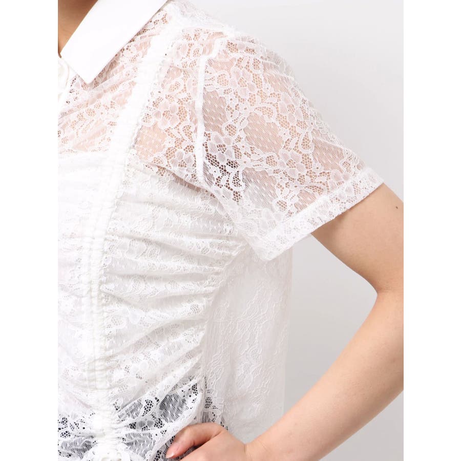 フロントのドロストがポイントのレース生地を使用したシアーシャツ。