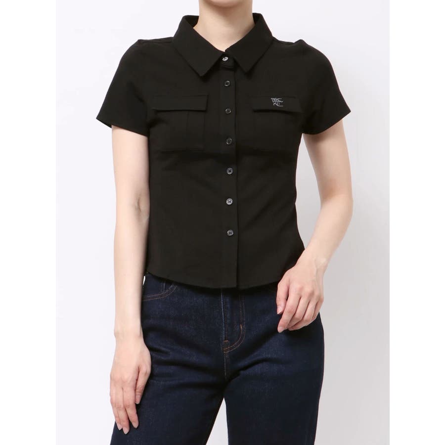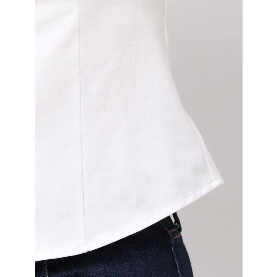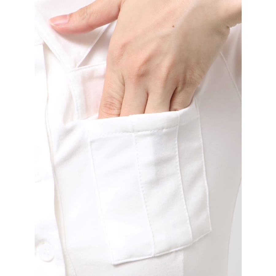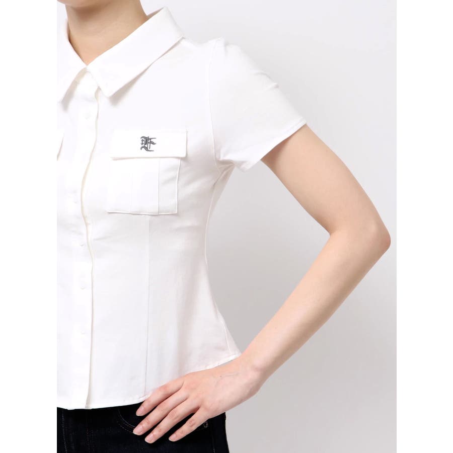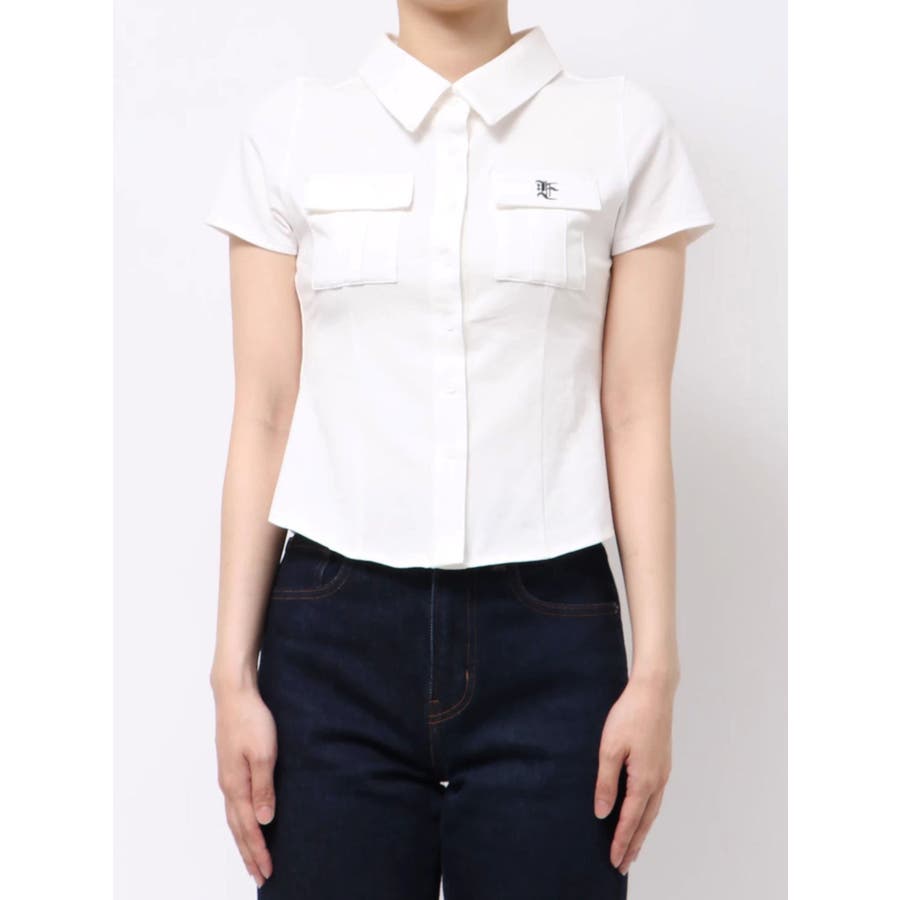 ■デザイン ウエストをシェイプさせたデザインがポイントのカットソーです。 タイトなシルエットですがカットソー生地を使用しているためストレッチ性があり着心地の良い一枚です。 ポケットのフラップ部分にはオリジナルの刺繍を施しています。 ■スタイリング タイトながら裾がやや広がっているシルエットなのでストレートパンツや、フレアパンツなどとの合わせがおすすめです。 -------------- 透け感:なし 裏地:なし 生地の厚み:普通 伸縮性:あり --------------