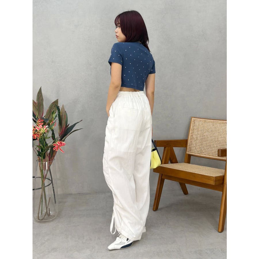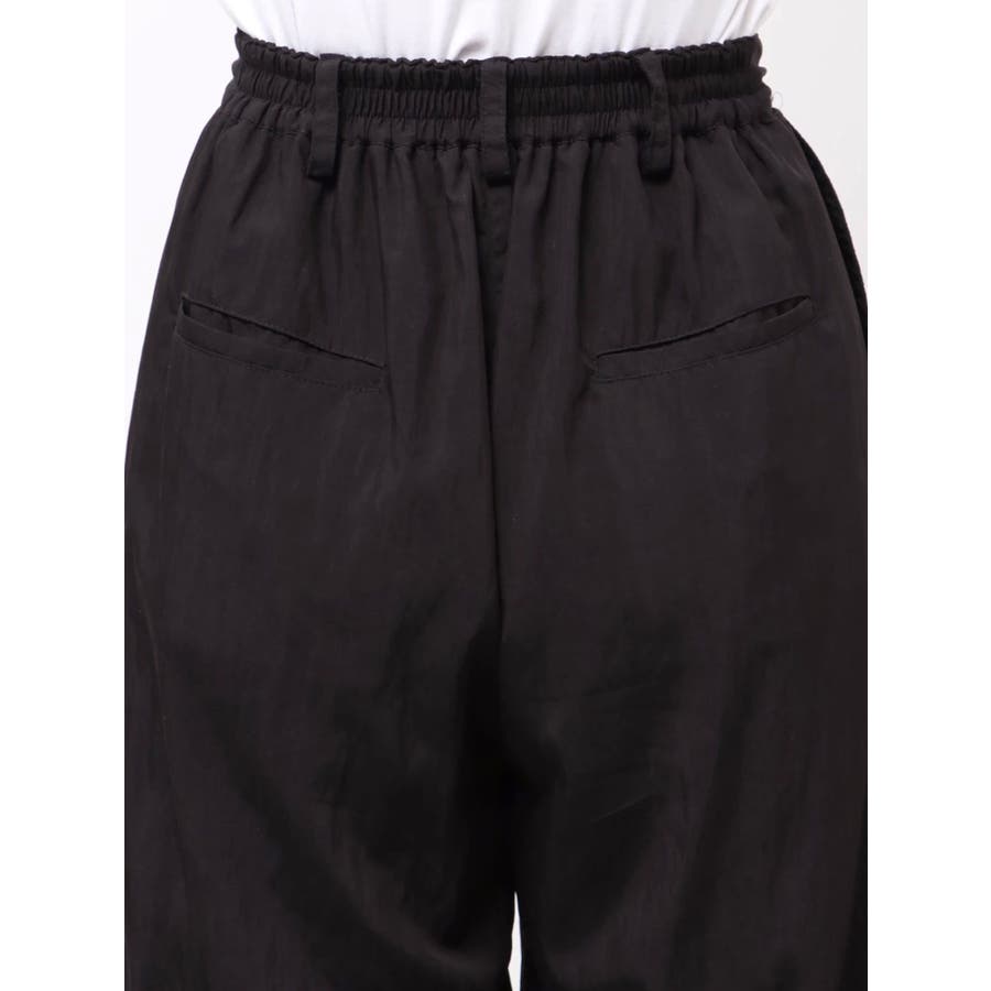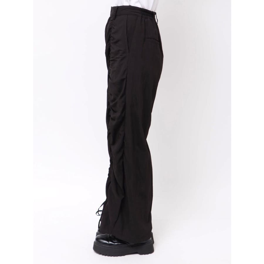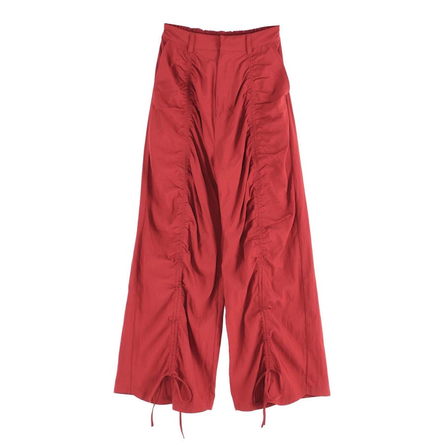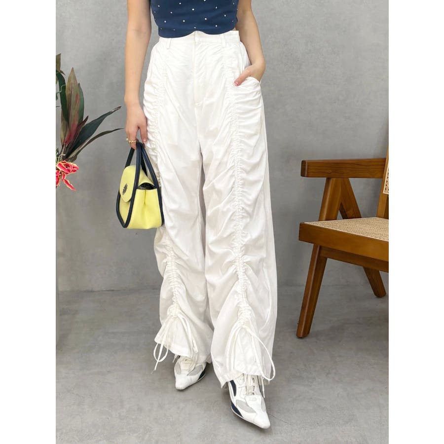 ■デザイン裾のドロストをお好みの位置で絞れるデザインで、リボンで結べる仕様のワイドパンツです。合繊の柔らかくさらっとした生地を使用しているため、夏場でも涼しく着用できます。ウエストの後ろ部分はゴムを入れているため、ストレスフリーな着心地です。■スタイリングコンパクトなサイズ感のトップスと合わせるとスタイルアップ効果がありおすすめです。 -------------- 透け感:なし生地の厚み:普通伸縮性:なし --------------