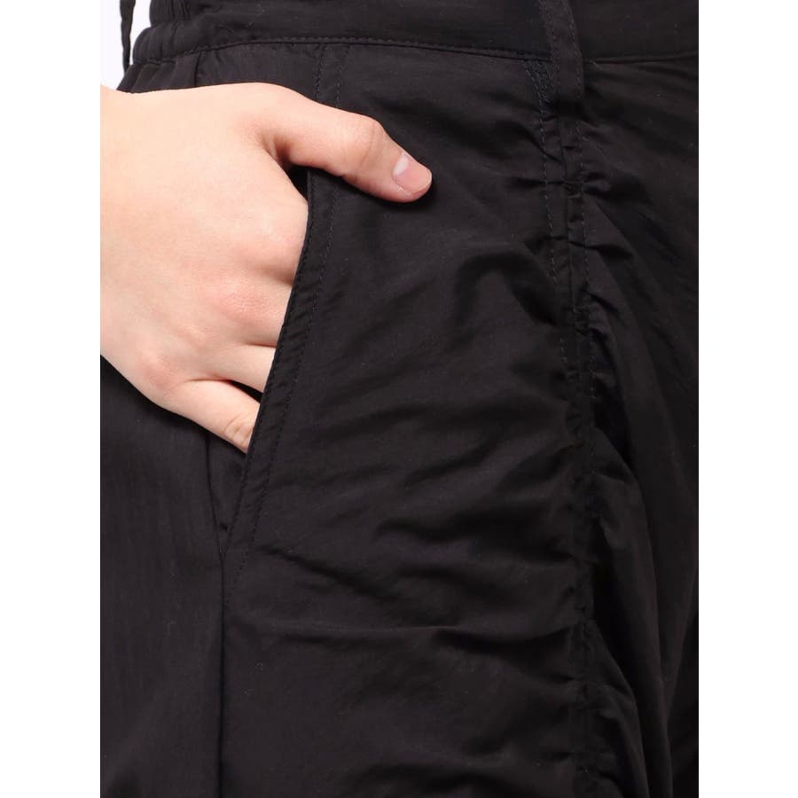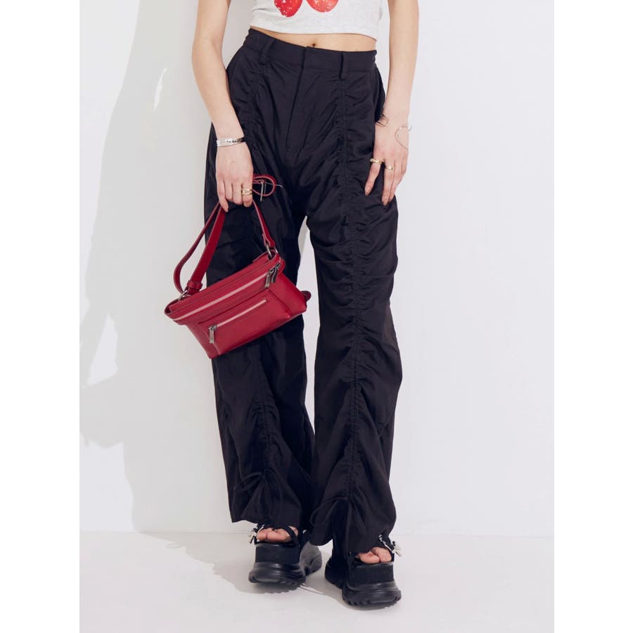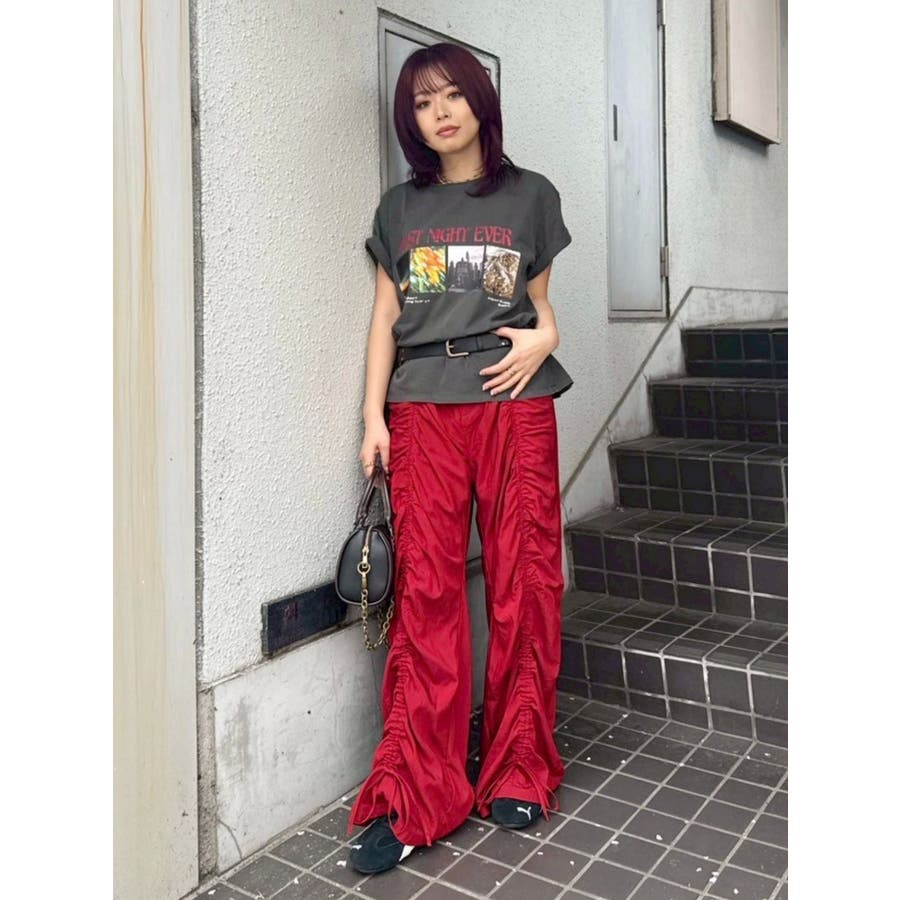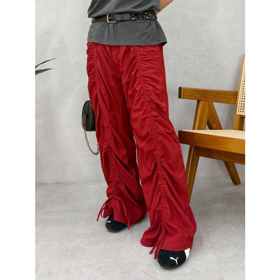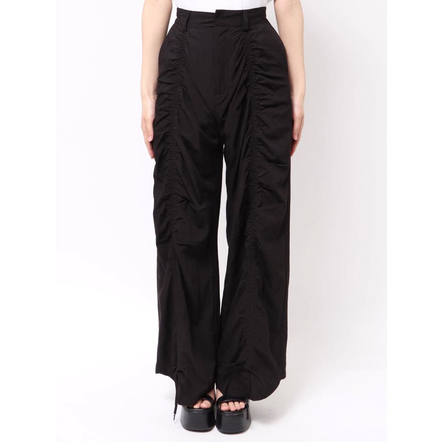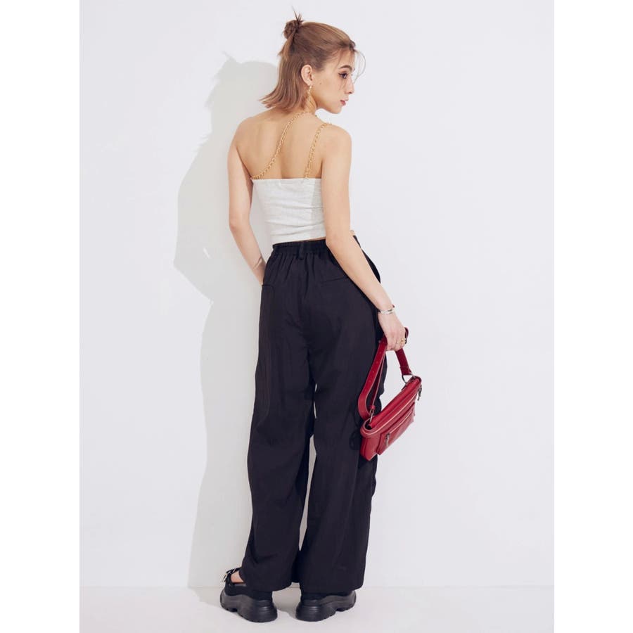 ■デザイン裾のドロストをお好みの位置で絞れるデザインで、リボンで結べる仕様のワイドパンツです。合繊の柔らかくさらっとした生地を使用しているため、夏場でも涼しく着用できます。ウエストの後ろ部分はゴムを入れているため、ストレスフリーな着心地です。■スタイリングコンパクトなサイズ感のトップスと合わせるとスタイルアップ効果がありおすすめです。 -------------- 透け感:なし生地の厚み:普通伸縮性:なし --------------