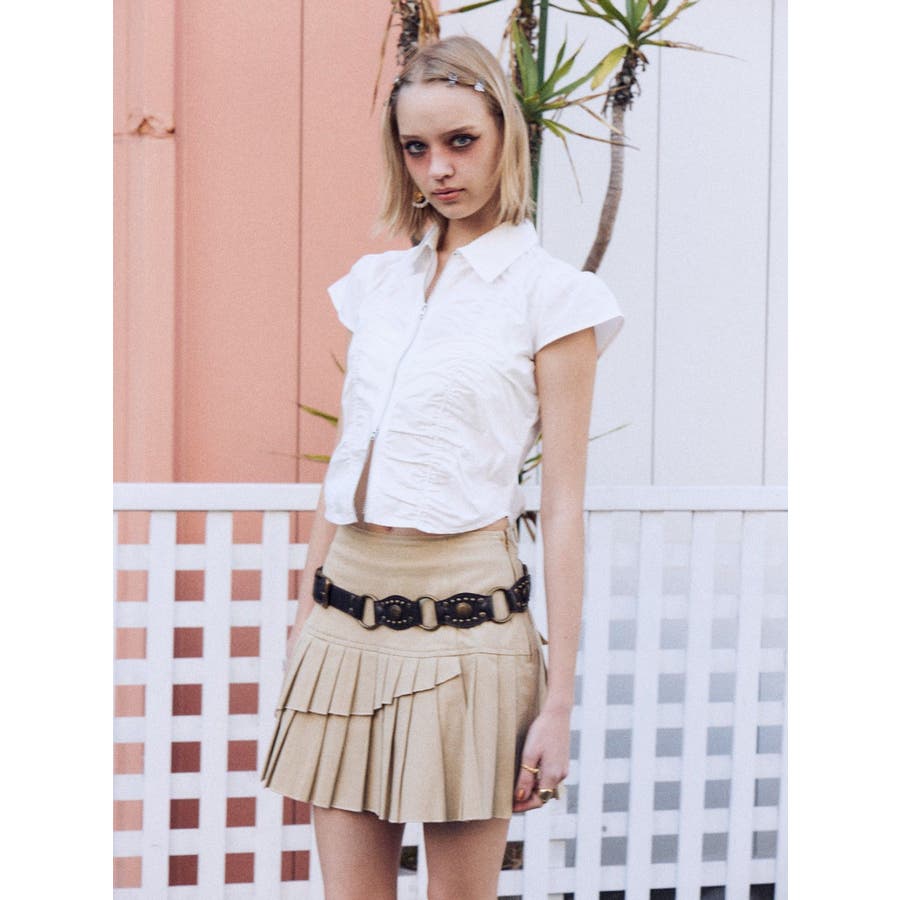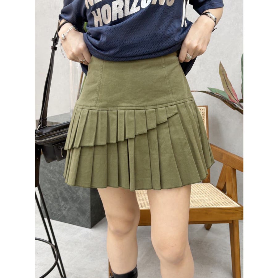 ■デザインアシンメトリーにレイヤードされたプリーツのデザインがポイントとなったミニスカートです。カジュアルな素材感でどんなトップスにも合わせやすいデザインです。短すぎない丈感が着用しやすく、洒落感も出してくれます。■スタイリングTシャツやタンクトップ合わせでカジュアルに着用したり、シャツやブラウス合わせで大人っぽく着るのもおすすめ。-------------- 透け感:なし生地の厚み:普通伸縮性:なし --------------