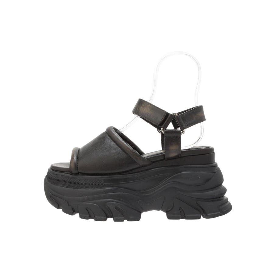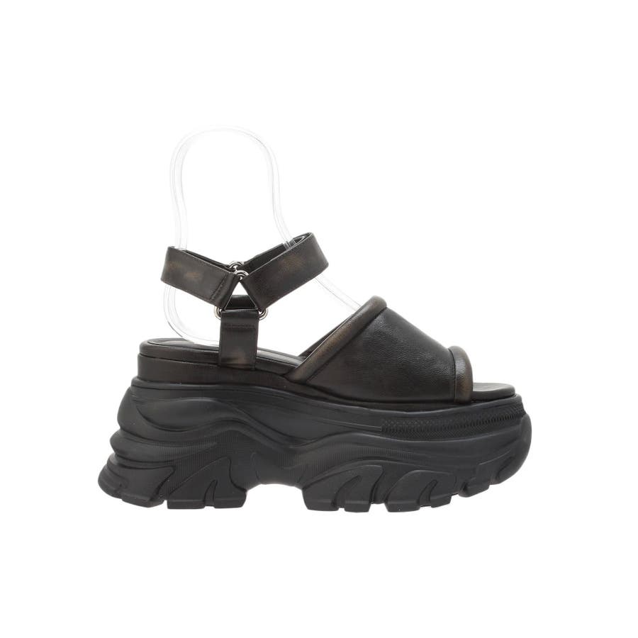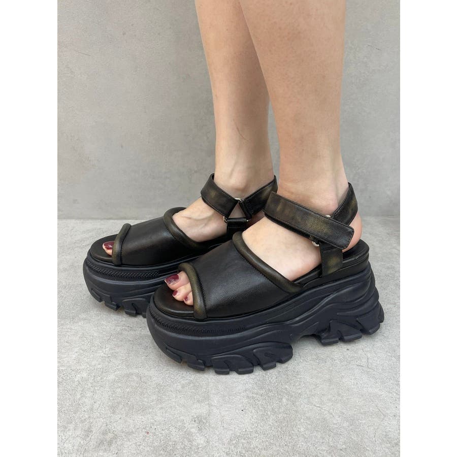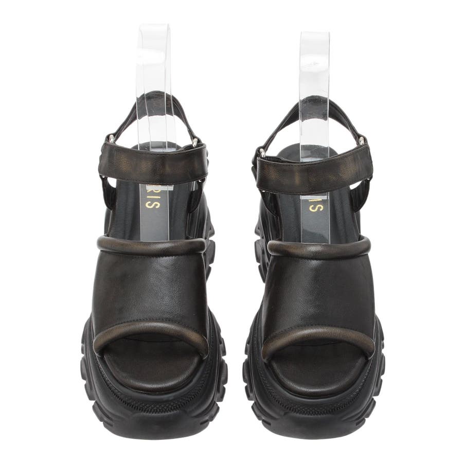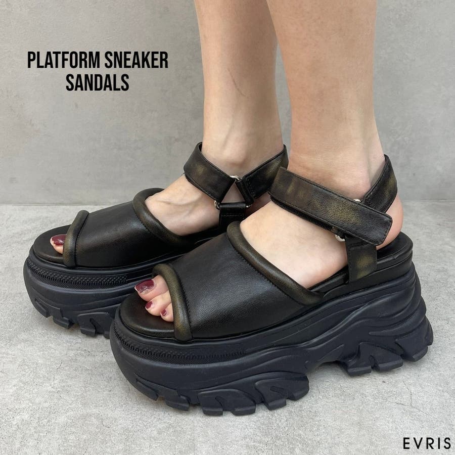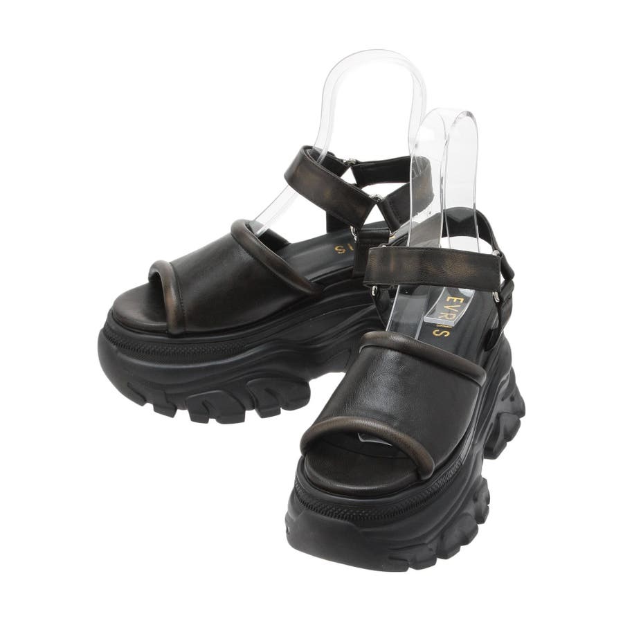 EVRIS(エヴリス)らしいしっかりと厚みのあるスニーカーソールを使用したサンダルです。前後の高低差があまりないため、高さはありますが履き心地が良いです。ブラウンはヴィンテージ感のある加工を施し、あえて色ムラを出しています。