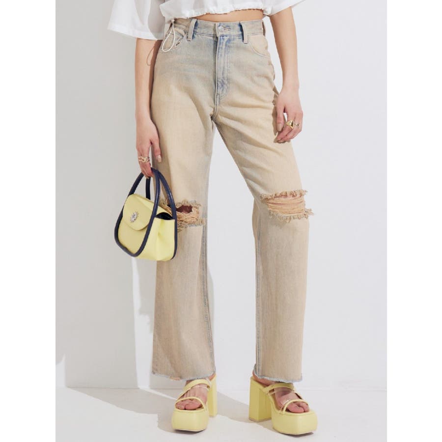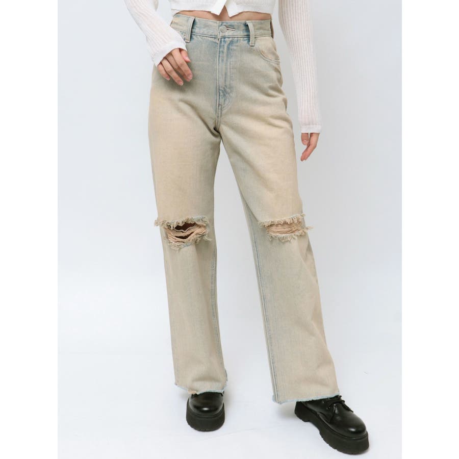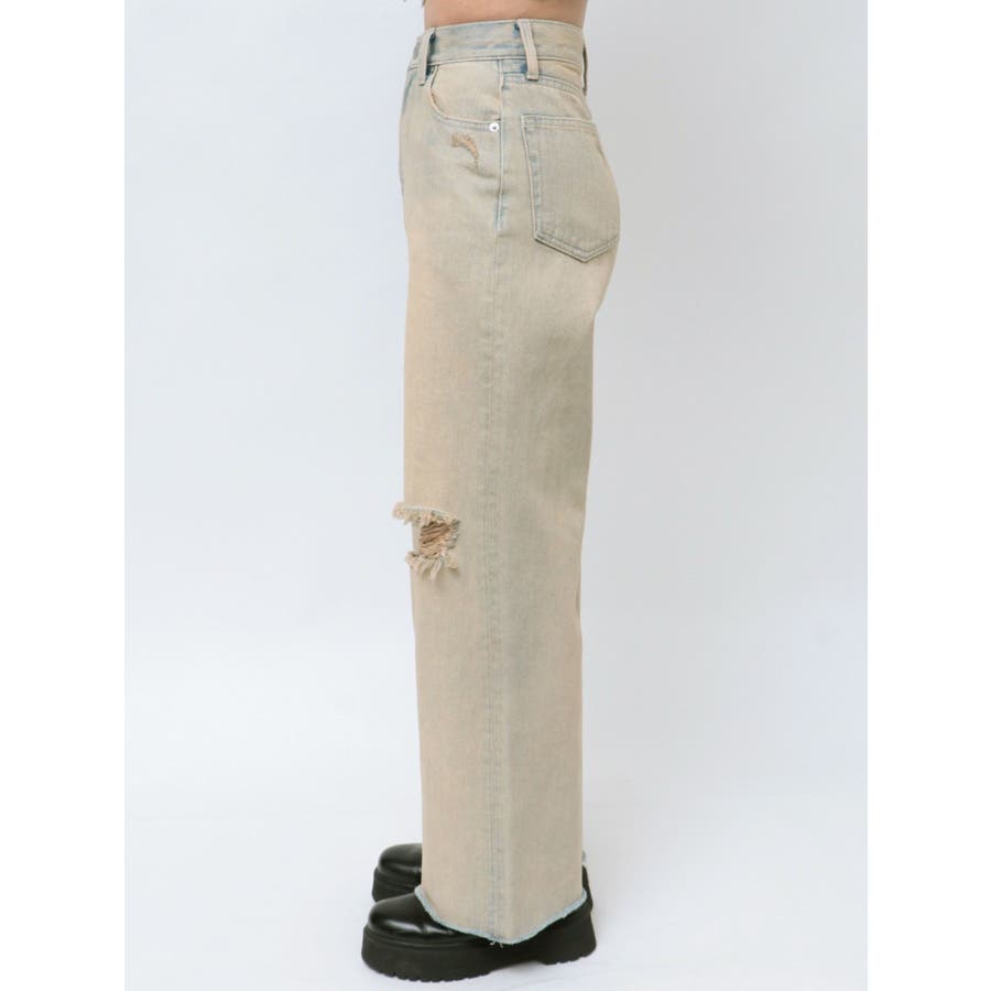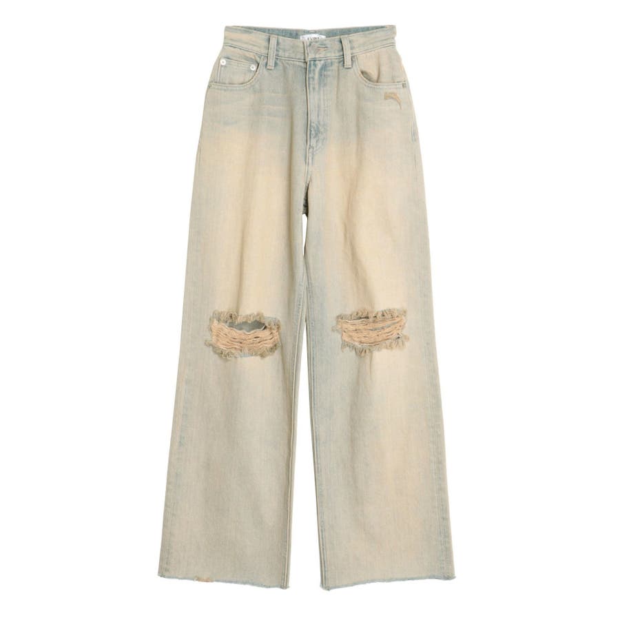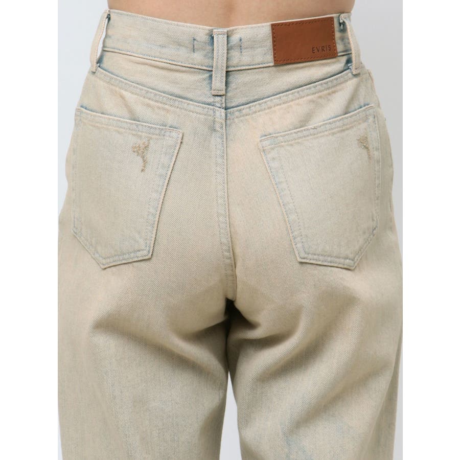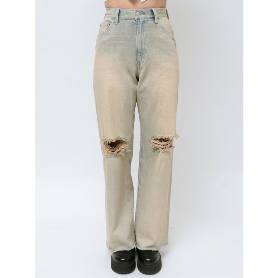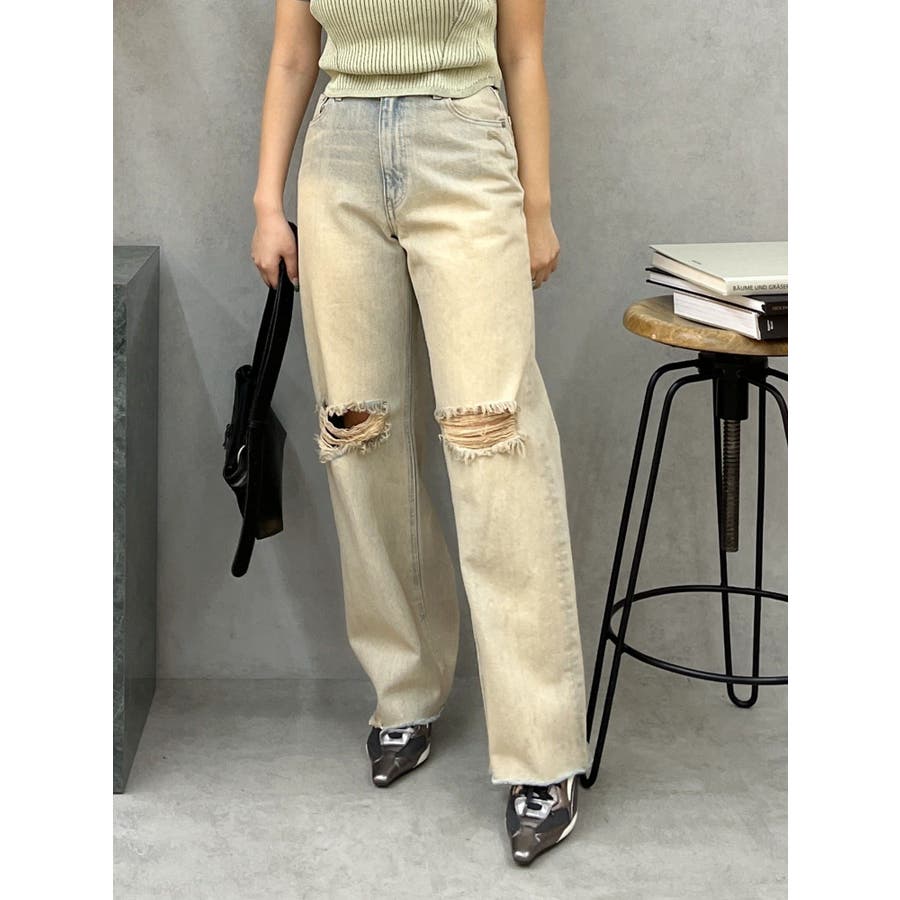 ■デザインEVRIS定番のダメージワイドデニムパンツのデザインをベースに、今季らしいグランジ感のあるヴィンテージライクな加工を施した1本です。黄味がかったオーバーダイを強めにのせており、トレンド感があります。ダメージが高めの位置に入っていることで、膝下を長く見せてくれるのが嬉しいポイント◎EVRIS(エヴリス)定番のワイドボトムのサイジングを採用しており、美脚効果抜群です。■スタイリングハイウエストなのでコンパクトなシルエットのトップス合わせがおすすめ。レース素材や、ブラウスなど女性らしい印象のアイテムとの合わせも今年らしくて◎-------------- 透け感:なし生地の厚み:普通伸縮性:なし--------------