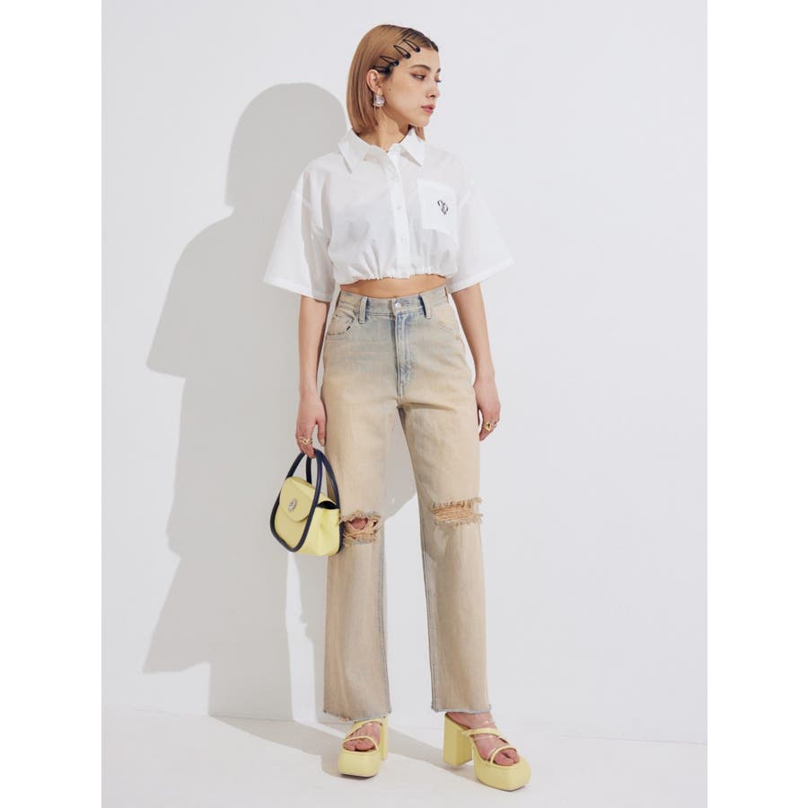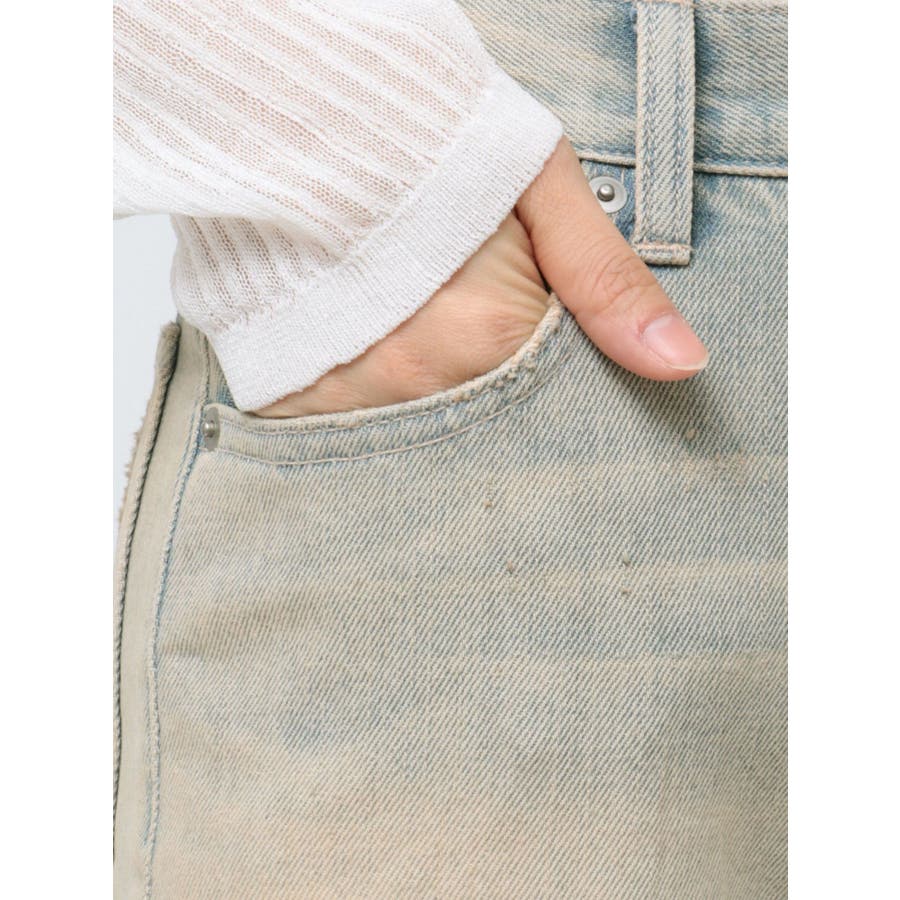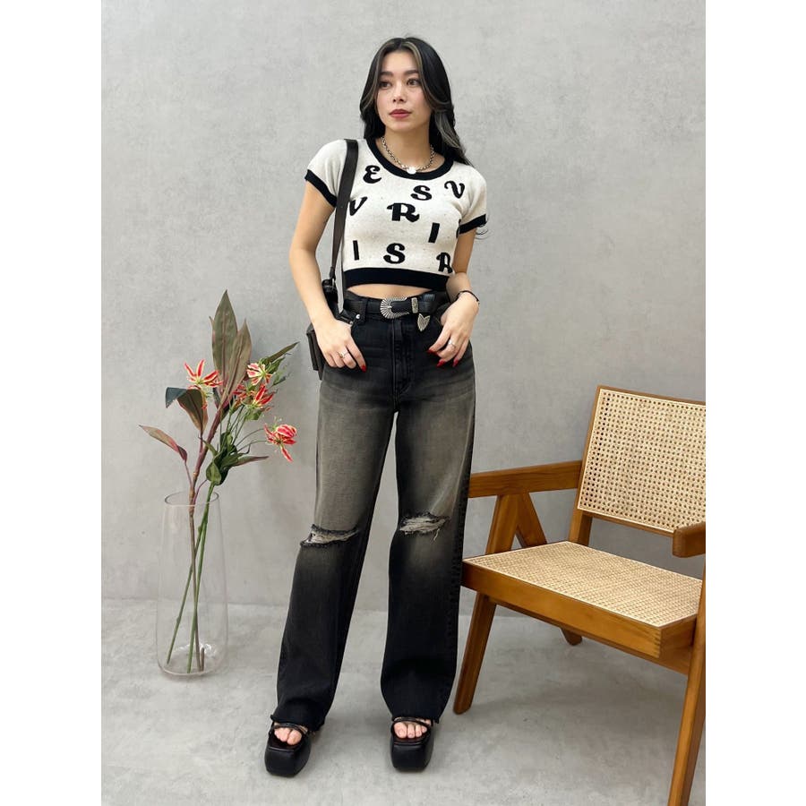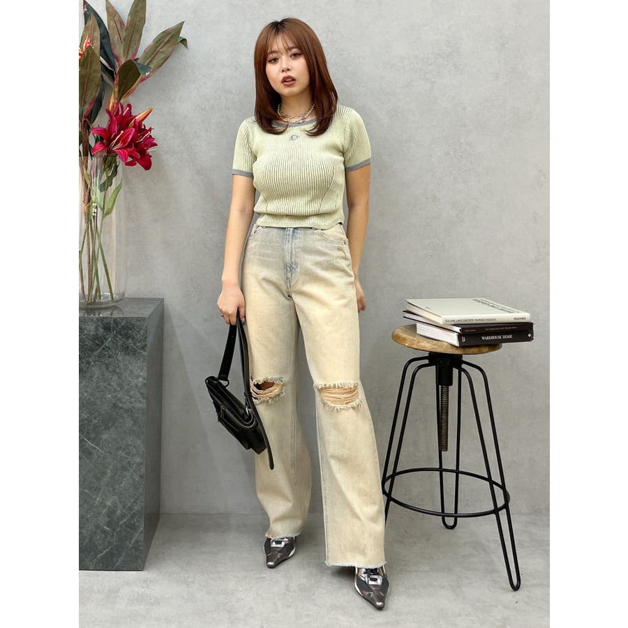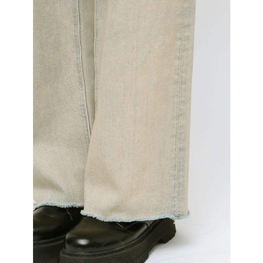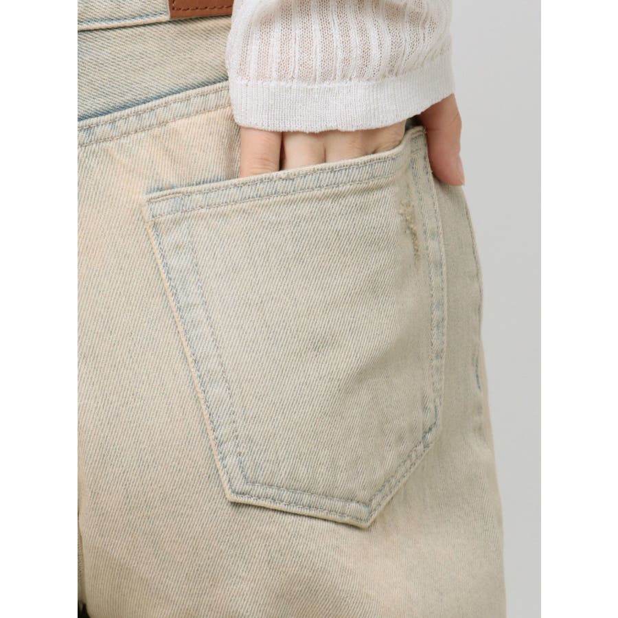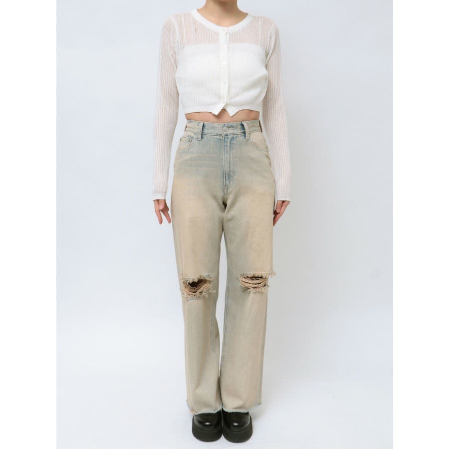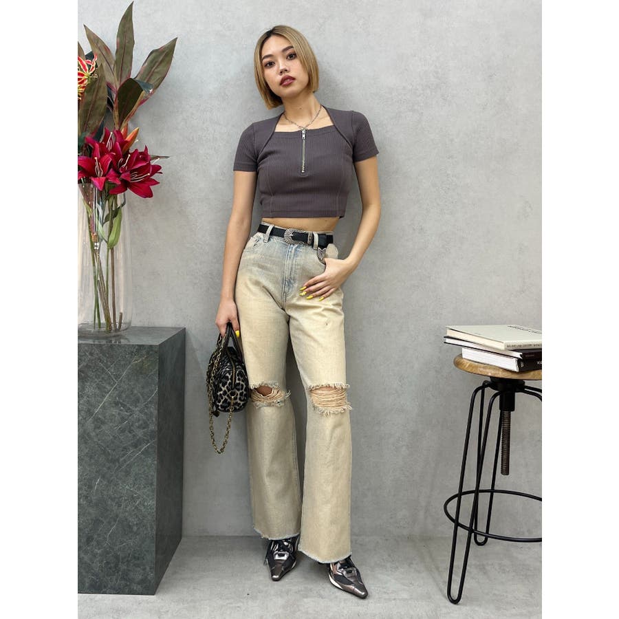 ■デザインEVRIS定番のダメージワイドデニムパンツのデザインをベースに、今季らしいグランジ感のあるヴィンテージライクな加工を施した1本です。黄味がかったオーバーダイを強めにのせており、トレンド感があります。ダメージが高めの位置に入っていることで、膝下を長く見せてくれるのが嬉しいポイント◎EVRIS(エヴリス)定番のワイドボトムのサイジングを採用しており、美脚効果抜群です。■スタイリングハイウエストなのでコンパクトなシルエットのトップス合わせがおすすめ。レース素材や、ブラウスなど女性らしい印象のアイテムとの合わせも今年らしくて◎-------------- 透け感:なし生地の厚み:普通伸縮性:なし--------------