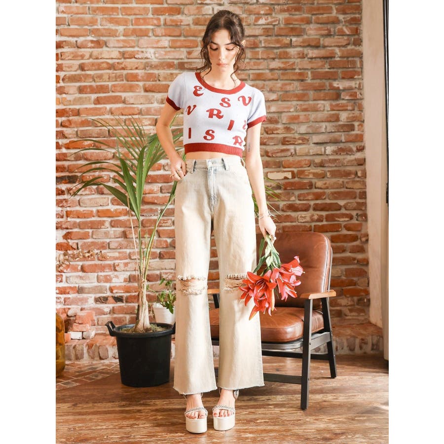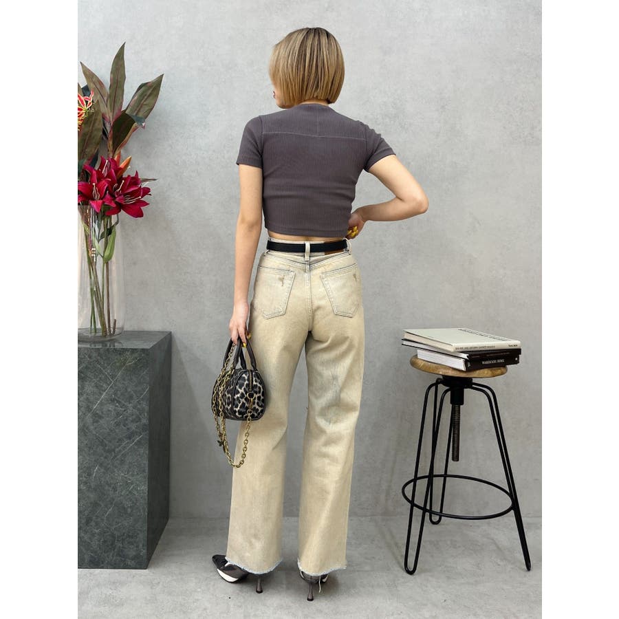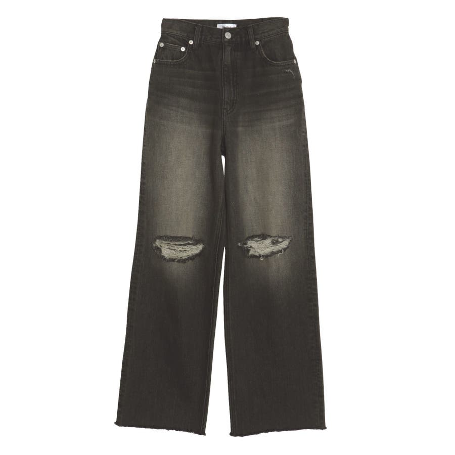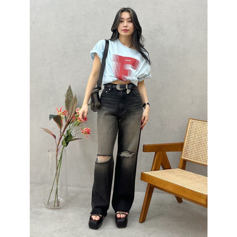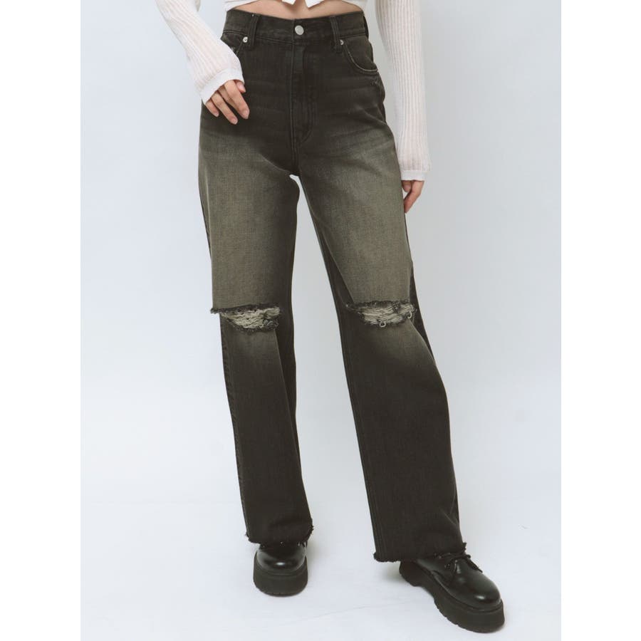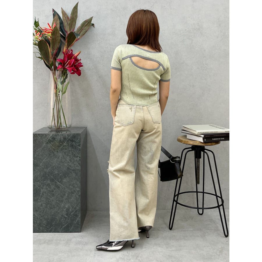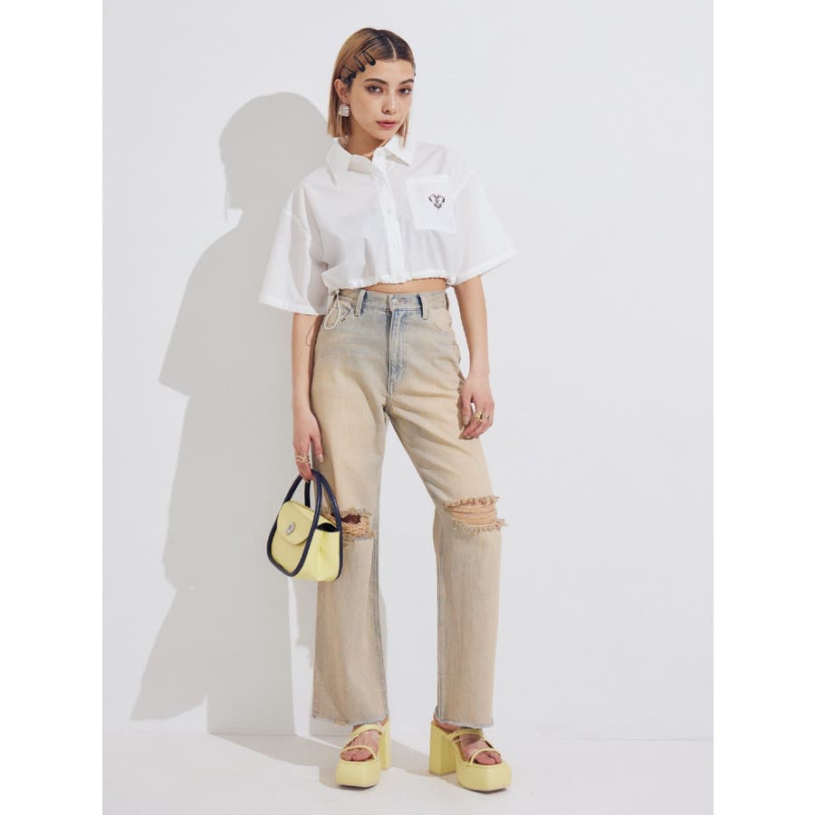 ■デザインEVRIS定番のダメージワイドデニムパンツのデザインをベースに、今季らしいグランジ感のあるヴィンテージライクな加工を施した1本です。黄味がかったオーバーダイを強めにのせており、トレンド感があります。ダメージが高めの位置に入っていることで、膝下を長く見せてくれるのが嬉しいポイント◎EVRIS(エヴリス)定番のワイドボトムのサイジングを採用しており、美脚効果抜群です。■スタイリングハイウエストなのでコンパクトなシルエットのトップス合わせがおすすめ。レース素材や、ブラウスなど女性らしい印象のアイテムとの合わせも今年らしくて◎-------------- 透け感:なし生地の厚み:普通伸縮性:なし--------------