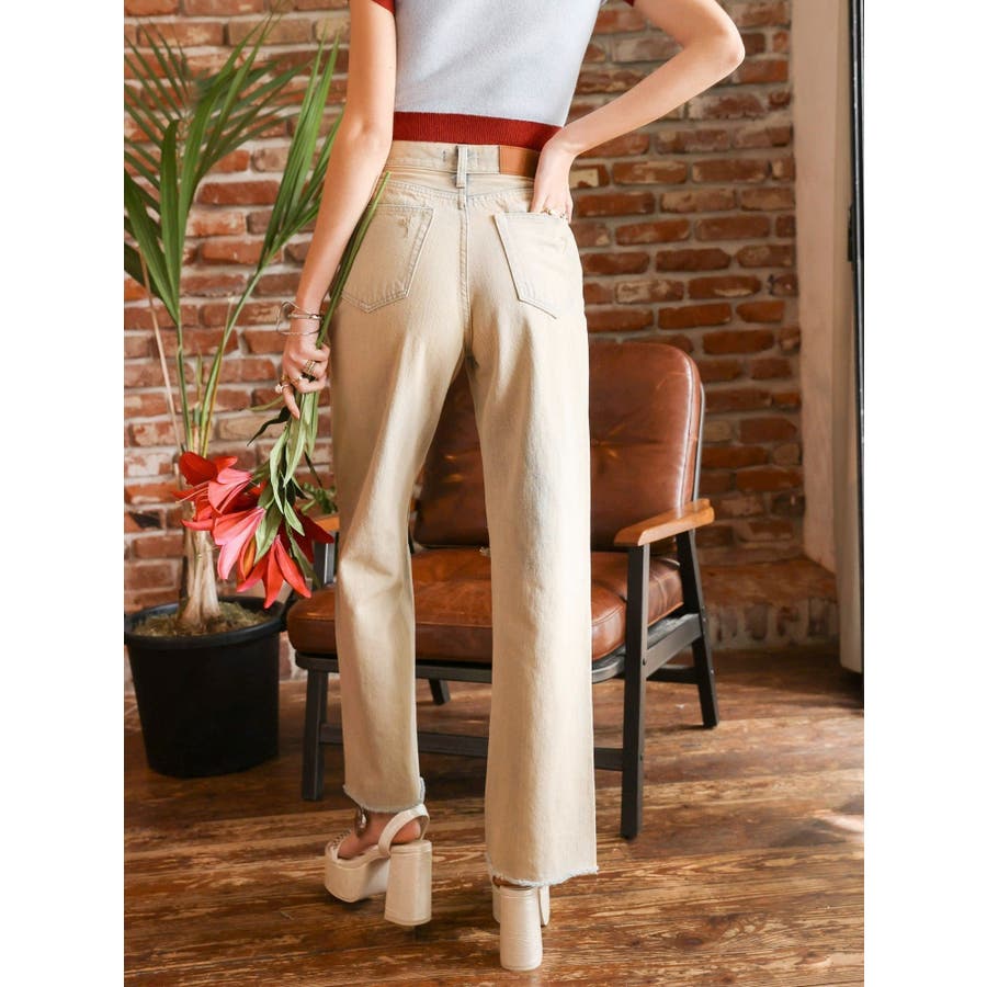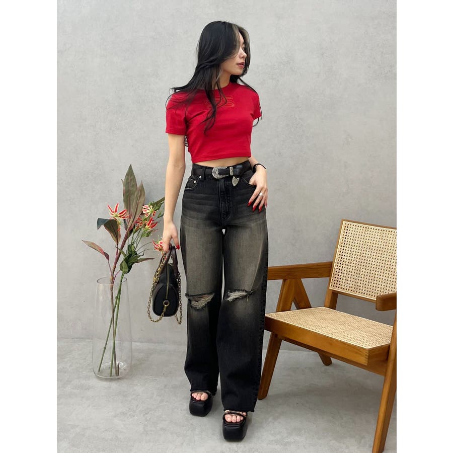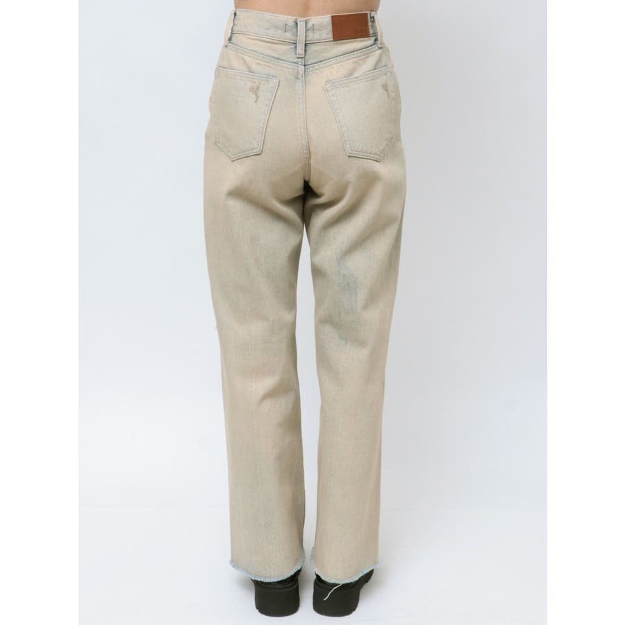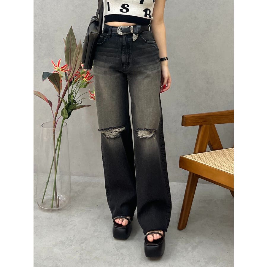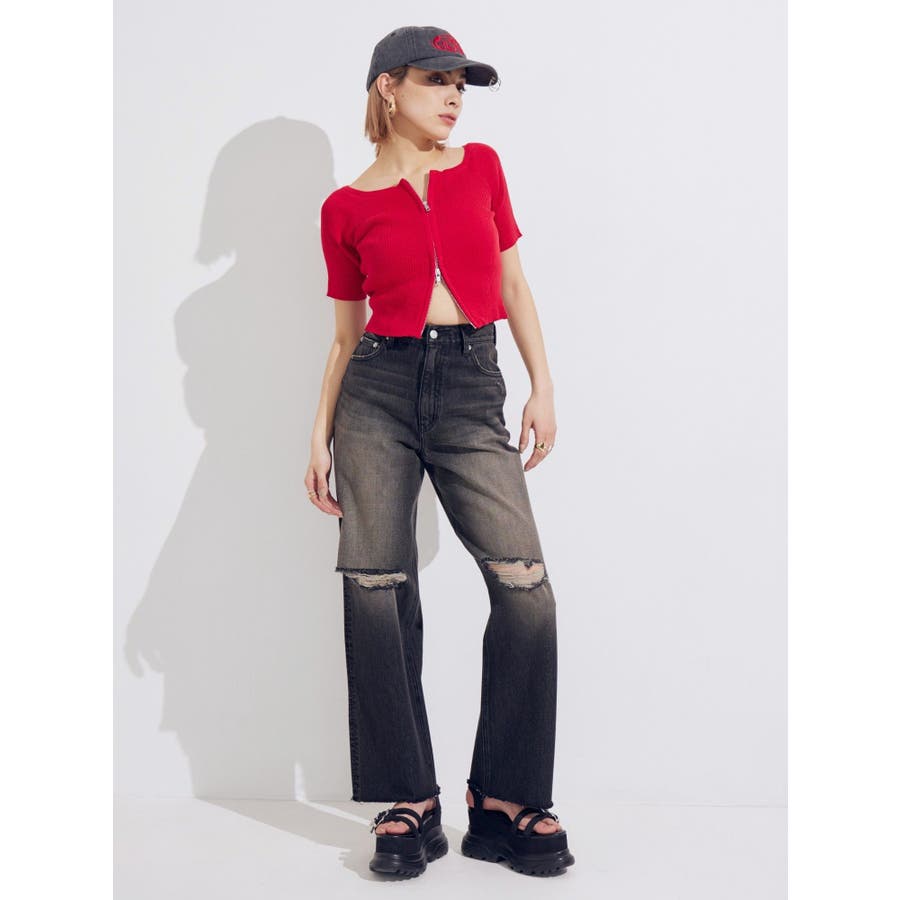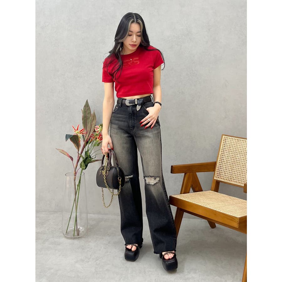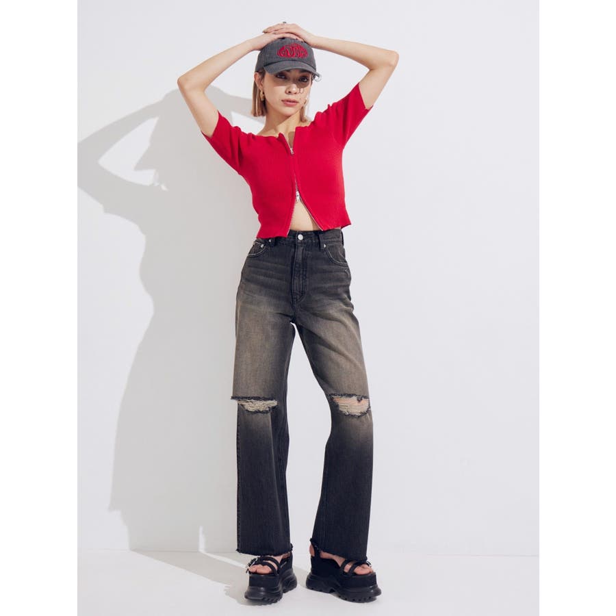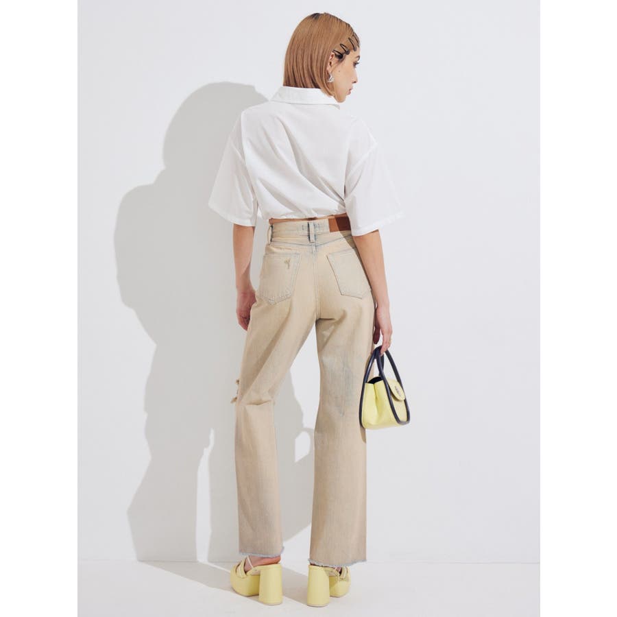 ■デザインEVRIS定番のダメージワイドデニムパンツのデザインをベースに、今季らしいグランジ感のあるヴィンテージライクな加工を施した1本です。黄味がかったオーバーダイを強めにのせており、トレンド感があります。ダメージが高めの位置に入っていることで、膝下を長く見せてくれるのが嬉しいポイント◎EVRIS(エヴリス)定番のワイドボトムのサイジングを採用しており、美脚効果抜群です。■スタイリングハイウエストなのでコンパクトなシルエットのトップス合わせがおすすめ。レース素材や、ブラウスなど女性らしい印象のアイテムとの合わせも今年らしくて◎-------------- 透け感:なし生地の厚み:普通伸縮性:なし--------------