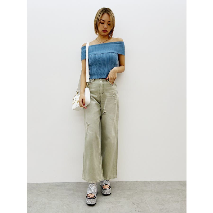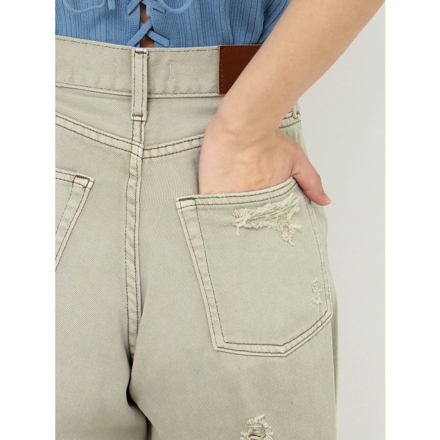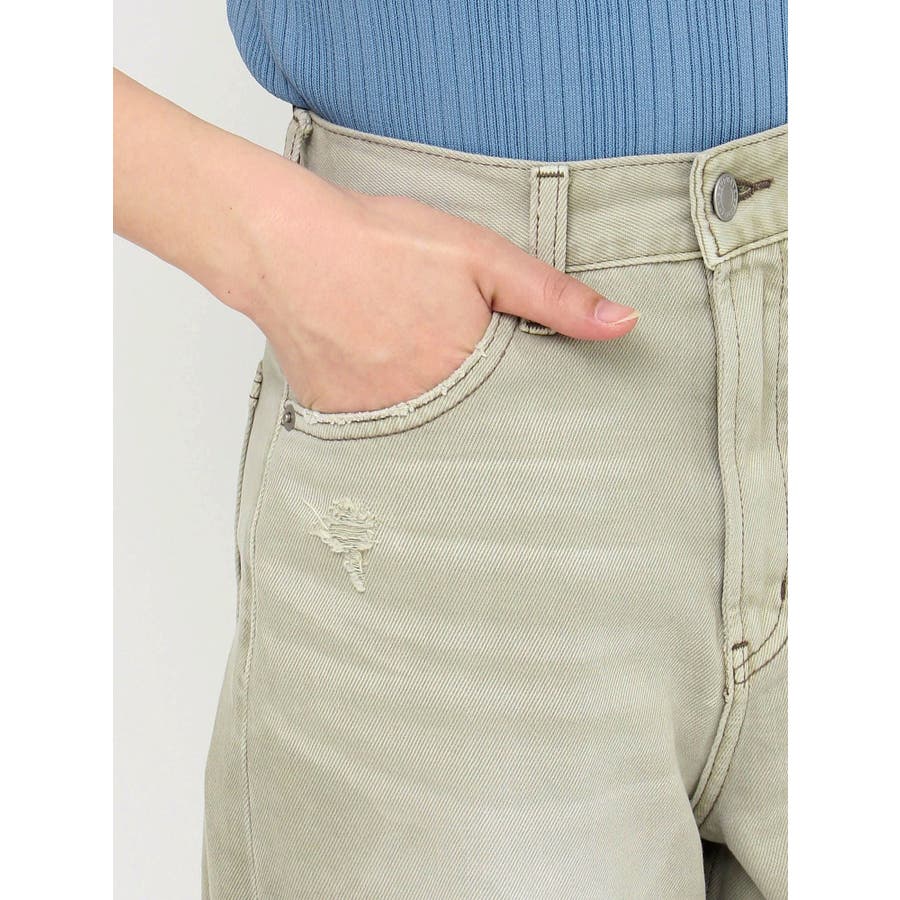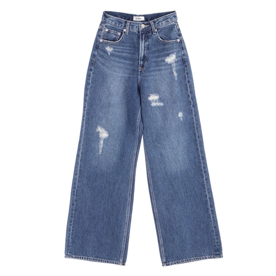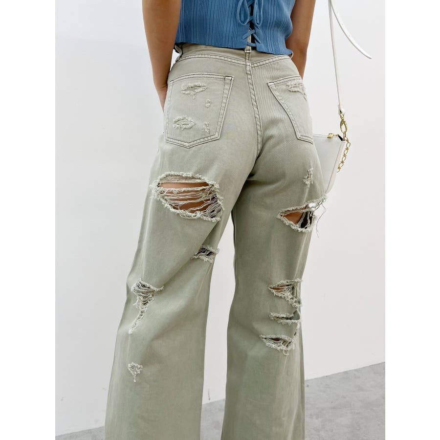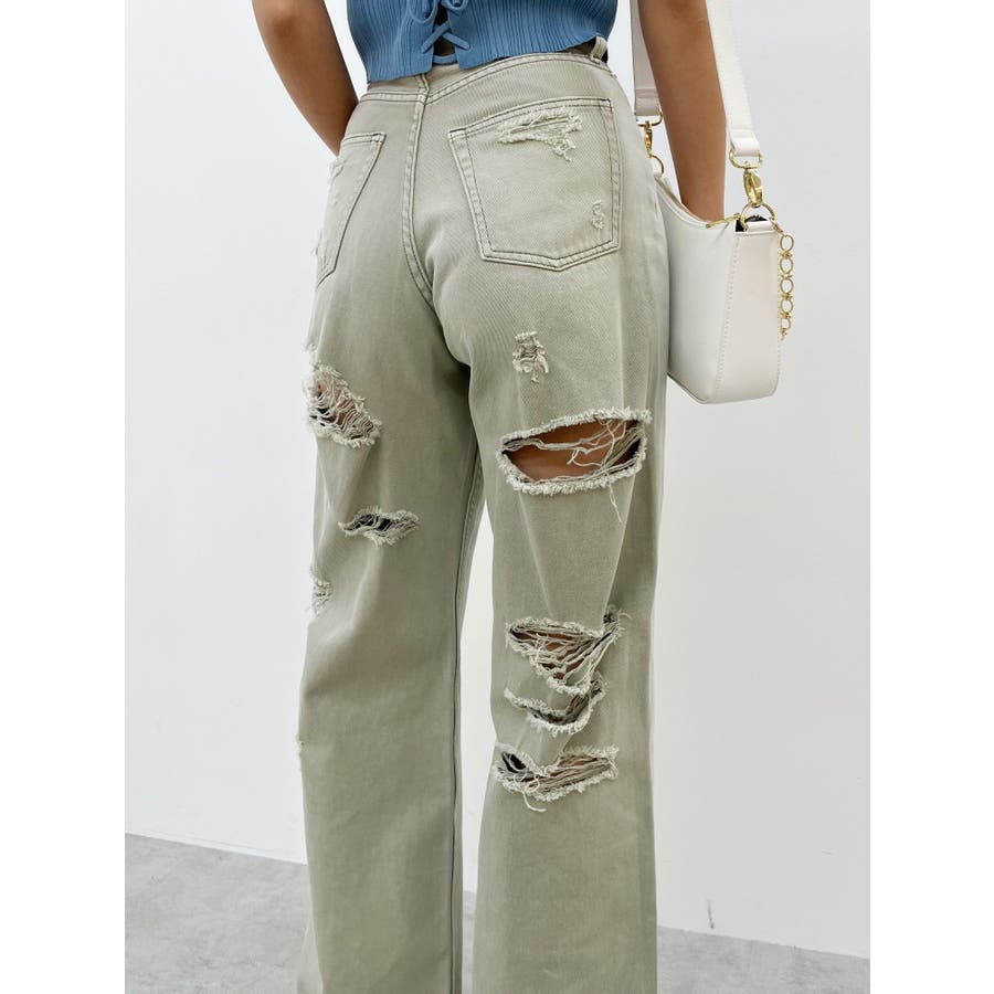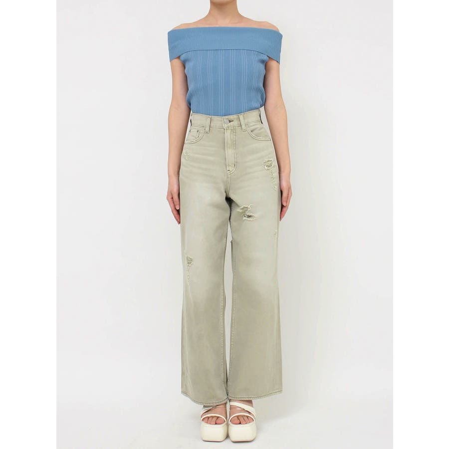 ■デザイン後ろにランダムなダメージが沢山入ったワイドデニムパンツです。カラー展開でEVRIS(エヴリス)では今までなかった薄めのグリーンの加工を取り入れており、新鮮なカラー展開がポイントです。フロントのダメージは小さくシンプルなので、幅広いコーディネートに合わせやすいアイテムです。■スタイリングゆったりとしたサイズ感なので、コンパクトなトップス合わせでメリハリのあるスタイリングがオススメです。-------------- 透け感:なし 裏地:なし 生地の厚み:普通伸縮性:なし --------------